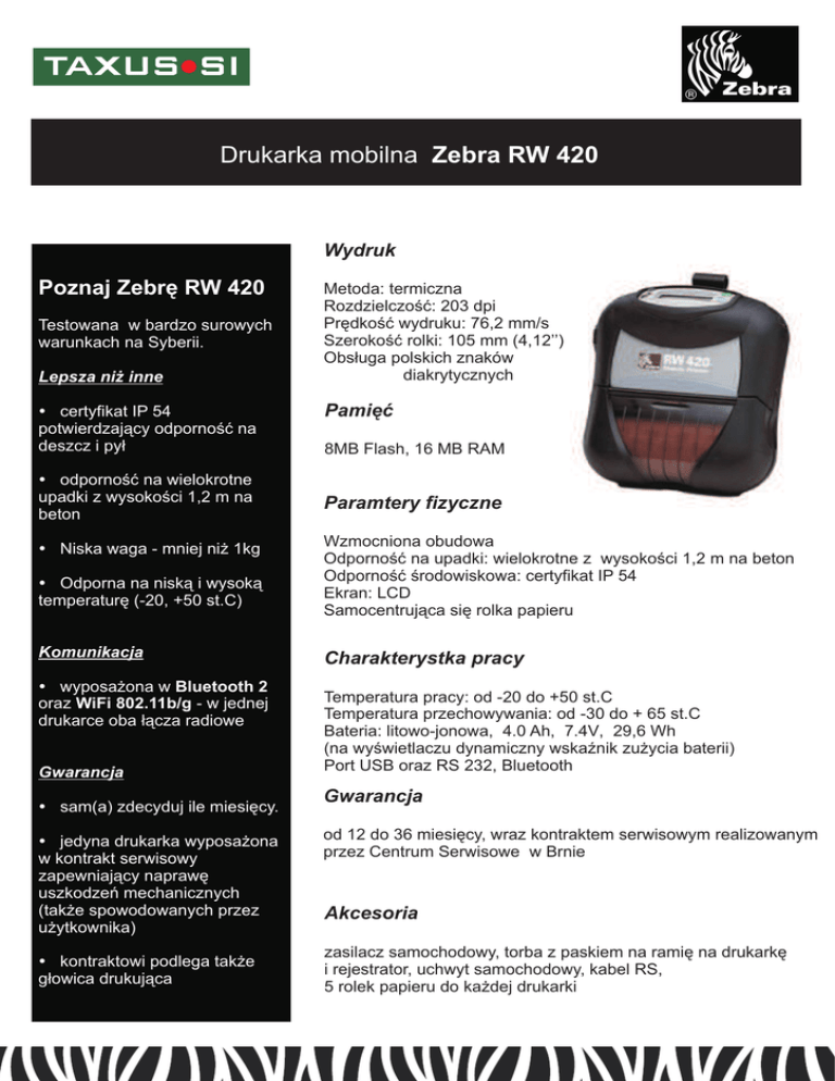 Drukarka mobilna Zebra RW 420 Wydruk Poznaj Zebrę RW 420 Testowana w bardzo surowych warunkach na Syberii. Lepsza niż inne ? certyfikat IP 54 potwierdzający odporność na deszcz i pył ? odporność na wielokrotne upadki z wysokości 1,2 m na beton ? Niska waga - mniej niż 1kg ? Odporna na niską i wysoką temperaturę (-20, +50 st.C) Komunikacja ? wyposażona w Bluetooth 2 oraz WiFi 802.11b/g - w jednej drukarce oba łącza radiowe Gwarancja ? sam(a) zdecyduj ile miesięcy. ? jedyna drukarka wyposażona w kontrakt serwisowy zapewniający naprawę uszkodzeń mechanicznych (także spowodowanych przez użytkownika) ? kontraktowi podlega także głowica drukująca Metoda: termiczna Rozdzielczość: 203 dpi Prędkość wydruku: 76,2 mm/s Szerokość rolki: 105 mm (4,12’’) Obsługa polskich znaków diakrytycznych Pamięć 8MB Flash, 16 MB RAM Paramtery fizyczne Wzmocniona obudowa Odporność na upadki: wielokrotne z wysokości 1,2 m na beton Odporność środowiskowa: certyfikat IP 54 Ekran: LCD Samocentrująca się rolka papieru Charakterystka pracy Temperatura pracy: od -20 do +50 st.C Temperatura przechowywania: od -30 do + 65 st.C Bateria: litowo-jonowa, 4.0 Ah, 7.4V, 29,6 Wh (na wyświetlaczu dynamiczny wskaźnik zużycia baterii) Port USB oraz RS 232, Bluetooth Gwarancja od 12 do 36 miesięcy, wraz kontraktem serwisowym realizowanym przez Centrum Serwisowe w Brnie Akcesoria zasilacz samochodowy, torba z paskiem na ramię na drukarkę i rejestrator, uchwyt samochodowy, kabel RS, 5 rolek papieru do każdej drukarki