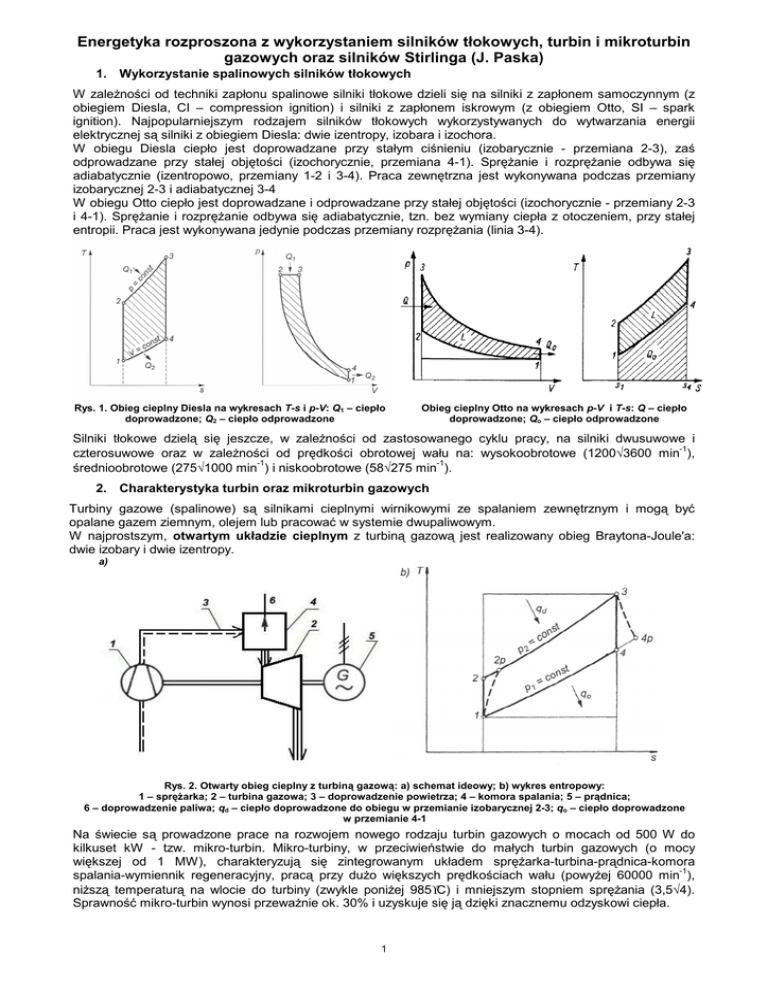 Energetyka rozproszona z wykorzystaniem silników tłokowych, turbin i mikroturbin gazowych oraz silników Stirlinga (J. Paska) 1. Wykorzystanie spalinowych silników tłokowych W zależności od techniki zapłonu spalinowe silniki tłokowe dzieli się na silniki z zapłonem samoczynnym (z obiegiem Diesla, CI – compression ignition) i silniki z zapłonem iskrowym (z obiegiem Otto, SI – spark ignition). Najpopularniejszym rodzajem silników tłokowych wykorzystywanych do wytwarzania energii elektrycznej są silniki z obiegiem Diesla: dwie izentropy, izobara i izochora. W obiegu Diesla ciepło jest doprowadzane przy stałym ciśnieniu (izobarycznie - przemiana 2-3), zaś odprowadzane przy stałej objętości (izochorycznie, przemiana 4-1). Sprężanie i rozprężanie odbywa się adiabatycznie (izentropowo, przemiany 1-2 i 3-4). Praca zewnętrzna jest wykonywana podczas przemiany izobarycznej 2-3 i adiabatycznej 3-4 W obiegu Otto ciepło jest doprowadzane i odprowadzane przy stałej objętości (izochorycznie - przemiany 2-3 i 4-1). Sprężanie i rozprężanie odbywa się adiabatycznie, tzn. bez wymiany ciepła z otoczeniem, przy stałej entropii. Praca jest wykonywana jedynie podczas przemiany rozprężania (linia 3-4). Rys. 1. Obieg cieplny Diesla na wykresach T-s i p-V: Q1 – ciepło doprowadzone; Q2 – ciepło odprowadzone Obieg cieplny Otto na wykresach p-V i T-s: Q – ciepło doprowadzone; Qo – ciepło odprowadzone Silniki tłokowe dzielą się jeszcze, w zależności od zastosowanego cyklu pracy, na silniki dwusuwowe i -1 czterosuwowe oraz w zależności od prędkości obrotowej wału na: wysokoobrotowe (1200÷3600 min ), -1 -1 średnioobrotowe (275÷1000 min ) i niskoobrotowe (58÷275 min ). 2. Charakterystyka turbin oraz mikroturbin gazowych Turbiny gazowe (spalinowe) są silnikami cieplnymi wirnikowymi ze spalaniem zewnętrznym i mogą być opalane gazem ziemnym, olejem lub pracować w systemie dwupaliwowym. W najprostszym, otwartym układzie cieplnym z turbiną gazową jest realizowany obieg Braytona-Joule'a: dwie izobary i dwie izentropy. a) Rys. 2. Otwarty obieg cieplny z turbiną gazową: a) schemat ideowy; b) wykres entropowy: 1 – sprężarka; 2 – turbina gazowa; 3 – doprowadzenie powietrza; 4 – komora spalania; 5 – prądnica; 6 – doprowadzenie paliwa; qd – ciepło doprowadzone do obiegu w przemianie izobarycznej 2-3; qo – ciepło doprowadzone w przemianie 4-1 Na świecie są prowadzone prace na rozwojem nowego rodzaju turbin gazowych o mocach od 500 W do kilkuset kW - tzw. mikro-turbin. Mikro-turbiny, w przeciwieństwie do małych turbin gazowych (o mocy większej od 1 MW), charakteryzują się zintegrowanym układem sprężarka-turbina-prądnica-komora -1 spalania-wymiennik regeneracyjny, pracą przy dużo większych prędkościach wału (powyżej 60000 min ), niższą temperaturą na wlocie do turbiny (zwykle poniżej 985°C) i mniejszym stopniem sprężania (3,5÷4). Sprawność mikro-turbin wynosi przeważnie ok. 30% i uzyskuje się ją dzięki znacznemu odzyskowi ciepła. 1 Energetyka rozproszona z wykorzystaniem silników tłokowych, turbin i mikroturbin gazowych oraz silników Stirlinga (J. Paska) Rys. 3. Zespół prądotwórczy z mikro-turbiną gazową: a) schemat ideowy, b) realizacja; 1 – zasysanie i sprężanie powietrza, 2 – podgrzewanie powietrza w wymienniku regeneracyjnym, 3 – spalanie gazu, 4 – rozprężanie spalin w mikroturbinie, 5 – oddawanie ciepła przez spaliny w wymienniku regeneracyjnym, 6 – wylot (wydmuch) spalin 3. Silniki Stirlinga Alternatywnym rozwiązaniem dla silników tłokowych ze spalaniem wewnętrznym jest silnik tłokowy ze spalaniem zewnętrznym, w którym energia jest dostarczana do czynnika roboczego ze źródła zewnętrznego (niekoniecznie z komory spalania, może to być np. skoncentrowane promieniowanie słoneczne). Takim rozwiązaniem jest silnik Stirlinga, opatentowany w 1816 roku przez duchownego szkockiego, Roberta Stirlinga. Silnik Stirlinga ma dwa tłoki w tym samym cylindrze – jeden po „gorącej” stronie, drugi po stronie „zimnej”, rozdzielone przez „krótkookresowy” magazyn ciepła zwany regeneratorem. Inaczej niż w silniku ze spalaniem wewnętrznym gaz, którym może być po prostu powietrze, ale częściej jest to azot, hel lub wodór, jest na stałe zawarty w cylindrze. Magazynem może być „sito” ceramiczne z innego porowatego materiału o odpowiedniej masie, zapewniające odpowiedni gradient temperatury między jego jedną a drugą stroną. Porowatość materiału ma zapewnić możliwość przepływu gazu w obu kierunkach. Gaz przepływając przez regenerator pobiera lub oddaje ciepło, zależnie od kierunku przepływu. Przestrzeń po jednej (lewej) stronie regeneratora jest ogrzewana przez zewnętrzne źródło ciepła (komora spalania, skoncentrowane promienie słoneczne), zaś przestrzeń po drugiej (prawej) stronie regeneratora jest chłodzona (przez radiatory lub aktywnie, co może być też wykorzystane w kogeneracji). Jest to zatem maszyna cieplna pracująca między dwoma źródłami ciepła – górnym (gorącym) i dolnym (zimnym – chłodnicą). Oczywiste jest więc, że jego sprawność jest ograniczona przez sprawność cyklu Carnota. Cykl realizowany w silniku Stirlinga (cykl Stirlinga) składa się z 4 stanów i 4 przejść między nimi (rys. 4): Stan 1 – gaz zimny (w zasadzie cały gaz jest zimny - pomijalna objętość znajduje się w porach regeneratora), maksymalna objętość, minimalne ciśnienie. Przejście 1-2 – tłok gorący pozostaje nieruchomy, podczas gdy tłok zimny przesuwa się w lewo sprężając gaz. Gaz przekazuje ciepło do chłodnicy. Idealny proces jest procesem izotermicznym, temperatura gazu pozostaje stała TC. Stan 2 – sprężony gaz przekazuje ciepło do chłodnicy, minimalna objętość. 2 Energetyka rozproszona z wykorzystaniem silników tłokowych, turbin i mikroturbin gazowych oraz silników Stirlinga (J. Paska) Rys