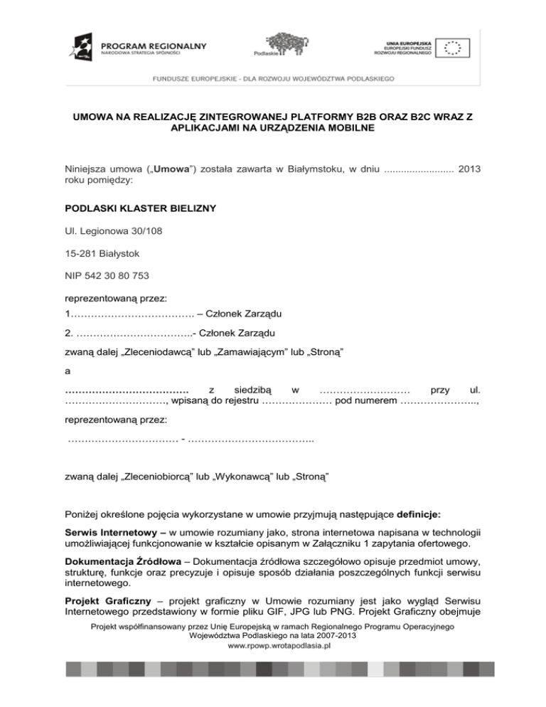 UMOWA NA REALIZACJĘ ZINTEGROWANEJ PLATFORMY B2B ORAZ B2C WRAZ Z APLIKACJAMI NA URZĄDZENIA MOBILNE Niniejsza umowa („Umowa”) została zawarta w Białymstoku, w dniu ......................... 2013 roku pomiędzy: PODLASKI KLASTER BIELIZNY Ul. Legionowa 30/108 15-281 Białystok NIP 542 30 80 753 reprezentowaną przez: 1………………………………. – Członek Zarządu 2. ……………………………..- Członek Zarządu zwaną dalej „Zleceniodawcą” lub „Zamawiającym” lub „Stroną” a ………………………………. z siedzibą w ……………………… przy ul. …………………………, wpisaną do rejestru ………………… pod numerem ………………….., reprezentowaną przez: …………………………… - ……………………………….. zwaną dalej „Zleceniobiorcą” lub „Wykonawcą” lub „Stroną” Poniżej określone pojęcia wykorzystane w umowie przyjmują następujące definicje: Serwis Internetowy – w umowie rozumiany jako, strona internetowa napisana w technologii umożliwiającej funkcjonowanie w kształcie opisanym w Załączniku 1 zapytania ofertowego. Dokumentacja Źródłowa – Dokumentacja źródłowa szczegółowo opisuje przedmiot umowy, strukturę, funkcje oraz precyzuje i opisuje sposób działania poszczególnych funkcji serwisu internetowego. Projekt Graficzny – projekt graficzny w Umowie rozumiany jest jako wygląd Serwisu Internetowego przedstawiony w formie pliku GIF, JPG lub PNG. Projekt Graficzny obejmuje Projekt współfinansowany przez Unię Europejską w ramach Regionalnego Programu Operacyjnego Województwa Podlaskiego na lata 2007-2013 wszystkie elementy graficzne w tym strony i podstrony zgodnie z funkcjonalnością określoną w Specyfikacji Wstępnej i Dokumentacji Źródłowej. Implementacja i Oprogramowanie – czynności programistyczne polegające na zaprogramowaniu od nowa lub dostosowaniu, ewentualnie rozbudowie silnika/silników serwisu internetowego do wymagań Projektu Graficznego i wymagań opisanych w Dokumentacji Źródłowej. Modyfikacja Założeń Dokumentacji Źródłowej – zmiana wcześniej uzgodnionych i zaakceptowanych przez Strony założeń do tworzonego Serwisu Internetowego. Błąd – ukryta wada systemu, która i funkcjonowanie Serwisu internetowego. mimo jej wystąpienia umożliwia działanie Awaria – błąd, którego wystąpienie uniemożliwia działanie i funkcjonowanie Serwisu Internetowego. § 1. Przedmiot Umowy 1. Zleceniodawca zleca, a Zleceniobiorca, za wynagrodzeniem określonym w niniejszej Umowie, zobowiązuje się wykonać następujące prace: 1.1 Analiza Specyfikacji Wstępnej, Grafik i Stworzenie Dokumentacji Źródłowej opisującej szczegółowo wygląd, sposób działania i zakres wykonania Serwisu Internetowego. 1.2 Dokonanie Implementacji i Oprogramowania Serwisu Internetowego zgodnie z Dokumentacją Źródłową. 2. Poszczególne składowe przedmiotu Umowy wymienione w punkcie 1 powyżej będą realizowane w etapach i zgodnie z harmonogramem określonym w paragrafie 4. § 2. Oświadczenia Stron i zasady wykonania przedmiotu Umowy. 1. Zleceniobiorca oświadcza, iż posiada niezbędną wiedzę, umiejętności i doświadczenie dla wykonania przedmiotu Umowy. 2. Zleceniobiorca oświadcza, iż wykona przedmiot Umowy z należytą starannością i na poziomie nie odbiegającym od dobrych praktyk rynkowych. 3. Zleceniodawca oświadcza, że celem zamierzonym jest wykonanie i wdrożenie przedmiotu Umowy w terminie określonym w Umowie. Zleceniobiorca oświadcza, iż cel ten jest mu znany. 4. W ramach realizacji Umowy Zleceniobiorca zobowiązuje się do: a) wykonania analizy wymagań niezbędnych do realizacji Umowy; b) zapewnienia wykwalifikowanych pracowników stosownie do potrzeb wynikających z zakresu i terminu wykonania Umowy; Projekt współfinansowany przez Unię Europejską w ramach Regionalnego Programu Operacyjnego Województwa Podlaskiego na lata 2007-2013 c) zapewnienia nadzoru nad wykonaniem Umowy; d) niezwłocznego informowania o wszelkich okolicznościach mogących mieć wpływ na prawidłowość wykonania Umowy, w tym w szczególności o wykrytych wadach w zakresie opisu funkcjonalności oraz środowiska pracy Systemu określonych przez Zleceniobiorcę; e) niezwłocznego informowania o okolicznościach niedotrzymanie terminu realizacji Umowy; f) mogących spowodować przestrzegania zasad i przepisów BHP, a także regulacji porządkowych obowiązujących u Zleceniodawcy i u osób trzecich, u których realizowane będzie Umowa. 5. Zleceniobiorca nie może powierzyć wykonania przedmiotu Umowy osobie trzeciej bez uzyskania uprzedniej pisemnej zgody Zleceniodawcy. 6. W przypadku zgody ze strony Zleceniodawcy na realizację części przedmiotu Umowy przez osoby trzecie, Zleceniobiorca odpowiada za działania lub zaniechania osób trzecich jak za działania lub zaniechania własne. 7. Przy wykonaniu Umowy Zleceniodawca zapewni Wykonawcy niezbędną pomoc, dostęp do pomieszczeń i sprzętu, w przypadku, gdy będzie to uzasadnione dla wykonania przez Zleceniobiorcę zobowiązań wynikających z niniejszego Umowy. 8. Zleceniodawca oświadcza, że w celu umożliwienia Wykonawcy wykonania Umowy, zapewni kontakt z osobami odpowiedzialnymi za realizację Umowy po stronie Zleceniodawcy. § 3. Dokumentacja źródłowa 1. W ramach wykonania przedmiotu niniejszej Umowy Zleceniobiorca przygotuje Dokumentację Źródłową zgodnie z założeniami określonymi w niniejszym paragrafie umowy. 2. Dokumentacja Źródłowa szczegółowo określi dokładny zakres prac programistycznych wykonywanych w ramach niniejszej umowy przez Zleceniobiorcę. 3. Dokumentacja Źródłowa zostanie opracowana na podstawie Specyfikacji wstępnej stanowiącej załącznik numer 1 do zapytania ofertowego oraz umowy. Specyfikacja wstępna określa wyjściowy, minimalny zakres prac programistycznych dla wykonania przedmiotu Umowy. 4. Dokumentacja Źródłowa będ
