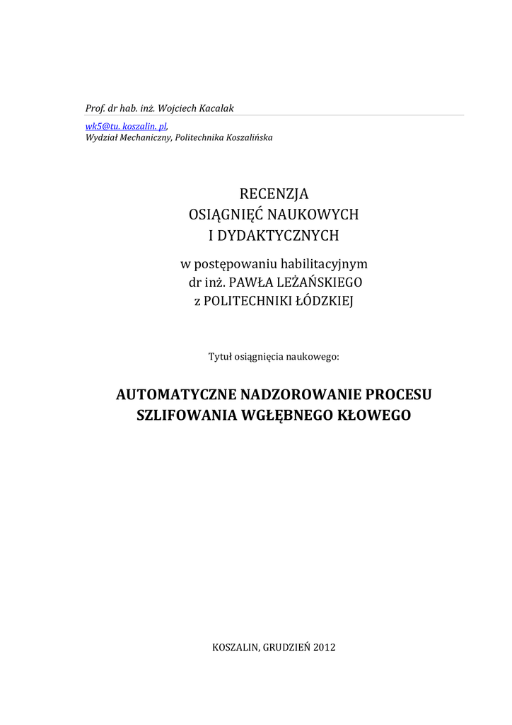 Prof. dr hab. inż. Wojciech Kacalak wk5@tu. koszalin. pl, Wydział Mechaniczny, Politechnika Koszalińska RECENZJA OSIĄGNIĘĆ NAUKOWYCH I DYDAKTYCZNYCH w postępowaniu habilitacyjnym dr inż. PAWŁA LEŻAŃSKIEGO z POLITECHNIKI ŁÓDZKIEJ Tytuł osiągnięcia naukowego: AUTOMATYCZNE NADZOROWANIE PROCESU SZLIFOWANIA WGŁĘBNEGO KŁOWEGO KOSZALIN, GRUDZIEŃ 2012 Recenzja pracy oraz dorobku naukowego i dydaktycznego dr inż. Pawła Leżańskiego z Politechniki Łódzkiej Prof. dr hab. inż. Wojciech Kacalak Politechnika Koszalińska 2 RECENZJA OSIĄGNIĘĆ NAUKOWYCH I DYDAKTYCZNYCH w postępowaniu habilitacyjnym dr inż. PAWŁA LEŻAŃSKIEGO z POLITECHNIKI ŁÓDZKIEJ Tytuł osiągnięcia naukowego: AUTOMATYCZNE NADZOROWANIE PROCESU SZLIFOWANIA WGŁĘBNEGO KŁOWEGO Opinię o dorobku naukowym i dydaktycznym dr inż. Pawła Leżańskiego przestawiam na podstawie autoreferatu, opracowanego starannie i wyczerpująco, monografii, stanowiącej wskazane osiągnięcie naukowe, zbioru publikacji oraz wielu prezentacji wyników badań podczas konferencji naukowych. 1. CHARAKTERYSTYKA PRACY NAUKOWEJ KANDYDATA 1.1. Przebieg pracy zawodowej Kandydat uzyskał tytuł mgr inż. mechanika o specjalności obrabiarki, narzędzia i technologia budowy maszyn w Politechnice Łódzkiej na Wydziale Mechanicznym w 1974 roku. Po studiach rozpoczął pracę w macierzystej Uczelni. Już na początku pracy naukowej obrał ważny dla rozwoju technologii kierunek badawczy, obejmujący problemy automatyzacji procesów obróbki, sterowania numerycznego obrabiarek, a później zagadnienia sterowania adaptacyjnego w procesach szlifowania. Osiągnięcia naukowe z tego okresu zostały podsumowane w zakończonej w 1983 roku pracy doktorskiej nt.: „Model procesu czołowego szlifowania płaszczyzn na szlifierce ze stołem obrotowym w aspekcie zastosowania sterowania adaptacyjnego”. W 1984 roku został adiunktem w Zakładzie Automatyzacji Obrabiarek (obecnie Zakład Robotyki i Automatyzacji) w Instytucie Obrabiarek i Technologii Budowy Maszyn, na Wydziale Mechanicznym Politechniki Łódzkiej. Kandydat w okresie od 2001 roku do 2004 roku pełnił obowiązki kierownika Zakładu Automatyzacji Obrabiarek. Recenzja pracy oraz dorobku naukowego i dydaktycznego dr inż. Pawła Leżańskiego z Politechniki Łódzkiej 1.2. Rozwój naukowy 3 Po uzyskaniu stopnia naukowego doktora Kandydat uzyskał stypendium Fulbrigh’a i staż w Stanach Zjednoczonych, gdzie prowadził w latach 1987 i 1988 prace badawcze w Arizona State University i University of California w Berkeley. W pierwszym okresie pobytu, obejmującym 15 miesięcy, pracował w zespole prof. M. C. Shaw w Arizona State University. Tematyka badawcza dotyczyła pól temperatur w ostrzach skrawających podczas frezowania z dużymi prędkościami skrawania. W drugim okresie stażu dr inż. Paweł Leżański zajmował się zastosowaniami metod sztucznej inteligencji i ich wykorzystaniem do monitorowania i diagnostyki procesów szlifowania w zespole prof. D. A. Dornfeld w Univesity of California w Berkeley. Wówczas Kandydat rozpoczął prace nad zastosowaniem sygnałów emisji akustycznej do monitorowania i diagnostyki procesów skrawania, z wykorzystaniem sztucznych sieci neuronowych do identyfikacji stanów procesu. Po powrocie do Politechniki Łódzkiej Autor zrealizował ważne zadania naukowe i rozwiązał wiele problemów, z których do ważniejszych zaliczam: 1. Zbudowanie stanowiska do badań nadzorowania procesu szlifowania wałków, wyposażonego w silniki krokowe, bezluzową przekładnią ślimakową i układy cyfrowego sterowania prędkości i położenia wrzeciennika ściernicy oraz układy pomiaru składowych siły szlifowania, drgań, emisji akustycznej oraz przyrząd do aktywnej kontroli średnicy i błędów kształtu szlifowanego przedmiotu. Następnie do układu badawczego dołączono bezprzewodowy czujnik emisji akustycznej, układy pomiaru zarysu profilu czynnej powierzchni ściernicy oraz autorskie algorytmy i pakiet programów do przetwarzania danych. 2. Określenie struktur funkcjonalnych systemu nadzorowania, zależnych od rodzaju funkcji, które przewidziano do realizacji i od metod modelowania oraz klasyfikacji stanów procesu. Powstał inteligentny, elastyczny system, konfigurowany według zadań, który zapewniał monitorowanie i diagnostykę procesu szlifowania wałków. 3. Zapewnienie konfigurowalności systemu, który umożliwia ekstrakcję cech sygnałów pomiarowych oraz posiada zdolność selekcji cech najbardziej istotnych dla oceny stanu procesu, z uwzględnieniem, iż funkcje realizowane przez system są zróżnicowane dla kolejnych faz cyklu szlifowania. 4. Zbudowanie wielopoziomowego systemu monitorowania, diagnostyki i sterowania, w tym w warunkach sterowania adaptacyjnego i z realizowaną optymalizacją początkowych wartości parametrów procesu. 5. Opracowanie hybrydowego systemu optymalizacji procesu (powstał podczas realizacji projektu kierowanego przez Kandydata), w którym wykorzystuje się cztery źródła wiedzy. Pierwszym jest baza wiedzy o procesie szlifowania wałków, przydatna do wyznaczenia początkowych parametrów procesu. Drugim jest nauczona sieć neuronowa do optymalizacji cyklu szlifowania ze względu na wskaźniki jakości przedmiotu i wydajność obróbki. Trzecim źródłem wiedzy jest zbiór algorytmów do sterowania adaptacyjnego. Czwartym jest wie- Recenzja pracy oraz dorobku naukowego i dydaktycznego dr inż. Pawła Leżańskiego z Politechniki Łódzkiej 4 dza eksperta, wykorzystywana do weryfikacja warunków i parametrów procesu. 6. Opracowanie teoretycznych i doświadczalnych podstaw nadzorowania procesu szlifowania wałków z zastosowaniem sieci neuronowych i logiki rozmytej. Sieć neuronowa realizuje zadanie selekcji cech sygnałów pomiarowych, a moduł neuronowo-rozmyty jest wykorzystywany do klasyfikacji stanu zużycia ściernicy za pomocą algorytmu wnioskowania rozmytego. 7. Wykazanie, że w badanych pr