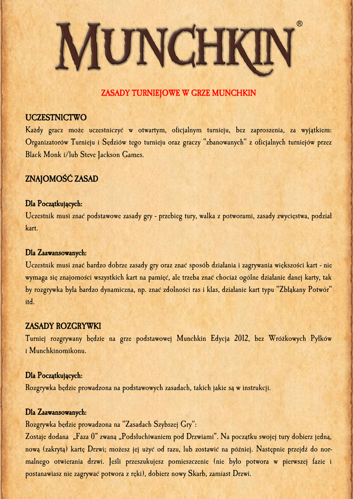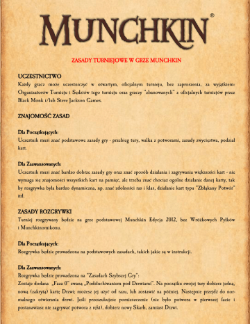 ZASADY TURNIEJOWE W GRZE MUNCHKIN UCZESTNICTWO Każdy gracz może uczestniczyć w otwartym, oficjalnym turnieju, bez zaproszenia, za wyjątkiem: Organizatorów Turnieju i Sędziów tego turnieju oraz graczy "zbanowanych" z oficjalnych turniejów przez Black Monk i/lub Steve Jackson Games. ZNAJOMOŚĆ ZASAD Dla Początkujących: Uczestnik musi znać podstawowe zasady gry - przebieg tury, walka z potworami, zasady zwycięstwa, podział kart. Dla Zaawansowanych: Uczestnik musi znać bardzo dobrze zasady gry oraz znać sposób działania i zagrywania większości kart - nie wymaga się znajomości wszystkich kart na pamięć, ale trzeba znać chociaż ogólne działanie danej karty, tak by rozgrywka była bardzo dynamiczna, np. znać zdolności ras i klas, działanie kart typu "Zbłąkany Potwór" itd. ZASADY ROZGRYWKI Turniej rozgrywany będzie na grze podstawowej Munchkin Edycja 2012, bez Wróżkowych Pyłków i Munchkinomikonu. Dla Początkujących: Rozgrywka będzie prowadzona na podstawowych zasadach, takich jakie są w instrukcji. Dla Zaawansowanych: Rozgrywka będzie prowadzona na "Zasadach Szybszej Gry": Zostaje dodana „Faza 0” zwaną „Podsłuchiwaniem pod Drzwiami”. Na początku swojej tury dobierz jedną, nową (zakrytą) kartę Drzwi; możesz jej użyć od razu, lub zostawić na później. Następnie przejdź do normalnego otwierania drzwi. Jeśli przeszukujesz pomieszczenie (nie było potwora w pierwszej fazie i postanawiasz nie zagrywać potwora z ręki), dobierz nowy Skarb, zamiast Drzwi. GADŻETY Ilość Munchkinowych gadżetów ograniczona. Można mieć o jeden gadżet więcej niż osoba przy stoliku, która posiada ich najmniej. Gadżety muszą być zadeklarowane i wyjaśnione przed grą pozostałym uczestnikom przy stole. Zakładki liczą się jako jeden gadżet (np. 8 różnych zakładek to 1 gadżet), ale dalej obowiązuje limit użyć. Między rundami można zmieniać gadżety. Zmiany w działaniu gadżetów: 1. Oficjalna Zakładka Mrocznej Podłości - ZBANOWANA 2. Niebieska Moneta - po użyciu Niebieskiej Monety, należy oddać ją graczowi o najniższym poziomie. Moneta może być użyta przez gracza który ją otrzymał, pod warunkiem, że nie użył już innej monety. NARUSZENIA ZASAD TURNIEJU – OSZUSTWA Oszukiwanie jest niedopuszczalne. Tak, wiemy jak absurdalnie to brzmi. Ale turniej to turniej, więc Poniżej znajdziecie wskazówki na temat niedopuszczalnych zachowań. Organizatorzy zapoznają się ze wszystkimi podejrzeniami lub wykrytymi przypadkami oszustw i mają prawo stosować kary stosownie do przewinienia. Do oszustw zalicza się m.in. poniższe przewinienia (z zastrzeżeniem, że lista nie jest kompletna): wprowadzanie w błąd odnośnie zasad, tekstów i opisów na kartach lub zasad. dobieranie dodatkowych kart manipulacja dobieranymi kartami, ustawianie kart w talii ukrywanie kart z ręki lub ze stołu, wprowadzanie w błąd odnośnie posiadanych kart nieuzasadnione zmiany lub modyfikacje poziomu postaci wprowadzanie do gry kart spoza danej talii wymienianie się kartami w niedozwolony sposób kradzież kart innemu graczowi w sposób inny niż dozwolony KARY Upomnienia, obniżenie poziomu, a w poważniejszych przypadkach, usunięcie z danej tury lub całego turnieju.