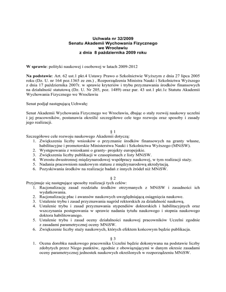 Uchwała Senatu AWF Wrocław nr 32 z 8 października 2009 r.