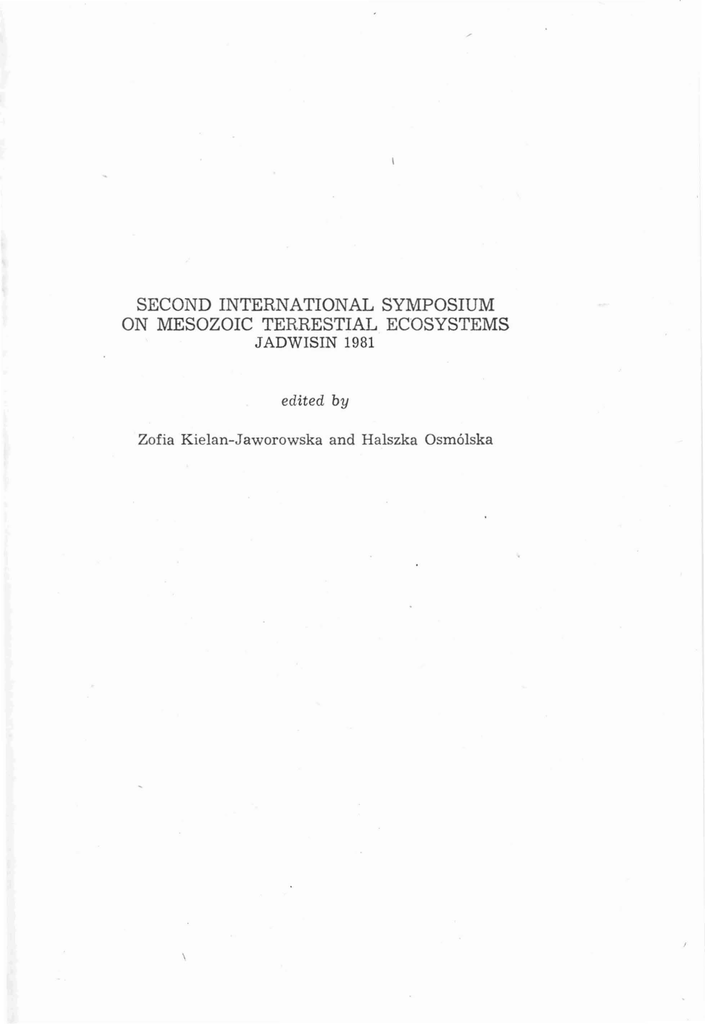 SECOND INTERNATIONAL SYMPOSIUM ON MESOZOIC TERRESTIAL ECOSYSTEMS JADWISIN 1981 edited by Zofia Ki elan-Jaworowska and Halszka Osm61ska PREFACE The p u rp ose of th e sy mpos ia on Mesozoic T errestrial Ecosy s t em s is t o prom ot e th e exc ha nge of id ea s a b ou t the evolu ti on of lif e in te rrestrial enviro n men ts du ri ng th e 150 milli on years of t he Mes ozoic. The t h eme set f or t h e sy mposia, is a b road one , of interest t o v e r t eb r at e a nd in v e r teb r a t e pal eon t ologists, ana tom ists, paleo bo ta nis ts , paleoecologis ts and geolo gis ts. The Firs t S ym p osium on Me sozoic T erre st ri al Eco syste ms (E cosy st ern es Contin en ta ux du Mesozoi q u e, Premiere table ronde in te rn ati on a le ) was h eld in Pa r is, in S eptember 1978. The p apers p r esented at the Symp os iu m w ere published in Me moires d e la S oci ete Geolog iq ue d e F r an ce, N.S. LIX, 1980. The S e con d S ymp osium of th is se r ies , organized by th e In s ti t ute of Paleob iolo gy a n d Mu seu m of Ear t h of the Poli sh Aca d em y of S cien ces was h eld f r om 14-19 S e ptembe r 1981 a t J adwisin n ea r W a rs a w . It was att ende d b y 47 scien ti s ts f rom the f ollowing co u n t rie s : Austr al ia , Ca nada, C zec ho slovakia, D enm a r k , F ed eral R epu blic of G ermany, F rance, G e r m an De m ocra ti c Rep ub lic , G r ea t Britain, P e ople's R ep ublic of China , P ol and, Ro ma n ia an d Un ited S tat es of A merica. Out of thirty seven com m u n ica ti ons p r ese n ted at the S ym p os ium, twenty se ven . a re publish ed in th e present v olume. It h a s been f ores een th at th e T h ird Symposiu m w ill be orga n ize d in 'I'iibingen in 1984. W e w ould like to th an k D r . P . D od son (Univers ity of Pe nnsy lvania , Philad elphia) , P r of. W . A. Cl emens (Un iv ers ity of C a lif orn ia, Ber kel e y) and Dr. Jad wiga Karcz ewska (Institu t e of P a le obi ol ogy , W a rs a w) for h elpi n g us in th e ed it orial w o rk. Editors L IST OF PARTICIPANTS OF THE SEC OND INTERNATIONAL SYMPOSIUM ON MESOZOIC TERRESTIAL ECOSYSTEMS JADWISIN, 19B1 Archi ba ld David J. , Ne w H aven Battail Bernard, Paris Bensko Julie, Flushing Borsu k- Bialyn icka Magdalena, Wa rsza w a Buffeteau t Eric, Paris Clemens William A., Berkeley Cu rrie Philip J. , Edmonton Dodson Peter, Philadelphia El zanowsk i And r zej, Wa rsza wa Evans Susa n E., Lond on Fe is t Mo n ique, Montpellier G riffiths Mervyn, Deakin, Canber r a Grigoresc u Dan, Bucharest Hartenberger J ean-Louis, Montpellier Haubold Hartm u t, Halle Hoch Ella, Kebenhavn H owgate Michael E., L ondon Karczewska J a dwi ga, Warszawa Ke r ma ck Doris M., L ond on Ke r ma ck Kenneth A., L on d on Kie la n- J aw or ow ska Zofia, Wa rsza wa Kre bs Bernard, West Berlin Krebs E li sabeth, West Berlin Kva cek Zlatko, Praha Lees P a t ri ci a M., Lond on McIn nes Dal e, Edmonton Maryansk a T eresa, War szawa Me llet James S., New York Mierzejewska G r a zyna, Warszawa Musset t Fra nces, London Os m6 lska Halszka, Warsza wa Pa ul Gregory S., Baltimore Pond Ca roline M., Milton Keynes Rey man6wna Ma ri a, K rak6w Russell Don ald E., Paris Ryszkiew icz Marcin, Wa rszawa Sigogneau -R ussell Deni s, Paris Sulimski Andrze], Wa rsza w a Su T etsao, Be ijing Taquet Phil ip pe, P a ri s Tarsitano Sa muel, Flushing Watson J oan, Manc hester Westphal Frank, T iibin gen Wibl e Joh n R, Du r ha m Wild Rupert, Ludwigsburg Zhao Xijin (Chao Shichin), Bei jin g Ziernbin sk a - Tworzydlo Maria, Warszawa ORGANIZING COMMI TTEE : Zofia Ki elan-Jaworow sk a (chairman), Teresa Ma ryans ka , Halszka Os m olska, Maria Reyman6 wna, Maria Ziembtnska-Tworzydlo. LIST OF COMMUNICATIONS PRESENTED AT THE SYMP OSIUM ALVIN, K. L.: The importance of Cheirolepiaceae in Mesozoic environments. ARCH IBALD, J . D.: The structure of the Cretac eou s-Tertiary mammal radation in North America . BATTAIL, B.: The go m ph odo n t cynod onts, BORSUK-BIALYNICKA, M.: The Late Cr eta ce ou s stage of evolu tio n of t he platynotan li zards. BUFFE TAUT , E.: Me sozoic verteb rate lo ca lities in Thail a nd. CL EMENS, W. A.: Mammalia n ev olu ti on du ring the C reta ce ous-Tertia ry transition ; ev id en ce f or gradual, nonca ta st r op h ic pa t t erns of biot ic change. CURRIE, P . J. : Dinosaur f ootprints of the P ea ce Riv er Canyon. DODSON, P .: P a le oec ol ogy of the Oldman Formation (Upper Cret ace ous) Dinosaur P rovin cial Park, Al berta - in terpreted b y m icrofaunal an a - , 6 ly sis. ELZANOWSKI , A. : Ecolog ica l r ev ie w of th e Cret a ceou s birds. F EIST, M.: Bi ostratigra phical signi ficance of the ch a rop hytes in th e Garumnian (Ma astri ch ti a n P al e ocen e) of th e T r emp a rea (Province of Le r ida , Spain). GRIFFITHS, M.: La ct ati on in Monot remata and spec ula tions co nce rn in g th e na tu r e of la ctation in Cret a ceo us Multitubercula ta. GRIGORESCU, D.: S tra ti graph y an d pa leoecology of the d inosaurian beds from Hateg basin (Transylvania ). HAUBOLD, H.: Archosaur evi d en ce in the Buntsandstein. H ECHT, M. K. a n d TARSITANO, S .: The pa le obiological sign ificance of Archaeopt er yx. HILL, C. R. : Meg afossil plants a n d initiation of flu vi o-deltai c se d imenta t ion in th e Middle Ju ra ssic (Aa lenian) of Yorkshire , England . K AR CZEWSK A, J. and ZIEMBINSKA-TWORZYDLO, M.: Upper Cretaceous Charophy t a as semblages from the Nemegt Ba sin, Gobi Desert, Mongolia. KERMACK, K. A. and MUSSETT, F.: The ear in mammal-like r ep tiles an d early mammals. KIELANJAWOROWSKA, Z.: E ndocr anial casts of Cr etaceous multituberculates - prelimin a r y note. KVACEK, Z.: Cuticular studies in a n gios pe r m s of Bohemian Cenomanian. LESS , P . M. a n d MILLS, R: A q ua s i- m a mmal fro m Lesotho. LIU HSIENT'I NG and SU TETSAO : F ossil amiids of China and th eir biostratig r aphical sign ifi ca nc e. LUC AS , S. G. and MATEER, N. J .: Ver teb ra te pa leoecology of the la te Cam pania n F r u itlan d F orma ti on , San Jua