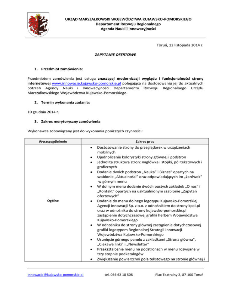 URZĄD MARSZAŁKOWSKI WOJEWÓDZTWA KUJAWSKO-POMORSKIEGO Departament Rozwoju Regionalnego Agenda Nauki i Innowacyjności Toruń, 12 listopada 2014 r. ZAPYTANIE OFERTOWE 1. Przedmiot zamówienia: Przedmiotem zamówienia jest usługa znaczącej modernizacji wyglądu i funkcjonalności strony internetowej www.innowacje.kujawsko-pomorskie.pl polegająca na dostosowaniu jej do aktualnych potrzeb Agendy Nauki i Innowacyjności Departamentu Rozwoju Regionalnego Urzędu Marszałkowskiego Województwa Kujawsko-Pomorskiego. 2. Termin wykonania zadania: 10 grudnia 2014 r. 3. Zakres merytoryczny zamówienia Wykonawca zobowiązany jest do wykonania poniższych czynności: Wyszczególnienie Ogólne [email protected] Zakres prac Dostosowanie strony do przeglądarek w urządzeniach mobilnych Ujednolicenie kolorystyki strony głównej i podstron Jednolita struktura stron: nagłówka i stopki, pól tekstowych i graficznych Dodanie dwóch podstron „Nauka” i Biznes” opartych na szablonie „Aktualności” oraz odpowiadających im „żarówek” w górnym menu W dolnym menu dodanie dwóch pustych zakładek „O nas” i „Kontakt” opartych na uaktualnionym szablonie „Zapytań ofertowych” Dodanie do menu dolnego logotypu Kujawsko-Pomorskiej Agencji Innowacji Sp. z o.o. z odnośnikiem do strony kpai.pl oraz w odnośniku do strony kujawsko-pomorskie.pl zastąpienie dotychczasowej grafiki herbem Województwa Kujawsko-Pomorskiego W odnośniku do strony głównej zastąpienie dotychczasowej grafiki logotypem Regionalnej Strategii Innowacji Województwa Kujawsko-Pomorskiego Usunięcie górnego panelu z zakładkami „Strona główna”, „Ciekawe linki” i „Newsletter” Przekształcenie menu na podstronach w menu rozwijane w trzy stopnie podkatalogów Zwiększenie powierzchni pola tekstowego na stronie głównej i tel. 056 62 18 508 Plac Teatralny 2, 87-100 Toruń URZĄD MARSZAŁKOWSKI WOJEWÓDZTWA KUJAWSKO-POMORSKIEGO Departament Rozwoju Regionalnego Agenda Nauki i Innowacyjności Strona główna podstronach Usunięcie funkcji „Szukaj” Możliwość edycji każdego z elementów struktury strony: menu i pola tekstowego Zapewnienie zgodności ze standardami WCAG 2.0. Redukcja jednego panelu z możliwością pełnej modyfikacji pól tekstowych Redukcja grafiki – usunięcie logotypu Aktualności Usunięcie kalendarza Multimedia Zmiana nazwy Zapytanie ofertowe Utworzenie menu rozwijanego w trzy stopnie podkatalogów 4. Kryteria oceny ofert: A. Cena – max 60 pkt. Punkty za kryterium cena zostaną obliczone wg następującego wzoru: x 100 x 60% (waga kryterium)=ilość punktów Wynik końcowy powyższego działania zostanie zaokrąglony do 2. miejsca po przecinku. B. Doświadczenie – max 40 pkt. Punkty za kryterium przyznawane będą na podstawie wykazu zrealizowanych projektów. Punkty za poszczególne kryteria zostaną zsumowane i będą stanowić końcową ocenę oferty. Maksymalnie Wykonawca może zdobyć 100 pkt. Za najkorzystniejszą zostanie uznana oferta, która uzyska najwyższą końcową ocenę oferty. 5. Oferta na przedmiot zapytania powinna zawierać poniższe dokumenty: 1. Ofertę cenową wyrażoną w złotych, opracowaną zgodnie z zał. nr 1 do zapytania ofertowego, sygnowaną przez osobę upoważnioną do reprezentowania Wykonawcy zgodnie z odpisem z właściwego rejestru lub aktualne zaświadczenie o wpisie do ewidencji działalności gospodarczej lub inny odpis aktu założycielskiego, 2. Aktualny odpis z właściwego rejestru lub aktualne zaświadczenie o wpisie do ewidencji działalności gospodarczej lub inny odpis aktu założycielskiego Przedsiębiorstwa/Instytucji wraz z aktualnymi danymi teleadresowymi, 3. Wykonawca złoży wykaz zrealizowanych projektów zgodnych z przedmiotem zamówienia zgodnie z zał. nr 2. 6. Miejsce i termin złożenia oferty: Ofertę należy dostarczyć do 17 listopada 2014 r. do godziny 15.30 [email protected] tel. 056 62 18 508 Plac Teatralny 2, 87-100 Toruń URZĄD MARSZAŁKOWSKI WOJEWÓDZTWA KUJAWSKO-POMORSKIEGO Departament Rozwoju Regionalnego Agenda Nauki i Innowacyjności 1) drogą elektroniczną na adres [email protected] – decyduje data dostarczenia e-maila na ww. adres lub 2) pocztą albo osobiście na adres: Departament Rozwoju Regionalnego, Plac Teatralny 2, 87-100 Toruń, p. 341 - decyduje data dostarczenia. Osoba do kontaktu: p. Marek Rozpłoch, tel. 56 62 18 508 e-mail: [email protected] 7. Informacje dodatkowe: W wyniku realizacji zamówienia Wykonawca zmodernizuje stronę internetową zgodnie ze wskazanym w przedmiotowym zamówieniu zakresem. Wykonawca zobowiązuje się do nanoszenia i uwzględniania wskazówek zamawiającego w trakcie realizacji usługi na podstawie korespondencji bieżącej z Zamawiającym bez zbędnej zwłoki. Informacja o wyborze Wykonawcy zostanie przekazana mailowo, telefonicznie bądź za pośrednictwem poczty tradycyjnej w ciągu 5 dni roboczych od otwarcia ofert. Jednocześnie informacja zostanie umieszczona na stronie www.innowacje.kujawsko-pomorskie.pl. Zamawiający zastrzega sobie możliwość niedokonania wyboru Wykonawcy, bez podawania przyczyny. [email protected] tel. 056 62 18 508 Plac Teatralny 2, 87-100 Toruń