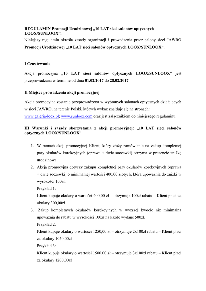 REGULAMIN Promocji Urodzinowej „10 LAT sieci salonów optycznych LOOX/SUNLOOX”. Niniejszy regulamin określa zasady organizacji i prowadzenia przez salony sieci JAWRO Promocji Urodzinowej „10 LAT sieci salonów optycznych LOOX/SUNLOOX”. I Czas trwania Akcja promocyjna „10 LAT sieci salonów optycznych LOOX/SUNLOOX” jest przeprowadzana w terminie od dnia 01.02.2017 do 28.02.2017. II Miejsce prowadzenia akcji promocyjnej Akcja promocyjna zostanie przeprowadzona w wybranych salonach optycznych działających w sieci JAWRO, na terenie Polski, których wykaz znajduje się na stronach: www.galeria-loox.pl; www.sunloox.com oraz jest załącznikiem do niniejszego regulaminu. III Warunki i zasady skorzystania z akcji promocyjnej: „10 LAT sieci salonów optycznych LOOX/SUNLOOX” 1. W ramach akcji promocyjnej Klient, który złoży zamówienie na zakup kompletnej pary okularów korekcyjnych (oprawa + dwie soczewki) otrzyma w prezencie zniżkę urodzinową. 2. Akcja promocyjna dotyczy zakupu kompletnej pary okularów korekcyjnych (oprawa + dwie soczewki) o minimalnej wartości 400,00 złotych, która upoważnia do zniżki w wysokości 100zł. Przykład 1: Klient kupuje okulary o wartości 400,00 zł – otrzymuje 100zł rabatu – Klient płaci za okulary 300,00zł 3. Zakup kompletnych okularów korekcyjnych w wyższej kwocie niż minimalna upoważnia do rabatu w wysokości 100zł na każde wydane 500zł. Przykład 2: Klient kupuje okulary o wartości 1250,00 zł – otrzymuje 2x100zł rabatu – Klient płaci za okulary 1050,00zł Przykład 3: Klient kupuje okulary o wartości 1500,00 zł – otrzymuje 3x100zł rabatu – Klient płaci za okulary 1200,00zł 4. Zniżka udzielana jest po przedstawieniu przez Klienta bonu rabatowego (ulotki). 5. Badanie wzroku podczas trwania promocji jest wliczone w cenę okularów. Akcja promocyjna „10 LAT sieci salonów optycznych LOOX/SUNLOOX” nie łączy się z: 1. Innymi promocjami i zniżkami dostępnymi w salonach sieci JAWRO. 2. Kuponami specjalnymi. 3. Kartami klienta. Postanowienia końcowe 1. Informacje dotyczące akcji promocyjnej są dostępne w salonach sieci JAWRO oraz na stronach www.galeria-loox.pl, www.sunloox.com 2. Organizator zastrzega sobie prawo zmiany niniejszego Regulaminu w czasie trwania akcji. Wszelkie zmiany w niniejszym regulaminie wymagają zachowania formy pisemnej, pod rygorem nieważności i będą obowiązywały po upływie 2 dni od dnia ich ogłoszenia na stronach www.galeria-loox.pl, www.sunloox.com OSTATNIE ZMIANY WPROWADZONO DNIA: 24.01.2017 Załącznik nr 1 do promocji „10 LAT sieci salonów optycznych LOOX/SUNLOOX”- lista salonów biorących udział w promocji. SALONY Loox Galeria Optyki 1 BEŁCHATÓW GALERIA OLIMPIA 5 KALISZ LOOX GALERIA OPTYKI Ul. Kolejowa 6, 97-400 Bełchatów Ul. Przemysłowa 2, 66-400 Gorzów Wielkopolski Al. Jana Pawła II 51, 58-506 Jelenia Góra Ul. Górnośląska 82, 62-800 Kalisz Ul. Legionów 2, 62-800 Kalisz 6 KRAKÓW CH M1 Al. Pokoju 67, 31-580 Kraków 7 ŁOMŻA GALERIA VENEDA 8 OLSZTYN CH VIKTOR 9 OPOLE CH KAROLINKA Ul. Zawadzka 38, 18-400 Łomża Al. Piłsudskiego 50, 10-416 Olsztyn Ul. Wrocławska 152/154, 45837 Opole Ul. Kaliska 120, 63-400 Ostrów Wielkopolski Ul. Promienista 160, 60-142 Poznań Ul. Bukowska 156, 60-198 Poznań Ul. Szwajcarska 14, 61-285 Poznań Ul. Głębocka 15, 03-287 Warszawa Ul. Hallera 52, 50-984 Wrocław Ul. Plutonowego Szkubacza 1, 41-800 Zabrze 2 GORZÓW CH NOVA PARK WIELKOPOLSKI 3 JELENIA GALERIA SUDECKA GÓRA 4 KALISZ GALERIA AMBER 10 OSTRÓW GALERIA OSTROVIA WIELKOPOLSKI 11 POZNAŃ CH PROMIENISTA 12 POZNAŃ KING CROSS MARCELIN 13 POZNAŃ CH M1 14 WARSZAWA ATRIUM TARGÓWEK 15 WROCŁAW CH BOREK 16 ZABRZE CH M1 Salony SUNLOOX: GDYNIA CH RIVIERA Ul. Kazimierza Górskiego 2, 81-304 Gdynia POZNAŃ STARY BROWAR Ul. Półwiejska 42, 61-888 Poznań SZCZECIN CH GALAXY Al.. Wyzwolenia 18-20, 40-554 Szczecin WARSZAWA BLUE CITY Al.. Jerozolimskie 179, 02-222 Warszawa ŁÓDŹ SUKCESJA PASAŻ GRUNWALDZKI Al. Politechnik 1, 93-590 Łódź WROCŁAW Pl. Grunwaldzki 22, 50-363 Wrocław