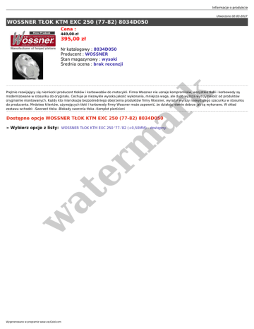 Informacje o produkcie Utworzono 02-03-2017 WOSSNER TŁOK KTM EXC 250 (77-82) 8034D050 Cena : 449,00 zł 395,00 zł Nr katalogowy : 8034D050 Producent : WOSSNER Stan magazynowy : wysoki Średnia ocena : brak recenzji er m ar k Prężnie rozwijający się niemiecki producent tłoków i korbowodów do motocykli. Firma Wossner nie uznaje kompromisów, wszystkie tłoki i korbowody są modernizowane w stosunku do oryginału. Cechuje je niezwykle wysoka jakość wykonania, mniejsza waga, ale dużo wyższa wytrzymałość od produktów oryginalnie montowanych. Każdy kto miał okazję bezpośredniego obejrzenia produktów firmy Wossner, wyrażał wyrazy najwyższego szacunku w stosunku do producenta. Mnóstwo klientów, używających tłoki i korbowody firmy Wossner może zapewnić, że działają równie dobrze jak są wykonane. W skład zestawu wchodzi: -Sworzeń tłoka -Blokady sworznia tłoka -Komplet pierścieni Dostępne opcje WOSSNER TŁOK KTM EXC 250 (77-82) 8034D050 w at » Wybierz opcje z listy: WOSSNER TŁOK KTM EXC 250 '77-'82 (+0,50MM) - dostępny. Wygenerowano w programie www.oscGold.com