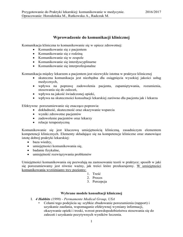 Przygotowanie do Praktyki lekarskiej: komunikowanie w medycynie. Opracowanie: Horodeńska M., Rutkowska A., Radczuk M. 2016/2017 Wprowadzenie do komunikacji klinicznej Komunikacja kliniczna to komunikowanie się w opiece zdrowotnej: Komunikowanie się z pacjentem Komunikowanie się z rodziną Komunikowanie się w zespole Komunikowanie się interdyscyplinarne Komunikowanie się interprofesjonalne Komunikacja między lekarzem a pacjentem jest niezwykle istotna w praktyce klinicznej skuteczna komunikacja jest niezbędna dla osiągnięcia wysokiej jakości usług medycznych, wpływa na poprawę zadowolenia pacjenta, zapamiętywania, rozumienia, stosowania się do zaleceń, wpływa na jakość świadczonej opieki, wpływa na skuteczności konsultacji lekarskiej zarówno dla pacjenta jak i lekarza Efektywne porozumiewanie się znacząco poprawia: dokładność, skuteczność oraz okazywanie wsparcia wyniki zdrowotne pacjentów zadowolenie pacjentów oraz lekarzy relacje terapeutyczną Komunikowanie się jest kluczową umiejętnością kliniczną, zasadniczym elementem kompetencji klinicznych. Elementy składające się na kompetencje kliniczne oraz stanowiące istotę dobrej praktyki lekarskiej: baza wiedzy, umiejętności komunikowania się, badanie fizykalne, umiejętność rozwiązywania problemów Umiejętności komunikowania się pozwalają na zastosowanie teorii w praktyce; sposób w jaki się porozumiewamy jest równie ważny, jak treści które przekazujemy. W umiejętności komunikowania wyróżniamy trzy poziomy: 1. Treść 2. Proces 3. Percepcja Wybrane modele konsultacji klinicznej I. 4 Habbits (1999) - Permamente Medical Group, USA • Celami tego podejścia są: szybkie zbudowanie porozumienia (rapport) i uzyskanie zaufania, wspomaganie efektywnej wymiany informacji, okazywanie opieki i troski, wzrost prawdopodobieństwa stosowania się do zaleceń i uzyskanie pozytywnych wyników leczenia. 1 Przygotowanie do Praktyki lekarskiej: komunikowanie w medycynie. Opracowanie: Horodeńska M., Rutkowska A., Radczuk M. • 2016/2017 Cztery zwyczaje to: 1. Zainwestuj w początek 2. Poznaj perspektywę pacjenta 3. Okazuj empatię 4. Zainwestuj w koniec II. The SEGUEG Framework (Makoul 2001) • Ameryka Północna • Oparta na badaniach naukowych lista kontrolna (checklist) zadań z następujących obszarów: 1. Przygotowanie gruntu 2. Uzyskanie informacji 3. Udzielanie informacji 4. Rozumienie perspektywy pacjenta 5. Zakończenie spotkania 6. Działania, które należy podjąć w razie wprowadzania nowego/ zmodyfikowanego leczenia/ planu zapobiegania III. Wytyczne Calgary-Cambridge (Kurtz&Silverman, 1996, 2002) • Propozycja, która bezpośrednio nawiązuje do sposobu, w jaki budujemy strukturę konsultacji w realnym życiu (5 etapów konsultacji) • Przedstawił pełny wachlarz umiejętności komunikowania się znajdujących potwierdzenie w wynikach badań i teorii • Zaprezentował odniesienie umiejętności do aktualnie wówczas dostępnych dowodów naukowych • Uwzględnił zmianę w opiece zdrowotnej w kierunku podejścia bardziej skoncentrowanego na pacjencie i opartego na współpracy • Zwrócił szczególną uwagę na wysoce istotny aspekt wyjaśniania i planowania • Stworzył wytyczne określające umiejętności, których zastosowanie wpływa na poprawę komunikacji, pozostawiając przy tym dużą swobodę dla indywidualnego stylu pracy i osobowości jednostki 2 Przygotowanie do Praktyki lekarskiej: komunikowanie w medycynie. Opracowanie: Horodeńska M., Rutkowska A., Radczuk M. 2016/2017 Wytyczne Calgary-Cambridge Inicjowanie sesji przygotowanie ustalenia wstępnej relacji identyfikacji przyczyn konsultacji eksploracja problemów pacjenta aby poznać: ◊perspektywę biomedyczną ◊perspektywę pacjenta ◊podstawowe informacje – kontekst Zbieranie informacji Zapewnianie struktury - zapewnienie jasnej struktury spotkania - uczestniczenie w procesie Badanie fizykalne Wyjaśnianie i planowanie dostarczanie odpowiedniego rodzaju oraz ilości informacji pomaganie w dokładnym przypominaniu i zrozumieniu osiągnięcie wspólnego zrozumienia zawierającego obraz choroby posiadany przez pacjenta planowanie: wspólne podejmowanie decyzji Budowanie relacji - odpowiednie niewerbalne reagowanie - budowanie porozumienia - angażowanie pacjenta Zamknięcie sesji zapewnienie odpowiedniego punktu zamknięcia planowanie naprzód Źródła: Kurtz SM, Silvermann JD, Draper J (2005) Teaching and Learning Communication Skills in Medicine 2nd Edition. Radcliffe Publishing (Oxford) 3