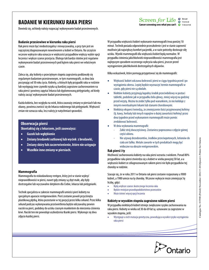 BADANIE W KIERUNKU RAKA PIERSI Dowiedz się, od kiedy należy rozpocząć wykonywanie badań przesiewowych. Badanie przesiewiwe w kierunku raka piersi Rak piersi może być niedostrzegalny i niewyczuwalny, a przy tym jest on najczęściej diagnozowanym nowotworem u kobiet w Ontario. Na szczęście wczesne wykrycie raka oznacza w większości przypadków większy wybór opcji leczenia i większe szanse przeżycia. Dlatego tak bardzo istotne jest regularne wykonywanie badań przesiewowych pod kątem raka piersi we właściwym czasie. Zaleca się, aby kobiety o przeciętnym stopniu zagrożenia poddawały się regularnym badaniom przesiewowym, w tym mammografii, co dwa lata poczynając od 50 roku życia. Kobiety, u których były przypadki raka w rodzinie lub występują inne czynniki ryzyka są bardziej zagrożone zachorowaniem na raka piersi i powinny zapytać lekarza lub dyplomowaną pielęgniarkę, od kiedy należy zacząć wykonywanie badań przesiewowych. Każda kobieta, bez względu na wiek, która zauważy zmiany w piersiach lub ma obawy, powinna zwrócić się do lekarza rodzinnego lub pielęgniarki. Większość zmian nie oznacza raka, lecz należy je natychmiast sprawdzić. Obserwacja piersi Skontaktuj się z lekarzem, jeśli zauważysz: x Guzek lub wgłębienie x Zmiany brodawki sutkowej lub wyciek z brodawki, x Zmiany skóry lub zaczerwienienie, które nie ustępuje x Wszelkie inne zmiany w piersiach. W przypadku większości kobiet wykonanie mammografii trwa poniżej 10 minut. Technik posiada odpowiednie przeszkolenie i jest w stanie zapewnić możliwie jak największy komfort pacjentki, a w razie potrzeby dostosuje siłę ucisku. Wyniki mammografii dla większości kobiet będą normalne. W przypadku istnienia jakichkolwiek nieprawidłowości mammografia jest najlepszym sposobem wczesnego wykrycia raka piersi, jeszcze przed wystąpieniem jakichkolwiek dostrzegalnych objawów. Kilka wskazówek, które pomogą przygotować się do mammografii: x x x x Większość kobiet odczuwa bolesność piersi w ciągu tygodnia przed i po wystąpieniu okresu. Lepiej będzie wyznaczyć termin mammografii w czasie, gdy piersi nie są obolałe. Niektóre kobiety przyjmują łagodny środek przeciwbólowy w postaci tabletki, podobnie jak w przypadku bólu głowy, mniej więcej na godzinę przed wizytą. Można to zrobić tylko pod warunkiem, że nie koliduje z innymi ewentualnymi lekami lub stanami chorobowymi. Niektórzy eksperci twierdzą, że zmniejszenie ilości przyjmowanej kofeiny (tj. kawy, herbaty lub innych napojów o dużej zawartości kofeiny) przez dwa tygodnie przed wykonaniem mammografii może pomóc zredukować bolesność. W dniu wykonania mammografii: Załóż strój dwuczęściowy. Zostaniesz poproszona o zdjęcie górnej części ubioru. - Nie używaj dezodorantów, środków przeciwpotowych, lotionów do ciała ani talku. Metale zawarte w tych produktach mogą być widoczne na obrazie rentgenowskim. Rak piersi i ty Możliwość zachorowania kobiety na raka piersi wzrasta z wiekiem. Ponad 80% przypadków raka piersi stwierdza się u kobiet w wieku powyżej 50 lat, a u większości kobiet ze zdiagnozowanym rakiem piersi nie było przypadków tej choroby w rodzinie. Mammografia Mammografia to niskodawkowy rentgen, który jest w stanie wykryć nieprawidłowości w piersi, nawet gdy zmiany są zbyt małe, aby były dostrzegalne lub wyczuwalne dotykiem dla Ciebie, lekarza lub pielęgniarki. Technik specjalista w zakresie mammografii umieści pierś kobiety na specjalnym aparacie rentgenowskim. Pierś zostanie powoli przyciśnięta plastikową płytką, która pozostanie w tej pozycji przez kilka sekund. Przez kilka sekund podczas wykonywania prześwietlenia będzie odczuwalny pewien nacisk na pierś, podobny do ucisku ciasnym mankietem do mierzenia ciśnienia krwi. Nacisk ten nie powoduje uszkodzenia tkanki piersi. Wykonuje się dwa zdjęcia każdej piersi. Szacuje się, że w roku 2011 w Ontario rak piersi zostanie rozpoznany u 9000 kobiet, a 1980 umrze na tę chorobę. Wczesne wykrycie może zmniejszyć tę liczbę, gdyż: x x x Będą większe szanse skutecznego leczenia raka Będzie mniejsze prawdopodobieństwo przerzutów Może istnieć więcej opcji leczenia Kobiety w wysokim stopniu zagrożone rakiem piersi W przypadku niektórych kobiet istnieje zwiększone ryzyko zachorowania na raka piersi. Kobiety w wieku od 30 do 69 lat są uznawane za zagrożone w wysokim stopniu, jeśli: x Występuje u nich mutacja genetyczna, powodująca wysokie ryzyko wystąpienia raka piersi x x x Jedno z ich rodziców, rodzeństwa lub dzieci ma mutację genetyczną, powodującą wysokie ryzyko wystąpienia raka piersi Badanie genetyczne potwierdziło u nich ryzyko raka piersi na przestrzeni całego życia większe lub równe 25%, ze względu na występowanie chorób w rodzinie Były leczone radiacją klatki piersiowej przed ukończeniem 30 roku życia, ze względu na inny rodzaj raka lub chorobę (np. ziarnica złośliwa) W przypadku kobiet w wieku od 30 do 69 lat, u których ustalono wysokie ryzyko raka piersi, zalecane są coroczne badania przesiewowe , obejmujące zarówno mammografię, jak i badanie obrazowe rezonansem magnetycznym (MRI). U kobiet w wieku od 30 do 69 lat, u których występuje wysokie ryzyko raka piersi, prawdopodobieństwo wystąpienia raka piersi jest od dwóch do pięciu razy wyższe niż w obrębie ogólnej populacji. Twój następny krok Przy następnej regularnej wizycie u lekarza lub dyplomowanej pielęgniarki, porozmawiaj z nimi o tym, jakie badanie należy wykonać i kiedy. Poddać się badaniu jest łatwo. Kobiety o przeciętnym stopniu zagrożenia rakiem piersi, w wieku od 50 do 74 lat, mogą: x Skontaktować się z dowolną placówką Programu Badań Przesiewowych Piersi (Ontario Breast Screening Program, OBSP), aby wyznaczyć termin badania. Wejdź na stronę Ontario.ca/healthcareoptions, aby znaleźć placówkę OBSP w pobliżu miejsca zamieszkania. x Skontaktowa