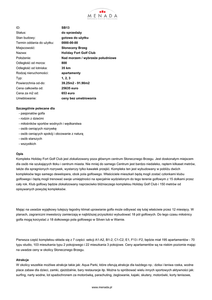 ID: SB13 Status: do sprzedaży Stan budowy: gotowa do użytku Termin oddania do użytku: 0000-00-00 Miejscowość: Słoneczny Brzeg Nazwa: Holiday Fort Golf Club Położenie: Nad morzem / wybrzeże południowe Odległość od morza: 800 Odległość od lotniska: 35 km Rodzaj nieruchomości: apartamenty Typ: 1, 2, 3 Powierzchnia od-do: 39.25m2 - 91.90m2 Cena całkowita od: 25635 euro Cena za m2 od: 653 euro Umeblowanie: ceny bez umeblowania Szczególnie polecane dla - pasjonatów golfa - rodzin z dziećmi - miłośników sportów wodnych i wędkarstwa - osób ceniących rozrywkę - osób ceniących spokój i obcowanie z naturą - osób starszych - wszystkich Opis Kompleks Holiday Fort Golf Club jest zlokalizowany poza głównym centrum Słonecznego Brzegu. Jest doskonałym miejscem dla osób nie szukających tłoku i centrum miasta. Nie mniej do samego Centrum jest bardzo niedaleko, raptem kilkaset metrów, także dla spragnionych rozrywek, wystarczy tylko kawałek przejść. Kompleks ten jest wybudowany w pobliżu dwóch kompleksów tego samego dewelopera, obok pola golfowego. Właściciele mieszkań będą mogli zostać członkami klubu golfowego i będą mogli trenować swoje umiejętności na specjalnie wydzielonym do tego terenie golfowym z 15 dołkami przez cały rok. Klub golfowy będzie zlokalizowany naprzeciwko bliźniaczego kompleksu Holiday Golf Club i 150 metrów od opisywanych powyżej kompleksów. Mając na uwadze wyjątkowy tutejszy łagodny klimat uprawianie golfa może odbywać się tutaj właściwie przez 12 miesięcy. W planach, zagraniczni inwestorzy zamierzają w najbliższej przyszłości wybudować 18 pól golfowych. Do tego czasu miłośnicy golfa mogą korzystać z 18 dołkowego pola golfowego w Silven lub w Warnie. Pierwsza część kompleksu składa się z 7 części: sekcji A1-A2, B1-2, C1-C2, E1, F13 i F2, będzie miał 195 apartamentów - 70 typu studio, 103 mieszkania typu 2 pokojowego i 22 mieszkania 3 pokojowe. Ceny apartamentów są na niskim poziomie mając na uwadze ceny w okolicy Słonecznego Brzegu. Atrakcje W okolicy wszelkie możliwe atrakcje takie jak: Aqua Parki, które oferują atrakcje dla każdego np.: dzika i leniwa rzeka, wodne place zabaw dla dzieci, zamki, zjeżdżalnie, bary restauracje itp. Można tu spróbować wielu innych sportowych aktywności jak: surfing, narty wodne, lot spadochronem za motorówką, parachuting, żeglowanie, kajaki, skutery, motorówki, korty tenisowe, www.menada.pl siatkówka plażowa, golf, jazda konna. Jest tutaj także wiele wspaniałych miejsc dla dzieci - mnóstwo placów zabaw i gier, zjeżdżalni, trampolin, szkółek sportowych. Koniecznie trzeba wybrać się na specjalnie zorganizowane spotkanie na wsi bułgarskiej z tańcami, śpiewami i tutejszymi przysmakami. Można zorganizować sobie wyprawę jeepami przez naturalny rezerwat przyrody z fauną i florą Bułgarii. Dla miłośników atrakcji wieczornych radzimy sprawdzić jak wygląda tu życie nocne. Można tu doznać prawdziwego pozytywnego rozczarowania. Życie nocne w Sunny Beach rozpoczyna się po 22.00. Otwierają się wówczas kluby nocne, które goszczą klientów różnych pokoleń. Warto sprawdzić, naprawdę jest tu wspaniała zabawa. Ponadto rejsy na jachcie, pikniki, atrakcje turystyczne Cechy Dlaczego warto? Niskie ceny Kompleks położony naprzeciwko Aqua Parku w Słonecznym Brzegu Doskonała komunikacja do Centrum Słonecznego Brzegu (200 metrów) i 800 metrów do plaży W kompleksie wiele udogodnień Cechy Club - Restauracja Pole golfowe: 6 tras, 15 dołków 3 restauracje: z owocami morza, włoska restauracja, kuchnia śródziemnomorska Bar Kafejka 6 basenów dla dzieci i dorosłych z ratownikiem Sklepy Klub internetowy Strefa relaksu z zielenią Centrum Stomatologiczne Sauna Kantor Plac zabaw dla dzieci Wynajem samochodów Parking strzeżony Studio masażu Usługi Nieruchomość jest utrzymywana przez zarządcę w czystości i porządku. Oczywiście deweloper zapewnia zarządzanie obiektem, ochronę obiektu, a także płatności za media w imieniu właściciela. Nasza firma również dba o utrzymanie apartamentu w ciągu roku - Dla naszych Klientów zapewniamy utrzymanie nieruchomości, ochronę 24 h przez cały rok, oświetlenie, bezpieczeństwo elektryczne i wodne, naprawy, sprzątanie i www.menada.pl czyszczenie części wspólnych, zieleni, czyszczenie apartamentu czy też płatności rachunków. Uzyskiwanie dodatkowych dochodów z ewentualnego wynajmu apartamentu - Zapewniamy bowiem również organizację wynajmu apartamentu. obsługa posprzedażowa Zasady płatności Plan zapłaty 1000 euro - depozyt - możliwość płatności tydzień po rezerwacji apartamentu W terminie 9 miesięcy należy dokonać wpłaty: 10% - I rata - przy umowie przedwstępnej 10% - II rata - 3 miesiące po podpisaniu umowy przedwstępnej 10% - III rata - 3 miesiące po wpłacie II raty 10% - IV rata - 3 miesiące po podpisaniu III raty pozostałe 60% wartości nieruchomości można opłacić: 1. Do 31.10.2010 roku (bez odsetek) lub też 2. Spłacić wartość nieruchomości poprzez kredyt deweloperski (kredyt od dewelopera) na poniższych warunkach: w 3 lata - 6,3% w 5 lat - 9,8% w 7 lat - 15,7% w 10 lat - 18,1% Z apartamentu można korzystać już po wpłacie 40%. Akt notarialny podpisywany jest po całkowitej spłacie. Koszty Należy pamiętać, iż oprócz ceny za nieruchomość dochodzą koszty związane z opłatą notarialną (jest to około 3,5 - 4% wartości zakupu). Dodatkowo osoby zakupujące apartament w tym kompleksie płacą opłatę za zarządzanie w wysokości 10 euro za m2 za rok z VAT 20%, która obejmuje: zarządzenie terytorium kompleksu; zarządzanie częściami wspólnymi budynku; utrzymaniem basenów; utrzymaniem roślinności; całoroczna ochrona; korzystanie z basenów; elektryczność za części wspólne; www.menada.pl Na życzenie klienta za dodatkową opłatą istnieje możliwość: sprzątanie apartamentu przez cały rok; napra