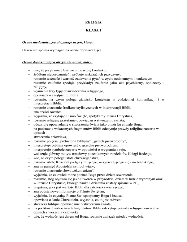 RELIGIA KLASA I Ocenę niedostateczną otrzymuje uczeń, który: Uczeń nie spełnia wymagań na ocenę dopuszczającą. Ocenę dopuszczającą otrzymuje uczeń, który: wie, że język może być rozumie istotę kontraktu, źródłem nieporozumień i próbuje wskazać ich przyczyny, rozumie ważność i wartość zadawania pytań w życiu codziennym i naukowym rozumie zaufanie (podaje przykłady) zaufanie jako akt psychiczny, społeczny i religijny, wymienia trzy typy doświadczenia religijnego, opowiada o zwątpieniu Piotra rozumie, na czym polega zjawisko kontekstu w codziennej komunikacji i w interpretacji Biblii, rozumie znaczenie środków stylistycznych w interpretacji Biblii, zna części różańca, wyjaśnia, że czytając Pismo Święte, spotykamy Jezusa Chrystusa, rozumie religijne przesłanie opowiadań o stworzeniu świata, odczytuje opowiadanie o stworzeniu świata jako utwór ku chwale Boga, na podstawie wskazanych fragmentów Biblii odczytuje prawdy religijne zawarte w opisach stworzenia człowieka, rozumie pojęcia „prehistoria biblijna”, „grzech pierworodny”, interpretuje biblijną opowieść o grzechu pierworodnym, interpretuje symbole zawarte w opowieści o wygnaniu z raju, wskazuje główny motyw treściowy początkowych rozdziałów Księgi Rodzaju, wie, na czym polega istota chrześcijaństwa, rozumie istotę Kościoła pielgrzymującego, oczyszczającego się i niebiańskiego, zna na pamięć Apostolski symbol wiary, rozumie znaczenie słowa ,,ekumenizm”, wyjaśnia, że człowiek może poznać Boga przez dzieła stworzenia, rozumie, Bóg objawia się jako Stwórca w przyrodzie, działa w ludzie wybranym oraz w Jezusie Chrystusie, którego nauka i działania zostały spisane w NT, wyjaśnia, jaka jest wartość Biblii dla człowieka wierzącego, zna podstawowe informacje o Piśmie Świętym, wyjaśnia, że czytając Pismo Św. spotykamy Boga i Jezusa, opowiada o Janie Chrzcicielu, wyjaśnia, co to jest Adwent, streszcza biblijne opowiadanie o stworzeniu świata, na podstawie wskazanych fragmentów Biblii odczytuje prawdy religijne zawarte w opisach stworzenia człowieka, wie, że wolność jest darem od Boga, rozumie związek między wolnością a odpowiedzialnością, wskazuje wezwanie Boże jako najważniejsze zadanie człowieka wierzącego, zna i opowiada różne tradycje swojej rodziny, opowiada o Bożym Narodzeniu na podstawie fragmentu z Ewangelii św.Łk o Narodzeniu Jezusa, zna Dekalog oraz wyjaśnia, że nakazy i zakazy Dekalogu są wyrazem opieki Boga nad ludźmi, wymienia proroków czasów rozbicia narodu wybranego: Izajasza i Jeremiasza, zna opowiadanie o niewoli babilońskiej, rozumie znaczenie słowa ,,Mesjasz”, wie, że Jezus był postacią historyczną, zna autorów Ewangelii, zna na pamięć ,,Wyznanie wiary”, wyjaśnia, dlaczego najlepiej poznajemy Boga przez Jezusa Chrystusa, ocenia ludzkie postawy wobec życia w świetle wiary, swoimi słowami wyjaśnia znaczenie słowa: ,,sumienie” i ,,autorytet”, podaje przykłady autorytetów, streszcza opowieść o Abrahama, podaje informacje na temat Samuela, opowiada o Dawidzie z wyeksponowaniem jego postawy szlachetności i wierności Bożemu zakazowi, opowiada o Jozuem, opowiada historię Jonasza, podaje przykłady poświęcenia życia i ocenia je w świetle wiary, wymienia formy pobożności maryjnej, charakteryzuje św. Maksymiliana Kolbego, podaje podstawowe informacje z biografii Jana Pawła II, rozumie istotę Kościoła, wymienia przykłady znaków w codziennym doświadczeniu, opowiada o św. Wojciechu, św. Stanisławie, o bracie Albercie/ rozumie symboliczne znaczenie wieży Babel, wyjaśnia mechanizm rozprzestrzeniania się zła na świecie, wskazuje na zmartwychwstanie Chrystusa jako na podstawową prawdę wiary opisuje stosunek ludzi współczesnych do śmierci, opowiada o wskrzeszeniu Łazarza, wyjaśnia, co to znaczy, że Kościół jest misyjny, opowiada o św. Piotrze i o początkach Kościoła, wymienia kilka biblijnych obrazów Kościoła, interpretuje fragment Dziejów Apostolskich, opowiada treść Listu do Diogeneta, opowiada o początkach chrześcijańskiej Europy, zna pojęcia: Inkwizycja, herezja, wolność sumienia. opowiada o świętym Dominiku, o świętym Franciszku i o św. Stanisławie Kostce, Ocenę dostateczną otrzymuje uczeń, który spełnił wymagania na ocenę dopuszczającą oraz spełnia poniższe wymagania: wymienia trzy sposoby poznawania rzeczywistości, kojarzy wyrażenia potoczne z odpowiednimi wyrażeniami religijnymi, z rozsypanki pytań wybiera pytania egzystencjalne i układa osobistą hierarchie, wie, czym jest różaniec, wymienia kilka paradoksów wiary chrześcijańskich, odróżnia Uroczystość Wszystkich Świętych od Dnia Zmarłych, wymienia kilkoro świętych, zna pojęcie „paruzja opisuje chrześcijańską wizję nieba, podaje wzór jedności chrześcijańskiej ( Trójca .) i źródło jedności ( Eucharystia), podaje przykłady pośredników objawienia (proroków, Apostołów), odczytuje w Biblii cytat na podstawie odnośnika, podaje przykłady środków stylistycznych w Piśmie Świętym, podaje główny cel czytania Pisma Świętego, wyjaśnia znaczenie hebrajskich słów bereszit i bara, formułuje prawdy religijne wypływające z analizy fragmentów, wyjaśnia, co odróżnia człowieka od zwierząt, określa czas adwentu i rozumie jego istotę w kontekście ludzkich oczekiwań, wymienia symbole adwentowe, wiąże biblijny nakaz odpoczynku z trzecim przykazaniem Bożym, podaje przykłady przekroczenia granic wolności, rozumie religijny sens Bożego Narodzenia, podaje podstawowe informacje o Mojżeszu, opowiada zawarcie przymierza Boga z ludem ( przymierze synajskie), zna starotestamentowe pochodzenie Dekalogu, opisuje bardzo ogólnie treść przepowiadania: wezwanie do nawrócenia Izajasza i zapowiedź nowego przymierza przez Jeremiasza, rozumie niewolę dosłownie (utrata wolności) i przenośnie (niewola grzechu), układ