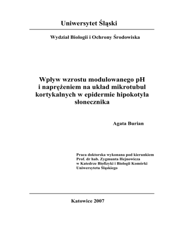Uniwersytet Śląski Wydział Biologii i Ochrony Środowiska Wpływ wzrostu modulowanego pH i naprężeniem na układ mikrotubul kortykalnych w epidermie hipokotyla słonecznika Agata Burian Praca doktorska wykonana pod kierunkiem Prof. dr hab. Zygmunta Hejnowicza w Katedrze Biofizyki i Biologii Komórki Uniwersytetu Śląskiego Katowice 2007 Spis treści I. WSTĘP----------------------------------------------------------------------------------------------------------------5 1. WZROST KOMÓRKI ROŚLINNEJ------------------------------------------------------------------------------5 1.1. Podstawowe pojęcia--------------------------------------------------------------------------------------------5 1.2. Wzrost komórki roślinnej jako proces biofizyczny----------------------------------------------------------9 1.3. Ściana komórkowa: budowa i skład chemiczny-----------------------------------------------------------11 1.4. Modele tworzenia pierwotnej ściany komórkowej--------------------------------------------------------12 1.5. Hipoteza kwasowego wzrostu--------------------------------------------------------------------------------15 1.6. Mikrofibryle celulozowe i kierunek maksymalnego wzrostu---------------------------------------------18 2. ZNACZENIE NAPRĘŻEŃ W BUDOWIE I FUNKCJONOWANIU ORGANIZMÓW----------------------------------------------------------------------------------------------------20 2.1. Tensegralność--------------------------------------------------------------------------------------------------20 2.2. Naprężenia tkankowe i ich rola we wzroście organów roślinnych--------------------------------------22 2.3. Znaczenie epidermy we wzroście organów roślinnych---------------------------------------------------24 3. MIKROTUBULE: BUDOWA, DYNAMIKA I ORGANIZACJA-------------------------------------------25 3.1. Budowa mikrotubul--------------------------------------------------------------------------------------------25 3.2. Dynamika mikrotubul-----------------------------------------------------------------------------------------27 3.3. Powstanie i organizacja mikrotubul w komórce-----------------------------------------------------------29 3.4. Białka MAP----------------------------------------------------------------------------------------------------31 3.5. Polarność układów mikrotubul kortykalnych--------------------------------------------------------------33 3.6. Cykliczna reorientacja układów mikrotubul kortykalnych w komórce roślinnej----------------------34 4. UDZIAŁ MIKROTUBUL KORTYKALNYCH W MORFOGENEZIE------------------------------------37 4.1. Wpływ wzrostu (odkształcenia plastycznego ściany) na układ mikrotubul kortykalnych. Hipoteza Schopfera--------------------------------------------------------------------------------------------38 4.2. Wpływ mikrotubul kortykalnych na układ mikrofibryli celulozowych i na odwrót-----------------39 4.3. Wpływ mikrotubul kortykalnych na anizotropię wzrostu komórek roślinnych------------------------42 4.4. Mikrotubule kortykalne, chiralność i wzrost spiralny----------------------------------------------------43 4.5. Wpływ naprężenia na mikrotubule kortykalne------------------------------------------------------------46 5. METODY BADAŃ ORIENTACJI MIKROTUBUL---------------------------------------------------------49 6. ZADANIA I CEL PRACY----------------------------------------------------------------------------------------52 II. MATERIAŁY I METODY-------------------------------------------------------------------------------------54 1. MATERIAŁ----------------------------------------------------------------------------------------------------------54 2. POMIAR SZYBKOŚCI WZROSTU HIPOKOTYLA IN SITU----------------------------------------------55 3. POMIAR DŁUGOŚCI I SZEROKOŚCI KOMÓREK EPIDERMY----------------------------------------55 4. BADANIE ORIENTACJI MIKROTUBUL KORTYKALNYCH W EPIDERMIE IN SITU------------55 5. BADANIE KINETYKI ZMIAN ORIENTACJI MIKROTUBUL KORTYKALNYCH PO WYIZOLOWANIU EPIDERMY Z HIPOKOTYLA---------------------------------------------------------56 6. BADANIE WPŁYWU SPOSOBU ODDZIELANIA PASA EPIDERMY Z HIPOKOTYLA---------56 7. BADANIE WPŁYWU pH I NAPRĘŻENIA NA ORIENTACJĘ MIKROTUBUL KORTYKALNYCH W IZOLOWANYCH PASACH EPIDERMY-----------------------------------------56 8. IMMUNOCYTOCHEMICZNE ZNAKOWANIE MIKROTUBUL KORTYKALNYCH-------------58 9. ANALIZA ILOŚCIOWA ORIENTACJI MIKROTUBUL KORTYKALNYCH------------------------58 10. POMIAR SZYBKOŚCI WZROSTU IZOLOWANCH PASÓW EPIDERMY W ZALEŻNOŚCI OD pH I NAPRĘŻENIA------------------------------------------------------------------------------------------62 11. BADANIE WPŁYWU FUZIKOKCYNY NA SZYBKOŚĆ WZROSTU IZOLOWANYCH PASÓW EPIDERMY ORAZ NA ORIENTACJĘ MIKROTUBUL KORTYKALNYCH--------------62 12. BADANIE WPŁYWU ŚWIATŁA BIAŁEGO NA ORIENTACJĘ MIKROTUBUL KORTYKALNYCH W PASACH EPIDERMY INKUBOWANYCH PRZEZ 12-14 GODZIN------63 III. WYNIKI-----------------------------------------------------------------------------------------------------------64 1. CHARAKTERYSTYKA BADANYCH STREF EPIDERMY HIPOKOTYLA---------------------------64 1.1. Szybkość wzrostu wydłużeniowego i rozmiary komórek-----------------------------------------------64 1.2. 1.3. 1.4. Ogólna charakterystyka mikrotubul kortykalnych------------------------------------------------------66 Orientacja mikrotubul kortykalnych w epidermie in situ----------------------------------------------68 Zmienność orientacji mikrotubul kortykalnych z uwzględnieniem kierunku obwodowego-------- 71 2. ZMIANY ORIENTACJI MIKROTUBUL KORTYKALNYCH SPOWODOWANE IZOLACJĄ PASÓW EPIDERMY Z HIPOKOTYLA------------------------------------------------------------------------73 3. WPŁYW SPOSOBU ODDZIELANIA PASÓW EPIDERMY Z HIPOKOTYLA NA REORIENTACJĘ MIKROTUBUL KORTYKALNYCH PO IZOLACJI---------------------------------76 4. WPŁYW pH I NAPRĘŻENIA ROZCIĄGAJĄCEGO 