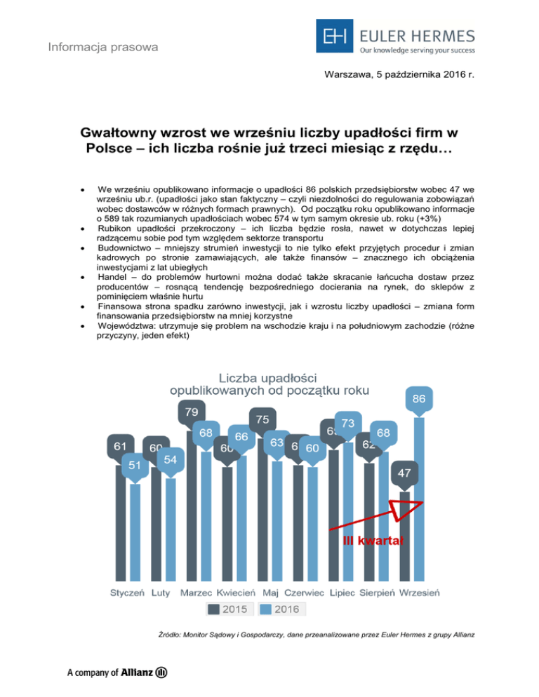 Informacja prasowa Warszawa, 5 października 2016 r. Gwałtowny wzrost we wrześniu liczby upadłości firm w Polsce – ich liczba rośnie już trzeci miesiąc z rzędu… We wrześniu opublikowano informacje o upadłości 86 polskich przedsiębiorstw wobec 47 we wrześniu ub.r. (upadłości jako stan faktyczny – czyli niezdolności do regulowania zobowiązań wobec dostawców w różnych formach prawnych). Od początku roku opublikowano informacje o 589 tak rozumianych upadłościach wobec 574 w tym samym okresie ub. roku (+3%) Rubikon upadłości przekroczony – ich liczba będzie rosła, nawet w dotychczas lepiej radzącemu sobie pod tym względem sektorze transportu Budownictwo – mniejszy strumień inwestycji to nie tylko efekt przyjętych procedur i zmian kadrowych po stronie zamawiających, ale także finansów – znacznego ich obciążenia inwestycjami z lat ubiegłych Handel – do problemów hurtowni można dodać także skracanie łańcucha dostaw przez producentów – rosnącą tendencję bezpośredniego docierania na rynek, do sklepów z pominięciem właśnie hurtu Finansowa strona spadku zarówno inwestycji, jak i wzrostu liczby upadłości – zmiana form finansowania przedsiębiorstw na mniej korzystne Województwa: utrzymuje się problem na wschodzie kraju i na południowym zachodzie (różne przyczyny, jeden efekt) Źródło: Monitor Sądowy i Gospodarczy, dane przeanalizowane przez Euler Hermes z grupy Allianz Wzrost liczby upadłości w skali całego roku – punkt zwrotny już za nami Po trzech kwartałach mamy już więcej faktycznych upadłości, niż przed rokiem (o 15 przypadków – jak na razie daje to +3%). Jak to komentuje Tomasz Starus, Członek Zarządu Towarzystwa Ubezpieczeń Euler Hermes, odpowiedzialny za ocenę ryzyka: Gwałtowny wzrost upadłości nastąpił wcześniej, niż się tego spodziewaliśmy. Problemy dotykają przede wszystkim handlu hurtowego, usług, ale też ostatnio budownictwa, a wkrótce także zapewne transportu. Klienci usług B2B (np. usług ochrony, sprzątania, doradztwa, obsługi inwestycji etc.) szukają oszczędności, co jest niemożliwe w efekcie wzrostu płacy minimalnej i programu 500+. Usługi korzystały bowiem dotychczas z niskich kosztów pracy, dlatego w tej chwili teoretycznie możliwe są dwa rozwiązania: albo klienci korzystający z tych usług zgodzą się na wyższe ich ceny (mało prawdopodobne – nie są one na tyle specyficzne i łatwo przecież zmienić np. firmę sprzątającą)… albo popyt na te usługi B2B urealni się. Będą one świadczone tylko tam, gdzie to jest rzeczywiście niezbędne (np. dotychczas ochrona służyła wielu podmiotom głównie jako źródło oszczędności na kosztach ubezpieczenia) oraz świadczone będą na wyższym poziomie technologicznym (z jeszcze większym wykorzystaniem urządzeń – np. monitoring etc.). W dłuższym okresie czasu inwestycje w technologie i sprzęt w sektorze usług są niezbędne wobec wzrostu kosztów pracy (ponadto urządzenia są wydajniejsze – nie chorują etc.) – coś, co już mają za sobą m.in. centra logistyczne i magazynowe. Źródło: Monitor Sądowy i Gospodarczy, dane przeanalizowane przez Euler Hermes z grupy Allianz Budownictwo – przyzwyczajmy się do mniejszego strumienia inwestycji przez dłuższy czas W budownictwie trwająca od trzech lat dynamika spadku upadłości spowolniła, a w IV kwartale będziemy mieli niewątpliwie do czynienia ze wzrostem ich liczby, zmiana ta potrwa najprawdopodobniej kilka kwartałów. Inwestycje publiczne w infrastrukturę spadły w I połowie roku aż o ¼ (za GUNB), i niestety trend ten utrzyma się zapewne dłużej… Strumień nowych inwestycji mniejszy będzie z przyczyn finansowych, jak i proceduralnych zauważą Michał Modrzejewski, Dyrektor Programu Analiz Branżowych w Euler Hermes. Środki są mniejsze nie jak się powszechnie sądzi przede wszystkim z powodu zwiększonych wydatków socjalnych państwa – inwestorzy publiczni (samorządy, instytucje celowe) zadłużyli się w latach ubiegłych i dużą część swych obecnych środków (przypadki np. 40% budżetu) wydają na obsługę zadłużenia. Proceduralne opóźnienia – gdy po zmianie przepisów jak i wymiany kadry w instytucjach publicznych udaje się z wolna rozstrzygać przetargi, czynione jest to zwykle w formule „projektuj i buduj”, co o kolejne miesiące odwleka rozpoczęcie prac i dopływ środków na rynek budowlany. Nie ma od tego odwrotu: wyczerpała się pula gotowych projektów, ponadto w latach ubiegłych rozdzielenie funkcji projektowych od wykonawczych rodziło wiele problemów i służyło nierzadko pozbyciu się odpowiedzialności przez wykonawców. Formuła „projektuj i buduj” jest ponadto mniej wymagająca, angażująca dla zamawiającego… Źródło: Monitor Sądowy i Gospodarczy, dane przeanalizowane przez Euler Hermes z grupy Allianz Handel hurtowy – rośnie nowy problem: producenci coraz częściej docierają sami do odbiorców końcowych Problem hurtowni ma nie jednej przyczynę, ale cały ich łańcuch: począwszy od koncentracji w samym handlu hurtowym, poprzez przejmowanie handlu detalicznego przez dyskonty i sieci handlowe oraz handel w internecie na deflacji i niskich w efekcie tego marżach kończąc. Niskie ceny i mordercza w wyniku nadprodukcji konkurencja w każdej branży – czy to konsumenckiej (jak żywność) czy inwestycyjnej (jak np. art. budowlane) doprowadziły producentów i dostawców do znacznego ograniczenia zapasów (wszak magazyn to zamrożone środki) oraz skrócenia łańcucha dostaw. Docieranie do odbiorców końcowych – sklepów detalicznych dzięki własnej logistyce, z pominięciem hurtowni pozwala producentom minimalnie podnieść własne marże. Generalnie wydaje się, iż przyszłość hurtowni to dwa modele działalności: pierwszy to duża skala, wielkie inwestycje w magazyny i logistykę, a drugi to małe, niszowe, wyspecjalizowane hurtownie zwłas