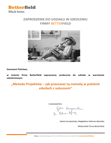 ZAPROSZENIE DO UDZIAŁU W SZKOLENIU FIRMY BETTERFIELD Szanowni Państwo, w imieniu firmy Betterfield zapraszamy serdecznie do udziału w warsztacie szkoleniowym: „Metoda Projektów – jak pracować tą metodą w polskich szkołach z sukcesem” Z poważaniem, Sylwia Szczepańska, Magdalena Helman-Barylska Właścicielki Firmy Betterfield Biuro: ul.Paderewskiego 11/13, 61-740 Poznań, tel. 61 624 37 86, www.betterfield.pl O szkoleniu Macie Państwo niepowtarzalną okazję szkolić się z Metody Projektów (Project Approach) u specjalistów, którzy swoją wiedzę i doświadczenie zdobywali między innymi w Stanach Zjednoczonych na Uniwersytecie w Illinois u współtwórczyni tej metody - prof. Lilian Katz. Jesteśmy twórcami innowacyjnego programu nauczania “Mali Badacze – Wielcy Odkrywcy”, który wprowadza Metodę Projektów do polskiej edukacji wczesnoszkolnej. Program ten powstał na zlecenie ORE i Ministerstwa Edukacji Narodowej i jest przez te instytucje w pełni rekomendowany. Korzyści ze szkolenia: Nauczymy Cię, czym tak na prawdę jest Metoda Projektów. Pokażemy jak tą metodą pracować w szkole łącząc ją z podstawą programową i podręcznikiem rekomendowanym przez Ministerstwo. Pokażemy Ci program nauczania, na którym możesz się oprzeć w codziennej pracy Metodą Projektów. Damy Ci też bardzo praktyczne i użyteczne narzędzia do pracy tą metodą z dziećmi przez cały rok szkolny! Grupa docelowa Grupę docelową stanowić będą nauczyciele nauczania wczesnoszkolnego. Metodologia Metodologia naszych działań oparta jest o interaktywne techniki, mające zachęcić uczestników szkoleń do osobistego zaangażowania w proces uczenia się. W prowadzonym przez nas warsztacie, nauczyciel osobiście doświadczy tworzenia projektu badawczego – dzięki temu pozna poprzez osobiste doświadczenie procesy poznawcze, emocjonalne i społeczne jakie zachodzą podczas pracy tą metodą. Szkolenie będzie prowadzone w małych grupach. Biuro: ul.Paderewskiego 11/13, 61-740 Poznań, tel. 61 624 37 86, www.betterfield.pl Program szkolenia Metoda Projektów Project Approach – Podejścia Badawczego według prof. Lilian Katz rozwija wszystkie kompetencje dziecka zawarte w podstawie programowej na I etapie kształcenia, ze szczególnym uwzględnieniem myślenia naukowego, czyli umiejętności formułowania wniosków opartych na obserwacjach empirycznych dotyczących przyrody i społeczeństwa, oraz uczenia się jako sposobu zaspokajania naturalnej ciekawości świata, odkrywania swoich zainteresowań i przygotowania do dalszej edukacji. Metoda daje ponadto szansę wyboru aktywności dzieciom na różnym poziomie rozwoju, daje więc możliwość efektywnej pracy i naturalnej integracji dzieci ze SPE i bez nich, a także dzieciom w różnym wieku. Praca Metodą Projektów stanowi również kompleksowe i optymalne narzędzie profilaktyki w szkole, ponieważ w trakcie pracy tą metodą dzieci mają możliwość doświadczenia i nauczenia się właściwych relacji w grupie, docenienia współpracy, rozwiązywania konfliktów, umiejętności proszenia o pomoc, satysfakcji ze wspólnego wysiłku, szacunku dla własnej indywidualności, doświadczenia własnej autonomii. Metoda Projektów niezwykle angażuje i aktywizuje dzieci do działań ukierunkowanych na cel, co przeciwdziała nudzie, jednocześnie dzieci uczą się krytycznej oceny docierających do nich informacji, trenują proces dokonywania wyboru, selekcji rzeczy dla nich korzystnych i niekorzystnych. PROGRAM SZKOLENIA: Moduł 1. Wprowadzenie Powitanie uczestników i przedstawienie się trenera. Cele, program, korzyści ze szkolenia, weryfikacja oczekiwań uczestników. Moduł 2. Czym jest Metoda Projektów (Project Approach – prof. Lilian Katz) Geneza Metody Projektów. Metoda Projektów w Polsce i na świecie. Innowacyjność tej metody nauczania. Charakterystyka Metody Projektów. Korzyści dla dzieci i nauczycieli. Moduł 3. Praca warszatowa – poznanie Metody Projektów w praktyce Osobiste doświadczenie nauczycieli – uczestników szkolenia w pracy Metodą Projektów. Prezentowanie wzajemne rezultatu tego procesu uczenia się. Wspólne wypracowanie wniosków do pracy w klasie z dziećmi Metodą Projektów. Moduł 4. Jak program oparty o Metodę Projektów działa w praktyce Przykłady projektów realizowanych w ramach programu w wybranych polskich szkołach. Gościnna wizyta nauczyciela, który pracuje tą metodą – praktyczne dzielenie się jego doświadczeniami z pracy “Metodą Projektów”. Analiza i dyskusja, co daje praca “Metodą Projektów “ dzieciom i nauczycielom. Biuro: ul.Paderewskiego 11/13, 61-740 Poznań, tel. 61 624 37 86, www.betterfield.pl Trenerzy Magdalena Helman- Barylska Absolwent Psychologii Klinicznej i Psychologii Edukacyjnej na Uniwersytecie im. A. Mickiewicza w Poznaniu. Jako jedna z dwóch osób w Polsce jest Absolwentem kursu „Project Approach” na University of Illions w USA- prowadzonego przez samą twórczynię tej metody prof. Lilian Katz oraz wielu kursów i szkoleń poszerzających umiejętności pracy z nauczycielami. Doświadczony trener i konsultant, przeszkoliła dużą liczbę nauczycieli i dyrektorów przedszkoli i szkół. Sylwia Szczepańska Z wykształcenia psycholog edukacji i pracy. Od 1997 roku trener konsultant. Współtworzyła i realizowała projekty dla dyrektorów, nauczycieli przedszkolnych, szkolnych oraz gimnazjalnych. Ukończyła szereg warsztatów szkoleniowych poszerzających umiejętności pracy z nauczycielami w zakresie tworzenia optymalnych warunków dla rozwoju i uczenia się dzieci. Brała udział w opracowaniu wielu materiałów szkoleniowych dla nauczycieli przedszkolnych i szkolnych oraz narzędzi badawczych służących diagnozie środowiska szkolnego. Logistyka projektu Proponowany przez nas warsztat szkoleniowy realizowany jest w ciągu 1,5 dnia w małych grupach (max. 12 osób) Najbliższy termin szkolenia to: 18-19.09.2015 Miej