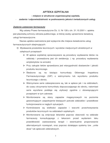 APTEKA SZPITALNA - miejsce w strukturze organizacyjnej szpitala, - zadania i odpowiedzialno w podnoszeniu jako ci wiadczonych usług. Zadania ustawowe farmaceuty Wg ustawy Prawo farmaceutyczne Dz. U. Nr 126 z dn. 31.10.2001 r. apteka jest placówk ochrony zdrowia publicznego, w której osoby uprawnione wiadcz usługi farmaceutyczne. Nazwa apteka zastrze ona jest wył cznie dla miejsca wiadczenia usług farmaceutycznych obejmuj cych: 1) Wydawanie produktów leczniczych i wyrobów medycznych okre lonych w odr bnych przepisach W aptece szpitalnej opracowywane s procedury wydawania leków na oddziały i prowadzona jest ich ewidencja. ( np. procedury wydawania antybiotyków na wnioski) Przy zakupie leków sprawdzana jest wiarygodno dostawców i jako produktu leczniczego. ledzone s na bie co komunikaty Głównego Inspektora Farmaceutycznego (GIF) o wstrzymaniu lub wycofaniu produktu leczniczego z obrotu. Wstrzymane serie zabezpieczane s , tak w aptece jak i na oddziałach, do czasu otrzymania komunikatu dopuszczaj cego do obrotu, natomiast serie wycofane poddaje si utylizacji zgodnie z obowi zuj cymi przepisami w tym zakresie. Monitorowane s stany zapasów gwarantuj cym zaspokojenie bie magazynowych na poziomie cych potrzeb oddziałów i prawidłowe funkcjonowanie w nagłych sytuacjach. Kontrolowane s wielko ci zapasów i warunki przechowywania produktów leczniczych na oddziałach szpitalnych. Monitorowane s farmaceuty prawidłowo ordynacje lekarskie poprzez obecno konsultuj cego z zastosowanej lekarzem terapii i przed na oddziale wydaniem ewentualnie leku proponowanie alternatywnych rozwi za , oraz poprzez działaj ce systemy tzw. „unite dose” lub apteczek oddziałowych. 1 2) Sporz dzanie leków recepturowych i aptecznych Pozwala to dostosowa posta i dawk leku do indywidualnych potrzeb pacjenta. Farmakopea Polska nakłada na farmaceut obowi zek zweryfikowania ka dej recepty i wyeliminowania z niej ewentualnych bł dów lekarskich. 3) Udzielanie informacji dotycz cych produktów leczniczych i wyrobów medycznych Obowi zkiem farmaceuty jest przekazywanie lekarzowi pełnej i obiektywnej informacji o leku i czuwanie nad prawidłowym przebiegiem farmakoterapii. Jednym z najpowa niejszych problemów współczesnej medycyny jest nieskuteczno farmakoterapii. Dane z pi miennictwa mówi , e około 50% przepisywanych leków stosuje si nieprawidłowo. Jest to przyczyn niepowodze terapeutycznych, cierpie pacjenta oraz wysokich kosztów opieki zdrowotnej zwi zanej z przedłu on hospitalizacj oraz leczeniem powikła polekowych. Najcz stsze problemy lekowe to: Zastosowany niewła ciwy lek Zastosowana niewła ciwa dawka lub dawkowanie Zbyt długi lub zbyt krótki czas leczenia Nieuwzgl dnienie niewydolno ci układów eliminuj cych Zb dna farmakoterapia Niewła ciwe przechowywanie leków na oddziale Interakcje lekowe Nieprzestrzeganie zalece dotycz cych przygotowania i podania leku Doradztwo w zakresie opieki zdrowotnej dotycz ce produktów leczniczych, w wietle ich coraz wi kszej dost pno ci, jest spraw wykształcenia jest w stanie przekaza bardzo istotn . Farmaceuta z racji informacje w sposób obiektywny, maj c na wzgl dzie wył cznie dobro pacjenta i skuteczno przedstawionych informacji mog by terapii. Konsekwencje bł dnie powa ne i prowadzi do np. nadu ywania stosowania jednego (reklama), a zaprzestania stosowania innych, warto ciowych i sprawdzonych preparatów. 4) Sporz dzanie leków do ywienia pozajelitowego i dojelitowego 5) Przygotowywanie leków w dawkach dziennych w tym leków cytostatycznych 2 Obliczanie prawidłowej, indywidualnej dawki oraz zapewnienie wła ciwych warunków do przygotowania i podania preparatu cytostatycznego, zarówno dla pacjenta jak dla personelu. 6) Wytwarzanie płynów infuzyjnych 7) Organizowanie zaopatrzenia szpitala w produkty lecznicze i wyroby medyczne Odbywa si zgodnie z ustaw - Prawo Zamówie Publicznych 8) Przygotowywanie roztworów do hemodializy i dializy otrzewnowej 9) Udział w monitorowaniu działa niepo Celem jest wychwycenie dotychczas danych leków nieznanych zagro e zwi zanych ze stosowaniem danego leku. Pozwala na: - okre lenie czynników ryzyka - okre lenie, dla jakich grup pacjentów spodziewane korzy ci przewy szaj ryzyko - okre lenie przeciwwskaza i zalecanych rodków ostro no ci - ograniczenie stosowania, a w skrajnych przypadkach do jego wycofania z lecznictwa Obecne przepisy nało yły na lekarza i farmaceut obserwowanych u pacjenta niepo obowi zek prawny zgłaszania danych reakcji na lek. W wielu krajach gdzie system zgłaszania NDL działa prawidłowo farmaceuta szpitalny uczestniczy aktywnie w procesie leczenia, jest doradc lekarza, ma dost p do dokumentacji medycznej. W Polsce taki system nie istnieje. Apteki szpitalne uczestnicz w systemie monitorowania jedynie powikła polekowych w tak zwanych reklamacjach klinicznych, kiedy lekarz podejrzewa zł jako produktu. Wówczas za po rednictwem apteki szpitalnej dokumentacja przypadku przekazywana jest do Inspektora Nadzoru Farmaceutycznego celem zbadania leku z tej podanej serii. 10) Udział w badaniach klinicznych prowadzonych na terenie szpitala Farmaceuta szpitalny powinien uczestniczy w ka dym badaniu klinicznym i zajmowa si całokształtem spraw zwi zanych z badanym lekiem. Po zapoznaniu si z dokumentacj dotycz c badanego produktu leczniczego farmaceuta zamawia, przechowuje, przygotowuje do podania oraz wydaje przygotowan dawk dla danego pacjenta. Prowadzi równie indywidualnie ewidencje próbek do bada klinicznych. Wł czenie farmaceuty w proces przeprowadzenia bada obiektywno i wiarygodno otrzymywanych wyników. 11) Udział w racjonalizacji farmakoterapii 3 klinicznych zwi ksza Apteka szpitalna przekształca si w struktur szpitala o charakterze wielofunkcyjnym, sprawuj c piecz nad cał gospodark lekiem w szpitalu, której głównym zadaniem jest zapewnienie bezpiecznej i skutecznej farmakoterapii wszystkim leczonym – to obraz apteki z opracowa WHO i Europejskiego Stowarzyszenia Farmacj