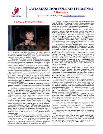 GWIAZDOZBIÓR POLSKIEJ PIOSENKI 2 listopada SKORPION Opracowanie: Wojciech Dąbrowski www.spotkaniazpiosenka.org SŁAWA PRZYBYLSKA (ur. 2 listopada 1931 roku, Międzyrzec Podlaski), popularna piosenkarka z przełomu lat pięćdziesiątych i sześćdziesiątych, zwana polską Juliette Greco, miała zostać, zgodnie z wolą ojca, zakonnicą, ale marzyła o malarstwie i rzeźbie. Kształciła się w Państwowym Zakładzie WychowawczoNaukowym im. Tadeusza Kościuszki w Krzeszowicach (1946), zorganizowanym przez dr Stanisława Jedlewskiego, ukończyła Liceum Sztuk Plastycznych im. Wojciecha Gersona (1950) i Szkołę Główną Służby Zagranicznej w Warszawie (Wydział Handlu Zagranicznego, ekonomika i planowanie transportu, 1954). W czasie studiów zorganizowała tercet żeński Syrenki, a jako solistka debiutowała w warszawskim STS (piosenka Kramarz, sł. Agnieszka Osiecka, 1956). W 1957 roku zdobyła I miejsce (przed Haliną Kunicką), w radiowym konkursie piosenki (za interpretację włoskiej piosenki Luna), a w telewizyjnym konkursie Zapraszamy na estradę, otrzymała jednogłośnie, jako jedyna, od wszystkich jurorów (Stefania Grodzieńska, Lidia Wysocka i przewodniczący Jerzy Waldorff) maksymalną liczbę punktów i miano polskiej Edith Piaf. Uczyła się śpiewu u prof. Wandy Wermińskiej, ukończyła Studium Estradowe Polskiego Radia pod opieką prof. Aleksandra Bardiniego. Śpiewała w warszawskiej Stodole (program Jutro będzie lepiej, reż. Jan Biczycki, prem. 23 października 1959 roku), teatrzykach Czarna Kaczka i Tingel-Tangel (program Piosenka na dziś, reż. Wojciech Solarz, sł. Agnieszka Osiecka i Andrzej Jarecki, z udziałem zespołu jazzowego Krzysztofa Komedy, 1961), oraz telewizyjnym Teatrze Piosenki. Pierwszą płytę Stare niezapomniane przeboje nagrała z zespołem Jerzego Abratowskiego. Przypomniała w niej, jako pierwsza, piosenki okresu dwudziestolecia międzywojennego: Jak trudno jest zapomnieć (muz. Henryk Wars, sł. Jerzy Jurandot, romans z filmu Manewry miłosne, 1935), Już nigdy (muz. Jerzy Petersburski, sł. Andrzej Włast), Kto inny nie umiałby (muz. Mabel Wayne, sł. polskie Marian Hemar), Pensylwania (muz. R. A. King, sł. polskie Marian Hemar), Tango Bolero i Tango Notturno (muz. H. O. Borgman, sł. polskie Andrzej Włast), Wspomnij mnie. W 1960 roku, jako pierwsza polska wokalistka, wystąpiła z własnym recitalem, zdobyła Złoty Medal na Festiwalu Piosenki w Pesaro (29-31 lipca, Włochy), śpiewając piosenkę Kiedy kwitną czereśnie (muz. Jerzy Gert, sł. Tadeusz Śliwiak), koncertowała w Rzymie, NRD i we Lwowie, zdobyła tytuł Ulubionego piosenkarza w konkursie radiowym i plebiscycie czytelników Nowej Wsi. Zdobyła II nagrodę za interpretację walców Kuglarze (muz. Henryk Kleyne, sł. Tadeusz Urgacz) i Stary cylinder (muz. Marek Sart, sł. Kazimierz Winkler) na I MFP w Sopocie w 1961 roku (I nagrodę zdobyła Irena Santor za walc Embarras). Śpiewała Czerwone Maki (muz. Alfred Schutz, sł. Feliks Konarski), w filmie Popiół i diament (reż. Andrzej Wajda), piosenkę Pamiętasz była jesień (muz. Lucjan Kaszycki, sł. Andrzej Czekalski i Ryszard Pluciński) w filmie Pożegnania (reż. Wojciech Has), Piosenka o wieczornym gościu (muz. Lucjan Kaszycki, sł. Ludwik Jerzy Kern) w filmie Rozstanie (reż. Wojciech Has), Była pogoda (muz. Krzysztof Komeda) w filmie Niewinni czarodzieje (reż. Andrzej Wajda), Kriegsgefangenpost (muz. Andrzej Markowski) w filmie Zezowate szczęście (reż. Andrzej Munk). Wylansowała przeboje: Gorącą nocą (muz. Ryszard Sielicki, sł. Mirosław Łebkowski), Kochankowie z ulicy Kamiennej, Okularnicy, Widzisz mała (muz. Jarosław Abramow, sł. Agnieszka Osiecka), To wszystko z nudów (muz. Lucjan Kaszycki, sł. Agnieszka Osiecka), Krakowska kwiaciarka (muz. Jerzy Gert, sł. Tadeusz Śliwiak), Słodkie fiołki (sł. Marek Dagnan i Bogusław Choiński), Słowo daję, że nie (muz. Jacek Szczygieł, sł. Ola Obarska), Taka jestem zakochana (muz. Jacek Szczygieł, sł. Krystyna Żywulska), walc Zakochani (muz. Władysław Szpilman, sł. Bronisław Brok), Z kujawiakiem (muz. Jerzy Wasowski, sł. Agnieszka Osiecka, II nagroda na VIII KFPP w Opolu, 1970), Żyje się raz (muz. Adam Markiewicz, sł. Krystyna Żywulska). Spopularyzowała piosenki zagraniczne: ballada Gdzie są kwiaty z tamtych lat (muz. Pete Saeger, sł. polskie Wanda Sieradzka) z rep. Marleny Dietrich, Malaguena (muz. Remiques, sł. Ola Obarska), Miłość w Portofino (muz. F. Buscaglione, sł. Agnieszka Osiecka), Niekrasiwaja i Tbiliso (sł. Ola Obarska), Pieśń o złej Murce i Siedzieliśmy na dachu (sł. Agnieszka Osiecka), Śnieg pada (muz. A. Eszpaj, sł. Wiktor Maksymkin) z filmu Kariera Dimy Gorina. Śpiewała songi Brechta, piosenki Bułata Okudżawy (spektakl Związek przyjacielski z Wojciechem Siemionem, warszawski Teatr Prochownia, 1974), pieśni Żydów polskich w języku jidysz (spektakle w Teatrze na Targówku Jak u Chagalla, reż. Szymon Szurmiej, 1983, Pieśń o wymordowanym narodzie, Bukiecik alpejskich fiołków wg Pamiętnika Mary Berg, 1986, Stół Mordechaja Gebirtiga wg poematu Anny Kamieńskiej, 1987, Teatr straceńców, Festiwal teatralny w Tbilisi, recital Shalom, monodram Powrót do Mezricz). Nagrała kilkanaście płyt: Gorącą nocą (1958), Pamiętasz była jesień (1963), Ballady i piosenki (1965, 1966), U brzegów Candle Rock (1970). Koncertowała niemal w wszystkich krajach europejskich, w Związku Radzieckim, Izraelu, Stanach Zjednoczonych, Kanadzie i Australii. Przez pewien czas mieszkała w Szczawnicy. Była przewodniczącą Stowarzyszenia Literacko-Artystycznego im. Czesława Miłosza w Szczawnicy i organizatorką Międzynarodowego Festiwalu Słowa. Obecnie mieszka w Otwocku. Odznaczona Krzyżem Kawalerskim Orderu Odrodzenia Polski (1982) i Krzyżem Oficerskim Orderu Odrodzenia Polski (2000). Biograficzną książkę Oblicza Sławy (2002) napisali Róża Jaśkowska i Jan Krzyżanowski, mąż Sławy Przybylskiej,
