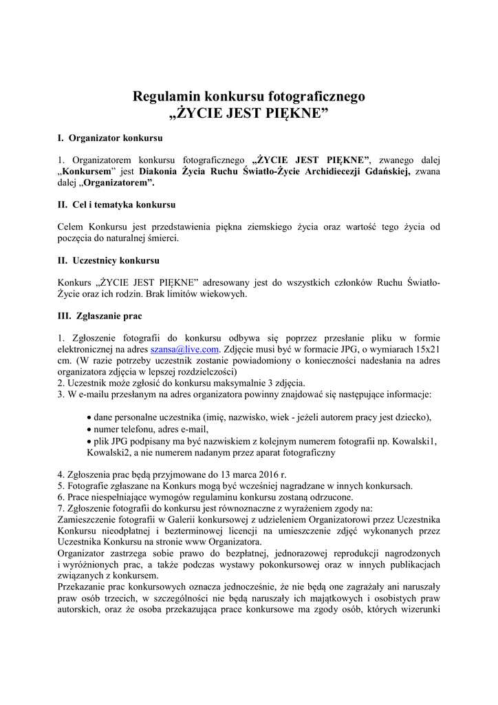 Regulamin konkursu fotograficznego „ŻYCIE JEST PIĘKNE” I. Organizator konkursu 1. Organizatorem konkursu fotograficznego „ŻYCIE JEST PIĘKNE”, zwanego dalej „Konkursem” jest Diakonia Życia Ruchu Światło-Życie Archidiecezji Gdańskiej, zwana dalej „Organizatorem”. II. Cel i tematyka konkursu Celem Konkursu jest przedstawienia piękna ziemskiego życia oraz wartość tego życia od poczęcia do naturalnej śmierci. II. Uczestnicy konkursu Konkurs „ŻYCIE JEST PIĘKNE” adresowany jest do wszystkich członków Ruchu ŚwiatłoŻycie oraz ich rodzin. Brak limitów wiekowych. III. Zgłaszanie prac 1. Zgłoszenie fotografii do konkursu odbywa się poprzez przesłanie pliku w formie elektronicznej na adres [email protected]. Zdjęcie musi być w formacie JPG, o wymiarach 15x21 cm. (W razie potrzeby uczestnik zostanie powiadomiony o konieczności nadesłania na adres organizatora zdjęcia w lepszej rozdzielczości) 2. Uczestnik może zgłosić do konkursu maksymalnie 3 zdjęcia. 3. W e-mailu przesłanym na adres organizatora powinny znajdować się następujące informacje:  dane personalne uczestnika (imię, nazwisko, wiek - jeżeli autorem pracy jest dziecko),  numer telefonu, adres e-mail,  plik JPG podpisany ma być nazwiskiem z kolejnym numerem fotografii np. Kowalski1, Kowalski2, a nie numerem nadanym przez aparat fotograficzny 4. Zgłoszenia prac będą przyjmowane do 13 marca 2016 r. 5. Fotografie zgłaszane na Konkurs mogą być wcześniej nagradzane w innych konkursach. 6. Prace niespełniające wymogów regulaminu konkursu zostaną odrzucone. 7. Zgłoszenie fotografii do konkursu jest równoznaczne z wyrażeniem zgody na: Zamieszczenie fotografii w Galerii konkursowej z udzieleniem Organizatorowi przez Uczestnika Konkursu nieodpłatnej i bezterminowej licencji na umieszczenie zdjęć wykonanych przez Uczestnika Konkursu na stronie www Organizatora. Organizator zastrzega sobie prawo do bezpłatnej, jednorazowej reprodukcji nagrodzonych i wyróżnionych prac, a także podczas wystawy pokonkursowej oraz w innych publikacjach związanych z konkursem. Przekazanie prac konkursowych oznacza jednocześnie, że nie będą one zagrażały ani naruszały praw osób trzecich, w szczególności nie będą naruszały ich majątkowych i osobistych praw autorskich, oraz że osoba przekazująca prace konkursowe ma zgody osób, których wizerunki utrwalono na fotografiach, i uprawnienia do wyrażania zgody na wykorzystanie tych wizerunków w zakresie opisanym w punkcie 7 powyżej. W przypadku wystąpienia przez osobę trzecią z roszczeniami wynikającymi z tytułu naruszenia praw określonych powyżej osoba przekazująca zrekompensuje Organizatorowi, jako wyłącznie odpowiedzialna, koszty poniesione w związku ze skierowaniem przeciwko niemu roszczeń odszkodowawczych, zwalniając Organizatora od wszelkich zobowiązań, jakie powstaną z tego tytułu. IV. Ocena prac i rozstrzygnięcie konkursu 1.Wszystkie zdjęcia nadesłane do Konkursu podlegają ocenie Jury powołanego przez Organizatora. 2. Jury dokonuje oceny po zakończeniu okresu trwania Konkursu biorąc pod uwagę wartość artystyczną, jakość i oryginalność nadesłanych fotografii. 3. Spośród nadesłanych prac Jury wybierze trzy prace, które zajmą pierwsze, drugie i trzecie miejsce. 4. Jury wybierze również prace wyróżnione – o ilości tych prac Jury zadecyduje podczas obrad. 5. Decyzje Jury są ostateczne i wiążące dla wszystkich uczestników Konkursu. 6. O decyzji Jury nagrodzone i wyróżnione osoby zostaną powiadomione telefonicznie i drogą elektroniczną. 7. Decyzje Jury zostaną ogłoszone w Dniu Świętości Życia po Mszy Św. Domowego Kościoła, tj. 04.04.2016r. Kościół Zesłania Ducha Św. w Sopocie – Brodwinie, Msza o godz. 19:15. 8. Uroczysta prezentacja wyróżnionych prac oraz zwycięzców Konkursu nastąpi 04.04.2016 w Kościele Zesłania Ducha Św. w Sopocie – Brodwinie (Galeria do obejrzenia po Mszy Św. o godz. 19:15). V. Nagrody 1. Zwycięzcy Konkursu otrzymają następujące nagrody:  za zajęcie I miejsca – bilet do kina dla całej rodziny, dyplom i ekspozycja pracy na wystawie pokonkursowej  za zajęcie II miejsca – książki, dyplom i ekspozycja pracy na wystawie pokonkursowej  za zajęcie III miejsca – słodkości, dyplom i ekspozycja pracy na wystawie pokonkursowej 2. Jury ma prawo do innego podziału puli nagród. VI. Postanowienia końcowe 1. Regulamin Konkursu dostępny jest na stronie internetowej www.gdansk.oaza.pl, 2. W sprawach nieuregulowanych niniejszym regulaminem zastosowanie znajdą odpowiednie przepisy prawa polskiego. 3. Konkurs nie jest „grą losową” w rozumieniu ustawy z 29 lipca 1992 r. o grach losowych i zakładach wzajemnych (Dz. U. Nr 68, poz. 341, z późn. zm.). 4. Zgłoszenie fotografii do Konkursu i wysłanie Formularza Zgłoszeniowego Konkursu jest jednoznaczne z przyjęciem przez uczestnika Konkursu warunków niniejszego regulaminu. Przesłanie fotografii jest jednoznaczne z oświadczeniem posiadania praw autorskich oraz wyrażeniem zgody na przetwarzanie danych osobowych i korzystanie z nich przez organizatorów konkursu w celach związanych z organizacją wystawy i wyłonieniem zwycięzców a także w przypadku zamieszczenia wybranych prac oraz informacji o całym wydarzeniu w mediach. Zgodnie z ustawą z dnia 29.08.1997 roku o Ochronie danych Osobowych (Dz. U. z 2002 roku Nr 101 poz. 926)