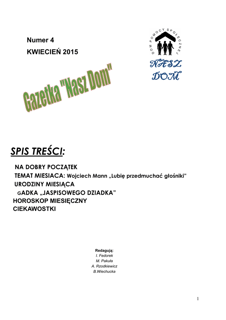 Numer 4 KWIECIEŃ 2015 NASZ DOM SPIS TREŚCI:   NA DOBRY POCZĄTEK TEMAT MIESIACA: Wojciech Mann „Lubię przedmuchać głośniki” URODZINY MIESIĄCA GADKA „JASPISOWEGO DZIADKA” HOROSKOP MIESIĘCZNY CIEKAWOSTKI z z Redagują: I. Fedorek M. Pakuła A. Rzodkiewicz B.Wiechucka 1 Na DOBRY POCZĄTEK „Dopóki człowiek się śmieje nie przegrał”. Andrew Vachss TEMAT MIESIĄCA Wojciech Mann: Lubię przedmuchać głośniki Słucha muzyki od 50 lat. Konserwa? A skąd! "Czasem trzeba puścić kopniaka, żeby membrany poczuły", twierdzi Wojciech Mann, wyznając swoją słabość do metalowców. Mówi też, że jeśli ktoś nie podziela jego gustu, to go nienawidzi. Okoliczność łagodząca? To wszystko z miłości do muzyki. Tak wielkiej i czułej, że swoje stare winylowe płyty... kąpie. Mam najpierw sprawę techniczną. Wojciech Mann: - ? Przed chwilą przeczytałam, że pan lamentuje nad niepoprawnym wyjmowaniem płyt winylowych z opakowania. Moda na winyle wróciła, pytam więc eksperta o instrukcję obsługi. - No... proszę pani, wewnętrzna koperta nie może mieć wylotu w tym samym miejscu, co zewnętrzna! Bo płyta może wypaść. Po wtóre, trzeba pilnować, żeby nie dotykać winylu paluchami. Bo zostaje tłusty ślad, do niego przykleja się kurz, igła potem wbija ten kurz w płytę i z tego robią się trzaski. Są ortodoksi, którzy biorą płytę do ręki tylko w białych rękawiczkach. Albo tacy, którzy - gdy na naklejce zrobi się lekkuchne wgniecenie, bo płyta położona na talerzu gramofonu nie od razu trafiła na bolec - uważają, że to obniża wartość kolekcjonerską. Do pielęgnacji używają ściereczek. Albo specjalnego urządzenia, takiego dość drogiego "piórnika", do którego się wlewa wodę destylowaną i specjalny płyn, a potem chwytaczkami z gąbki się tę płytę kąpie. Ale pan tego nie robi?! - Stare płyty, owszem, kąpię. To ma działanie antystatyczne, kurz potem tak nie przylega. 2 W tej sytuacji się cieszę, że pana najnowszy album "Nieprzeboje 2" jest na CD, a nie na winylu. Kiedy słuchałam tych dwóch płyt, przyszło mi do głowy zapomniane słowo "urocze". Ale to jedyny wspólny mianownik, bo utwory są od Sasa do lasa. Rock, blues, country. Skocznie, balladowo... Jaki był klucz? - Zebrałem piosenki, które moim zdaniem są dobre, a nawet bardzo dobre, ale z różnych przyczyn nie królowały na listach bestsellerów. A co dla pana jest dobre i bardzo dobre? - Czeka pani zapewne na muzykologiczne wyjaśnienia, ale dla mnie jedynym kluczem jest to, czy piosenka mi coś robi, czy nie robi. Ale że noga sama podskakuje? - Oczywiście, że chodzi między innymi o rytm. I noga to objaw pierwszy. Ale to jeszcze nie jest prawdziwe "robienie". Wie pani, kiedy czuję, że piosenka jest dobra? Kiedy chce mi się zapalić papierosa. Przecież pan nie pali! - No właśnie! Od piętnastu lat. A mimo to... Czyli dobra muzyka prowadzi na manowce. - Jeśli się jest mężczyzną twardym, o postanowieniach żelaznych - jak ja - to nie prowadzi. Jest rodzaj emocji, które wykraczają poza estetyczną ocenę piosenki. Czuję, więc wiem. I chce pan dzielić się tym ze światem? - Kiedyś byłem wręcz tyranem. Jeśli utwór mnie bardzo przejmował, usiłowałem skłonić do słuchania i podziwiania całe otoczenie. Dziś się poprawiłem. Ale zdarza się, że wyciągam płytę, nastawiam na cały regulator bo lubię jak muzyka wypełnia przestrzeń - i sprawdzam, czy ktoś odczuwa podobnie. A gdy nie odczuwa? - To go nienawidzę! A kiedy to ktoś bliski, z rodziny? - No to nienawidzę krócej. (uśmiech) 3 Na tych płytach jest dwa razy po 16 utworów. Jaki był współczynnik sita? - Ile przesłuchałem, żeby wybrać? Około 200. I tyle dobrych rzeczy musiałem odrzucić, że po cichu układam sobie już "Nieprzeboje 3". Na "dwójce" są nieznane w mainstreamie zespoły o urzekających nazwach. Federal Charm, Texas Tornados. Anglojęzyczne. Myślał pan o Nieprzebojach francuskich, włoskich? - W pierwszej części wrzuciłem dwa utwory po hiszpańsku, ale potem sam się wystraszyłem, czy to dla odbiorcy nie jest mylące. Mam wrażenie, że ludzie potrzebują jasnych komunikatów. Kiedyś Mleczko dał taki komentarz pod jednym z rysunków: "Najlepiej, żeby przy wszystkim było napisane, czy to jest na poważnie, czy dla jaj". Poza tym moi słuchacze mają przyzwyczajenia. I potrafią mnie skarcić. Mam takich, co piszą: "Po co pan tę miauczącą Francuzkę wstawił do porządnej audycji?". Trzymam się więc muzyki anglosaskiej, na niej znam się najlepiej. We wstępie do płyty pisze pan: "Popularność nie jest równoznaczna z wartością". To o piosenkach czy bardziej o dzisiejszym świecie? - Słusznie. Widzi pani, ja metryki nie oszukam, dorastałem w czasach, kiedy już samo posiadanie telewizora było czymś wyróżniającym obywatela. W tym telewizorze mieliśmy w porywach dwa programy. Plus trzy w radiu. Liczba źródeł informacji była do ogarnięcia. Teraz jest eksplozja, której sobie nawet nie uświadamiamy. Bo wystarczy w internecie zboczyć ze znanej sobie ścieżki i nagle się otwiera ocean nowych informacji. I teraz pytanie: kto zastąpi nam tamte media, w których treści mieliśmy filtrowane i wartościowane? I cenzurowane. - Oczywiście, zaraz będzie, że przesadzam. No bo dlaczego ktoś ma mi selekcjonować informacje? Ale wbrew pozorom to miewało dobre strony. Nie mówię o ideologii, tylko o tym, że w różnych dziedzinach kulturalnych wypowiadali się autentyczni fachowcy. Dziś, kiedy tych filtrów prawie nie ma, biedny obywatel sam musi się połapać, co jest wartościowe, a co nie. W dodatku często dominuje instynkt stadny: "Przyklejam się do grupy i wartościowanie mam z głowy". Ja się na taki stan nie zgadzam! No to jak żyć? - Najprościej uciekać się do wewnętrznego kompasu. Ale nie każdy go ma, nie każdy umie się nim posługiwać. Jest więc nerwowe szukanie autorytetów. A one zmarnia