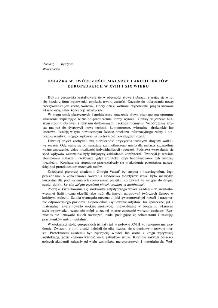 Tomasz Kędziora Warszawa KSIĄŻKA W TWÓRCZOŚCI MALARZY I ARCHITEKTÓW E U R O P E J S K I C H W XVIII I XIX W I E K U Kultura europejska kształtowała się w obecności słowa i obrazu, starając się o to, aby każda z form wypowiedzi uzyskała trwałą wartość. Dążenie do odkrywania nowej rzeczywistości jest cechą twórców, którzy dzięki wolności wypowiedzi pragną kreować własne oryginalne koncepcje artystyczne. W kręgu sztuk plastycznych i architektury znaczenie słowa pisanego ma ogromne znaczenie wspierające wizualno-przestrzenne formy wyrazu. Graficy w jeszcze bliż szym stopniu obcowali z tekstami drukowanymi i rękopiśmiennymi. Współczesny arty sta ma już do dyspozycji nowe techniki komputerowe, wirtualne, drukarskie lub laserowe. Istnieją w tym nowoczesnym świecie przekazu informacyjnego zalety i nie bezpieczeństwa, mogące wpływać na nietrwałość powstających dzieł. Dawniej artyści zdobywali swą niezależność artystyczną trudnymi drogami walki i wyrzeczeń. Oderwanie się od warsztatu rzemieślniczego miało dla malarzy szczególnie ważne znaczenie, dając możliwość indywidualizacji twórczej. Podstawą wyzwalania się spod wpływów warsztatów były inicjatywy zakładania konfraterni. Tworzyli je właśnie zbuntowani malarze i rzeźbiarze, gdyż architekci czyli budowniczowie byli bardziej niezależni. Konfraternie stopniowo przekształcały się w akademie pozostające najczę ściej pod protektoratem możnych rodów. Założyciel pierwszej akademii, Giorgio Vasari' był artystą i historiografem. Jego przekonanie o konieczności tworzenia środowiska teoretyków sztuki było niezwykle korzystne dla podniesienia ich społecznego prestiżu, co zawarł we wstępie do drugiej części dzieła Le vite de' piu eccelenti pittori, scultori et architettori2. Początki kształtowania się środowiska artystycznego wokół akademii w szesnastowiecznej Italii można określić jako wzór dla innych ugrupowań twórczych Europy w kolejnym stuleciu. Sztuka wymagała mecenatu, jaki gwarantował jej rozwój i utrzyma nie odpowiedniego poziomu. Odpowiednie usytuowanie artystów, tak społeczne, jak i materialne, gwarantowało większe możliwości indywidualne w tworzeniu własnego stylu wypowiedzi, czego nie mógł w żadnej mierze zapewnić warsztat cechowy. Rze miosło nie uznawało takich rozwiązań, nadal posługując się schematami i traktując pracowników instrumentalnie. W większości stolic europejskich istniały już w połowie XVIII w. renomowane aka demie. Związani z nimi artyści należeli do elity liczącej się w duchowym rozwoju mia sta. Protektorem akademii był najczęściej władca lub osoba z kręgu wpływowej arystokracji, gdzie ceniono wartość wielu gatunków sztuki. Kierunki rozwoju poszcze gólnych akademii zależały od wielu czynników merytorycznych i materialnych. Wol- Książka w twórczości malarzy i architektów europejskich w XVIII i XIX w. 127 ność artystów działających w akademii miała wartość niewspółmierną względem rze mieślników, lecz statut stanowił pewien zbiór rygorystycznych postanowień obowiązu jących artystów, co w pewnych okresach wzbudzało burzliwe reakcje. W większości akademii posługiwano się kanonami, które określały sposób rysowania i malowania3. Przedmiotem tego artykułu są natomiast książki, jakie czytali lub pisali artyści. In spiracją dla wielu była poezja lub dramaty. Warto podkreślić fakt, że wielu z nich pisało rozprawy na temat wartości malarstwa, na temat procesu twórczego oraz technik stoso wanych w sztukach plastycznych tworząc specjalistyczne podręczniki. Monografie artystów lub opisy ich dzieł stanowią wartościową grupę pism pozostawionych przez twórców najwspanialszych dziel od XVI do XIX w. Wenecki humanista Lodovico Dolce (1508—1578), autor Dialogu o malarstwie, do strzegł w książce istotną inspirację artystyczną4. Uważał, że "jeśli artysta nie jest obyty z narracją historyczną, oraz z opowieściami poetów, nie może on zapanować w sposób właściwy nad elementami stanowiącymi tworzywo inwencji". Dalej w treści tegoż Dia logu zapisał, że „inwencją jest baśń lub historia, którą malarz sam wybiera, bądź mu jest przez innych wskazana jako materia do dzieła, które ma wykonać"5. Wyraźnie oddzielił w swej wypowiedzi źródła inspiracji poetyckiej od historycznej, co pozostaje nadal w zgodzie z jego przekonaniem, że „na pewno trzeba, by malarz miał umysł roz winięty" przez realny i dogłębny kontakt z literaturą. Problem czytelnictwa artystów tamtej epoki jest pełen tajemnic i nieścisłości. Zbyt mało wiemy o stanie podręcznych księgozbiorów w domach i pracowniach mistrzów poważnych dzieł w sensie zachowa nych spisów lub listów czy notatek. W epoce Renesansu pojawiło się przekonanie o potrzebie analitycznego poznawania zjawisk artystycznych i tworzenia dzieł w myśl zasad logicznych i matematycznych. W malarstwie ważny był w tym okresie element perspektywy linearnej. Dla architektów piszących rozprawy o sztuce budowania istotna była wartość osiągnięć starożytności greckiej i rzymskiej. Wyraźnie akcentowano mitologie, które podawały treści symbo liczne w tematach podejmowanych w obrazach i konstrukcjach przestrzennych. Należy tu przedstawić Traktat o architekturze napisany przez Sebastiana Serlio, wydany w Wenecji w 1537 r. Podobnie należy dostrzegać Cztery księgi o architekturze spisane przez Andrea Palladio i drukowane w 1570 r. z podaniem bardzo dokładnych rysun ków, projektów i wzorów inspirowanych wzorami klasycznymi. Książka miała wyposażyć twórcę w wiadomości z zakresu estetyki, historii, literatu ry, filozofii, technologii i teorii sztuki. Z pewnością stawała się źródłem do przybliżenia takich zagadnień, jakich nie nauczano w ówczesnej szkole. Programy, które z natury obejmowały literaturę klasyczną, gramatyki języka gr