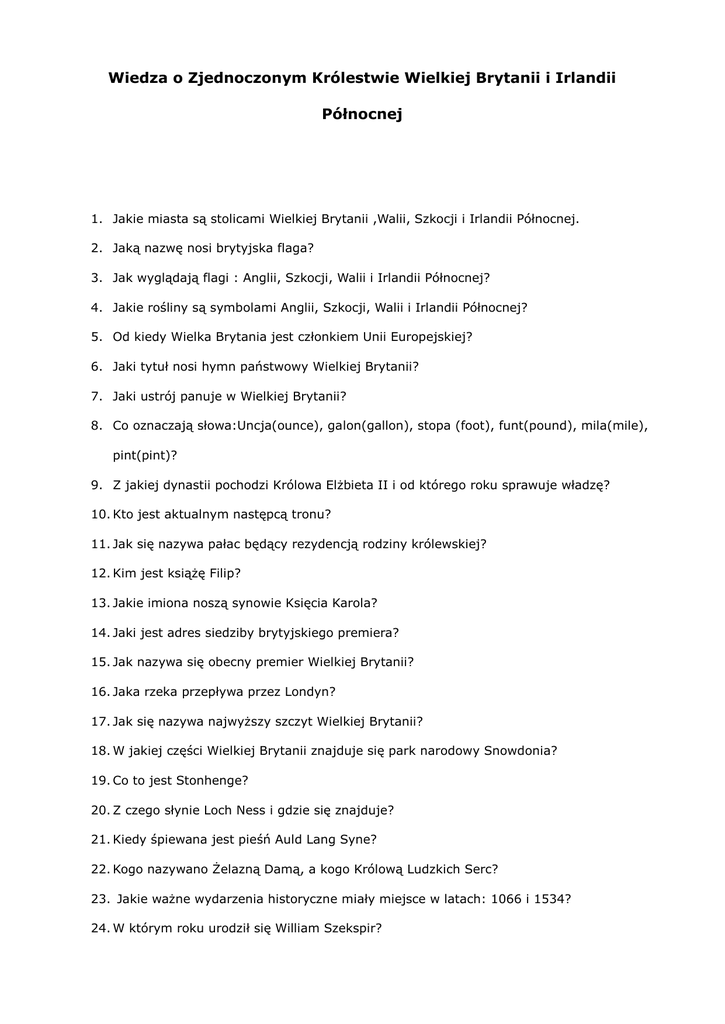 Wiedza o Zjednoczonym Królestwie Wielkiej Brytanii i Irlandii Północnej 1. Jakie miasta są stolicami Wielkiej Brytanii ,Walii, Szkocji i Irlandii Północnej. 2. Jaką nazwę nosi brytyjska flaga? 3. Jak wyglądają flagi : Anglii, Szkocji, Walii i Irlandii Północnej? 4. Jakie rośliny są symbolami Anglii, Szkocji, Walii i Irlandii Północnej? 5. Od kiedy Wielka Brytania jest członkiem Unii Europejskiej? 6. Jaki tytuł nosi hymn państwowy Wielkiej Brytanii? 7. Jaki ustrój panuje w Wielkiej Brytanii? 8. Co oznaczają słowa:Uncja(ounce), galon(gallon), stopa (foot), funt(pound), mila(mile), pint(pint)? 9. Z jakiej dynastii pochodzi Królowa Elżbieta II i od którego roku sprawuje władzę? 10. Kto jest aktualnym następcą tronu? 11. Jak się nazywa pałac będący rezydencją rodziny królewskiej? 12. Kim jest książę Filip? 13. Jakie imiona noszą synowie Księcia Karola? 14. Jaki jest adres siedziby brytyjskiego premiera? 15. Jak nazywa się obecny premier Wielkiej Brytanii? 16. Jaka rzeka przepływa przez Londyn? 17. Jak się nazywa najwyższy szczyt Wielkiej Brytanii? 18. W jakiej części Wielkiej Brytanii znajduje się park narodowy Snowdonia? 19. Co to jest Stonhenge? 20. Z czego słynie Loch Ness i gdzie się znajduje? 21. Kiedy śpiewana jest pieśń Auld Lang Syne? 22. Kogo nazywano Żelazną Damą, a kogo Królową Ludzkich Serc? 23. Jakie ważne wydarzenia historyczne miały miejsce w latach: 1066 i 1534? 24. W którym roku urodził się William Szekspir? 25. Wymień 4 tytuły dramatów Szekspira. 26. Kim byli (są):Alan Alexander Milne, Agatha Christie, Charles Dickens, Arthur Conan Doyle, ,J.RR Tolkien, J.K.Rowling? 27. Kto wymyślił postać Jamesa Bonda? 28. Jak się nazywa najpopularniejsza brytyjska państwowa stacja telewizyjna i radiowa? 29. Jak się nazywa słynny zespół kortów tenisowych w Londynie? 30. Jaką postać grał Rowan Atkinson? 31. Kto założył muzeum figur woskowych w Londynie? 32. Jak się nazywają dwa najstarsze uniwersytety brytyjskie i w którym wieku powstały? 33. Z czego słynie szkoła w Eaton? 34. Czyj pomnik znajduje się na Trafalgar Square? 35. Co to jest London Eye? 36. Z czego słynie Greenwich? 37. Gdzie przechowywane są królewskie klejnoty koronacyjne? 38. Co oznaczają słowa :kilt, tartan i haggis ? 39. Kiedy, gdzie i w jaki sposób jest obchodzony Dzień Świętego Patryka (St. Patrick's Day)? 40. Jakie święto obchodzone jest 5 listopada? 41. Czym jest Big Ben? 42. Jak jest potocznie nazywany brytyjski policjant? 43. Jakiego koloru są tradycyjne londyńskie taksówki? 44. Jaka waluta obowiązuje w Wielkiej Brytanii? 45. W którym roku otwarto londyńskie metro? 46. Kiedy obchodzony jest Boxing Day? 47. Jaka jest główna religia w Wielkiej Brytanii? 48. Jakie nazwy noszą izby brytyjskiego parlamentu? 49. Kiedy i gdzie obchodzone jest święto Hogmanay? 50. Jak się nazywa najbardziej znane londyńskie lotnisko?
