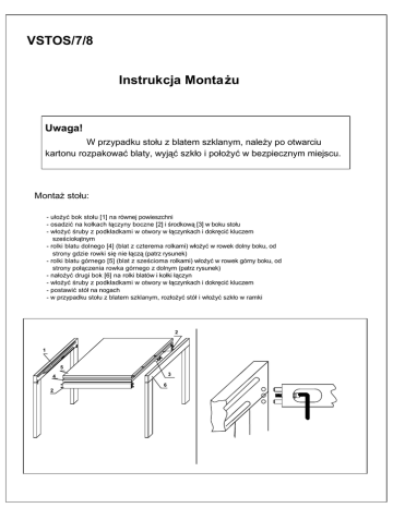 VSTOS/7/8 Instrukcja Monta ¿u Uwaga! W przypadku stoùu z blatem szklanym, nale¿y po otwarciu kartonu rozpakowaã blaty, wyj¹ã szkùo i poùo¿yã w bezpiecznym miejscu. Monta¿ stoùu: - uùo¿yã bok stoùu [1] na równej powieszchni - osadziã na koùkach ù¹czyny boczne [2] i œrodkow¹ [3] w boku stoùu - wùo¿yã œruby z podkùadkami w otwory w ù¹czynkach i dokrêciã kluczem szeœciok¹tnym - rolki blatu dolnego [4] (blat z czterema rolkami) wùo¿yã w rowek dolny boku, od strony gdzie rowki siê nie ù¹cz¹ (patrz rysunek) - rolki blatu górnego [5] (blat z szeœcioma rolkami) wùo¿yã w rowek górny boku, od strony poù¹czenia rowka górnego z dolnym (patrz rysunek) - naùo¿yã drugi bok [6] na rolki blatów i koùki ù¹czyn - wùo¿yã œruby z podkùadkami w otwory w ù¹czynkach i dokrêciã kluczem - postawiã stóù na nogach - w przypadku stoùu z blatem szklanym, rozùo¿yã stóù i wùo¿yã szkùo w ramki 2 1 4 2 5 3 6