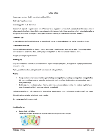 Miau Miau Klasyczna gra karciana dla 2-5 uczestników od 5 do 99 lat. Ilustracje: Yayo Kawamura Czas rozgrywki: ok. 5- 10 minut Na czterech łapkach i w gotowości! Miau! Wszyscy chcą się pozbyć swoich kart, ale żeby to zrobić trzeba mieć w ręku odpowiednie koty. Gracz, który przy odpowiedniej taktyce i odrobinie szczęścia wyłoży ostatnią kocią kartę w nagrodę otrzymuje figurkę kota. Wygrywa ten komu uda się jako pierwszemu zdobyć dwa koty. Zawartość gry: 32 kocie karty w 4 różnych kolorach, 20 specjalnych kart w 4 różnych kolorach, 6 kotów, instrukcja do gry. Przygotowanie do gry: Wymieszajcie wszystkie karty. Każdy z graczy otrzymuje 5 kart i zakryte trzyma je w ręku. Z pozostałych kart utwórzcie stosik po środku stołu. Odkryjcie pierwszą z kart ze stosiku i ułóżcie widoczną obok. Przygotujcie do gry figurki kotów. Przebieg gry: Grajcie w kolejności kierunku ruchu wskazówek zegara. Rozpoczyna gracz, który potrafi najlepiej naśladować mruczenie kota. Wyłóż, jeżeli to możliwe jedną z twoich kart na stosik odkrytych kart. Ważne: Twoja karta musi przedstawiać innego kota tego samego koloru lub tego samego kota innego koloru jak karta znajdująca się na wierzchu stosiku odkrytych kart ( z wyjątkiem Kota Imprezowicza, patrz specjalne karty) Dobierz jedną z kart z zakrytego stosiku, jeżeli nie posiadasz odpowiedniej. Nie możesz użyć karty od razu, lecz dopiero kiedy znowu przyjedzie twoja kolej. Kiedy wszystkie karty z zakrytego stosiku się skończą, wymieszajcie karty z odkrytego stosiku i utwórzcie nowy. Odkryjcie wierzchnią kartę i ułóżcie obok stosiku. Grę kontynuuje kolejny uczestnik. Specjalne karty: Kotka Dobra Wróżka Ten kto położy kartę decyduje w jakim kolorze należy wyłożyć następną. 301322 HABA Strona 1 Kot Rozrabiaka Kolejny gracz traci swoją kolejkę. Miauczeniem może wyrazić swój żal z tego powodu. Kot Pirat Gracz, który wyłożył Kota Pirata może wymienić swoje karty z dowolnym graczem ( może ale nie musi). Kot Mrugający Kolejny gracz musi wylosować dwie karty ze stosiku przed wyłożeniem swojej. Kot Imprezowicz To jedyna karta, którą możemy wyłożyć na dowolną kartę. Kolor karty Kota Imprezowicza wyznaczy w jakim kolorze musimy wyłożyć następną kartę. Koniec rundy: Gracz, któremu zostanie w ręku tylko jedna karta krzyczy : Miau! Runda kończy się w momencie, kiedy gracz wyłoży swoją ostatnią kartę, krzyknie : Miau, Miau! i w nagrodę otrzyma figurkę kota. Uwaga! Jeżeli gracz zapomni krzyknąć : Miau ! lub Miau! Miau! Za karę będzie musiał wylosować ze stosiku jedną kartę. Nowa runda: Wymieszajcie i rozdajcie karty od nowa. Koniec gry: Wygrywa ten kto jako pierwszy zdobędzie 2 koty. Wskazówka: Gra stanie się łatwiejsza, jeżeli wykluczycie z gry jedną lub więcej specjalnych kart. 301322 HABA Strona 2 301322 HABA Strona 3