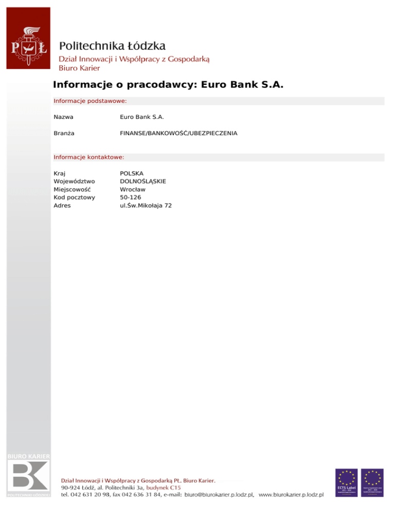 Informacje o pracodawcy: Euro Bank S.A. Informacje podstawowe: Nazwa Euro Bank S.A. Branża FINANSE/BANKOWOŚĆ/UBEZPIECZENIA Informacje kontaktowe: Kraj Województwo Miejscowość Kod pocztowy Adres Powered by TCPDF (www.tcpdf.org) POLSKA DOLNOŚLĄSKIE Wrocław 50-126 ul.Św.Mikołaja 72