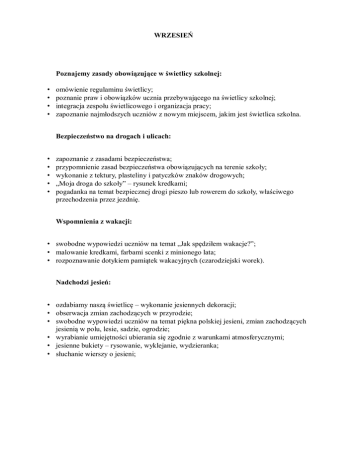 WRZESIEŃ Poznajemy zasady obowiązujące w świetlicy szkolnej: • • • • omówienie regulaminu świetlicy; poznanie praw i obowiązków ucznia przebywającego na świetlicy szkolnej; integracja zespołu świetlicowego i organizacja pracy; zapoznanie najmłodszych uczniów z nowym miejscem, jakim jest świetlica szkolna. Bezpieczeństwo na drogach i ulicach: • • • • • zapoznanie z zasadami bezpieczeństwa; przypomnienie zasad bezpieczeństwa obowiązujących na terenie szkoły; wykonanie z tektury, plasteliny i patyczków znaków drogowych; „Moja droga do szkoły” – rysunek kredkami; pogadanka na temat bezpiecznej drogi pieszo lub rowerem do szkoły, właściwego przechodzenia przez jezdnię. Wspomnienia z wakacji: • swobodne wypowiedzi uczniów na temat „Jak spędziłem wakacje?”; • malowanie kredkami, farbami scenki z minionego lata; • rozpoznawanie dotykiem pamiątek wakacyjnych (czarodziejski worek). Nadchodzi jesień: • ozdabiamy naszą świetlicę – wykonanie jesiennych dekoracji; • obserwacja zmian zachodzących w przyrodzie; • swobodne wypowiedzi uczniów na temat piękna polskiej jesieni, zmian zachodzących jesienią w polu, lesie, sadzie, ogrodzie; • wyrabianie umiejętności ubierania się zgodnie z warunkami atmosferycznymi; • jesienne bukiety – rysowanie, wyklejanie, wydzieranka; • słuchanie wierszy o jesieni; PAŹDZIERNIK Agresji mówimy STOP. Sztuka rozwiązywania konfliktów: • • • • • rozmowa na temat rozwiązywania konfliktów bez przemocy; dlaczego warto być miłym i uprzejmym – burza mózgów; uczymy się rozpoznawać różne uczucia i emocje; jak poradzić sobie z własnym gniewem – propozycje dzieci; przedstawianie swoich portretów w różnych nastrojach. Dzień Edukacji Narodowej: • „DEN – co to za święto?” – rozmowa z dziećmi, • wykonanie laurek i kwiatów dla nauczycieli; • kształtowanie nawyków grzecznościowych, wyrabianie postawy szacunku dla wychowawców i pracowników szkoły. Moja szkoła i jej patron – Jan Paweł II: • zapoznanie uczniów z historią patrona szkoły; • wzbudzenie zainteresowań dzieci środowiskiem szkoły; • wykonanie gazetki tematycznej. Dary jesieni – ogrodu, lasu, sadu: • rozwijanie wrażliwości na piękno jesiennego krajobrazu; • kształcenie umiejętności praktycznego wykorzystania darów jesieni (owoce, warzywa, liście); • zagadki o tematyce jesiennej; • inscenizacja wiersza Jana Brzechwy – „Na straganie”; • wykonanie warzyw i owoców zgodnie z treścią wiersza • konkurs plastyczny LISTOPAD Pamiętajmy o tych, którzy odeszli – Dzień Wszystkich Świętych i Święto Zmarłych: • wyjaśnienie symboliki i znaczenia tych świąt; • pogadanka na temat poszanowania miejsc pamięci, tradycji palenia zniczy, składania kwiatów; • zwrócenie uwagi na odpowiednie zachowanie się na cmentarzu. Narodowe Święto Niepodległości: • wyjaśnienie znaczenia Święta Niepodległości; • poznanie i poszanowanie symboli narodowych; • kształcenie poczucia przynależności narodowej. Wyścig po szóstki. Wdrażanie nawyku systematycznego odrabiania prac domowych: • • • • sprawdzanie zadań domowych; pomoc uczniom z trudnościami w nauce; uświadomienie dzieciom roli ich własnej pracy w uzyskiwaniu dobrych wyników w nauce; „Co poprawić w moim zeszycie?” – dyskusja, zwrócenie uwagi na estetykę prowadzenia zeszytów – „Mój zeszyt świadczy o mnie”. Jestem zdolny – moje mocne strony: • jakie mam uzdolnienia – odkrywanie swoich mocnych stron; • ćwiczenia w grupie rozwijające poczucie własnej wartości; • „Kim będę, gdy dorosnę?” – praca plastyczna. • „Pasowanie na Świetliczaka” Andrzejkowe wróżby: • • • • poznanie zwyczajów andrzejkowych; wdrażanie do wspólnej zabawy; wycinanie konturów czarnych kotów i kluczy; przepowiadanie przyszłości, wróżby, lanie wosku, konkursy. GRUDZIEŃ Mikołajki: • • • • • • rozmowa na temat tradycji obdarowywania się prezentami; pamiętamy, aby sprawić przyjemność bliskim – sposoby przekazywania sobie upominków; portret Mikołaja – praca plastyczna; pisanie listu do Świętego Mikołaja z prośbą o prezenty; adresowanie koperty; krótkie wypowiedzi na temat drogi listu od nadawcy do adresata; nauka pakowania prezentu w ozdobny papier. Czekamy na święta – fabryka ozdób choinkowych: • wykonanie różnych ozdób choinkowych; • ozdabianie świetlicy; • wspólne ubieranie świetlicowej choinki. • kiermasz bożonarodzeniowy Zwyczaje Świąt Bożego Narodzenia: • wspólna rozmowa na temat przygotowania potraw i elementów dekoracyjnych do nakrycia stołu; • Wigilia dawniej i dziś; • słuchanie, nauka i śpiewanie kolęd; • przypomnienie zasad bezpieczeństwa w czasie zabaw zimowych; • wypowiedzi dzieci o tym, czego życzymy bliskim; • pisanie na kartce życzeń skierowanych do siebie w formie dobrego uczynku, poprawy; • szkolna Wigilia – śpiewanie kolęd, dzielenie się opłatkiem. Zimowa przerwa świąteczna. STYCZEŃ Witamy Nowy Rok: • • • • • swobodne wypowiedzi na temat jak witaliśmy Nowy Rok; doskonalenie umiejętności składania życzeń; doskonalenie znajomości nazw: pór roku, miesięcy oraz dni tygodnia; kalendarz na Nowy Rok – zagadki, daty, rocznice, przysłowia; wykonanie śnieżynek z papieru. Dokarmianie ptaków i zwierząt zimą: • • • • • obserwacja otoczenia wokół szkoły, rozmowa o tym jak rośliny i zwierzęta znoszą zimę; jak pomagamy ptakom podczas zimy? – rozmowa; naśladujemy ptaki – gry i zabawy dramowe; śpiewanie piosenek o zimie, ptakach, zwierzętach; lepienie z plasteliny ulubionych zwierząt. Nasi dziadkowie: • • • • • • wspólne czytanie opowiadania ; swobodne wypowiedzi uczniów na temat chwil spędzonych z babcią i dziadkiem; „Portret babci i dziadka” – malowanie farbami; pisanie życzeń dla b