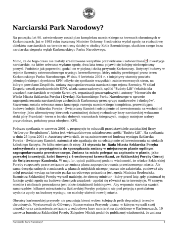 Narciarski Park Narodowy? Na początku lat 90. zatwierdzony został plan kompleksu narciarskiego na terenach chronionych w Karkonoszach. Już w 1993 roku ówczesny Minister Ochrony Środowiska wydał zgodę na rozbudowę obiektów narciarskich na terenie ochrony ścisłej w okolicy Kotła Szrenickiego, skutkiem czego baza narciarska sięgnęła wgłąb Karkonoskiego Parku Narodowego. Mimo, że do tego czasu nie zostały zrealizowane wszystkie przewidziane i zatwierdzone inwestycje narciarskie, na które wówczas wydano zgodę, dwa lata temu pojawił się kolejny niebezpieczny pomysł. Podobnie jak poprzedni, godził on w piękną i dziką przyrodę Karkonoszy. Dotyczył budowy w rejonie Szrenicy czteroosobowego wyciągu krzesełkowego, który miałby przebiegać przez teren Karkonoskiego Parku Narodowego. W dniu 9 kwietnia 2001 r. z inicjatywy starosty powiatu jeleniogórskiego i dyrektora KPN odbyło się spotkanie wszystkich zainteresowanych stron, na którym powołano Zespół ds. zmiany zagospodarowania narciarskiego rejonu Szrenicy. W skład Zespołu weszli przedstawiciele KPN, władz samorządowych, spółki "Sudety-Lift" (właściciela urządzeń narciarskich w rejonie Szrenicy), organizacji pozarządowych i autorzy "Memoriału do Władz Miasta Szklarska Poręba i Dyrekcji Karkonoskiego Parku Narodowego w sprawie zagospodarowania narciarskiego zachodnich Karkonoszy przez grupę naukowców i ekologów". Stworzona została wówczas nowa koncepcja rozwoju narciarskiego kompleksu, przewidująca budowę kolejki Szklarska Poręba - Świąteczny Kamień i odstąpienie od inwestowania na wschód od Szrenicy. Jako alternatywny kierunek ewentualnej dalszej rozbudowy bazy narciarskiej wskazano stoki góry Przedział - teren o bardzo dobrych warunkach śniegowych, mający mniejsze walory przyrodnicze, położony poza obrębem KPN. Podczas spotkania w czerwcu 2001 r. propozycję tę odrzucili przedstawiciele austriackiej firmy "Arlberger Bergbahnen", która jest większościowym udziałowcem spółki "Sudety-Lift". Na spotkaniu w dniu 25 lipca 2001 r. Austriacy stwierdzili, że są zainteresowani budową wyciągu Szklarska Poręba - Świąteczny Kamień, natomiast nie zgadzają się na odstąpienie od inwestowania na stokach Łabskiego Szczytu. Po kilku miesiącach ciszy, 31 stycznia br. Rada Miasta Szklarska Poręba zadecydowała o przystąpieniu do sporządzania zmiany w miejscowym planie ogólnym zagospodarowania przestrzennego. Zmiana ta miała polegać na zapisaniu w planie, jako przyszłej inwestycji, kolei linowej z 4-osobowymi krzesełkami, ze Szklarskiej Poręby Górnej do Świątecznego Kamienia. W maju br. opinii publicznej podano wiadomość, że władze Szklarskiej Poręby rozpoczęły prace związane ze zmianą planu zagospodarowania przestrzennego miasta. Ale sama decyzja radnych o zmianach w planach miejskich niczego jeszcze nie załatwiała, ponieważ aby mógł powstać wyciąg na terenie parku narodowego potrzebna jest zgoda Ministra Środowiska. Burmistrz Szklarskiej Poręby wyraził nadzieję, że obecny minister - który przed laty, gdy piastował tę funkcję wydał zgodę na budowę obecnych urządzeń - zgodzi się również na te inwestycje. W samym mieście i okolicach prowadzona jest także działalność lobbingowa. Aby wspomóc starania swoich samorządów, kilkuset mieszkańców Szklarskiej Poręby podpisało się pod petycją z postulatem wydania zgody na budowę wyciągu, co miałoby ułatwić rozwój miasta. Obrońcy karkonoskiej przyrody nie pozostają bierni wobec kolejnych prób degradacji terenów chronionych. Wystosowali do Głównego Konserwatora Przyrody pismo, w którym wyrazili swój niepokój oraz zastrzeżenia związane z rozbudową bazy narciarstwa alpejskiego w Karkonoszach. 10 czerwca burmistrz Szklarskiej Poręby Zbigniew Misiuk podał do publicznej wiadomości, że zmiana Narciarski Park Narodowy? 1 planów zagospodarowania przestrzennego związana z chęcią wybudowania 4-osobowego wyciągu w rejonie Szrenicy nie wchodzi jednak w rachubę. Samorząd mimo to zdecydował, że chce pójść o krok dalej: ,,Będziemy dążyć do wyłączenia niektórych obszarów z Karkonoskiego Parku, tak jak to zrobiły czeskie samorządy". 17 lipca Zarząd Miasta Szklarska Poręba skierował do Rady Ministrów wniosek o ,,zmniejszenie obszaru Karkonoskiego Parku Narodowego w rejonie Góry Szrenica w formie wyłączenia i przekazania Gminie Szklarska Poręba terenów /.../ na cele obsługi ruchu narciarskiego oraz na modernizację systemu urządzeń infrastruktury turystycznej i narciarskiej". W uzasadnieniu wnioskodawcy powołują się m.in. na Memoriał, uzasadniając swój wniosek następująco: ,,Propozycja zmiany granic Parku jest ponadto, co wymaga szczególnego podkreślenia, wyrazem poszanowania i wyeksponowania najbardziej cennych przyrodniczo jego obszarów". Bez komentarza pozostawiam to stwierdzenie. We wniosku pojawia się cały szereg inwestycji - zarówno nowych, jak i pomysły rozbudowy już istniejących. Gdyby wniosek został zatwierdzony, równoznaczne byłoby to ze zmniejszeniem obszaru Karkonoskiego Parku Narodowego o ponad 500 ha, czyli ok. 10%. Jednocześnie aktualne pozostałyby wydane przez dyrekcję KPN w 1993 r., pod naciskiem Ministerstwa Ochrony Środowiska, uzgodnienia dotyczące inwestycji w rejonie Łabskiego Szczytu. Wniosek ten nie pozostał bez odpowiedzi ze strony przyrodników, którzy wystosowali pismo do Prezesa Rady Ministrów, wyrażając stanowczy sprzeciw wobec zamierzeń władz Szklarskiej Poręby, domagając się odrzucenia postulatów samorządowców. Zwrócili uwagę, o czym chyba zapomina się w całej sprawie, że: ,,/.../ tworząc Karkonoski Park Narodowy Rada Ministrów uznała jego obszar za jedną z najwartościowszych części dziedzictwa przyrodniczego w naszym kraju. Wyrazem dostrzeżenia w Karkonoszach cennego przyrodniczo obszaru przez społeczność międzynarodową było uznanie Karkonoskich Parków Nar