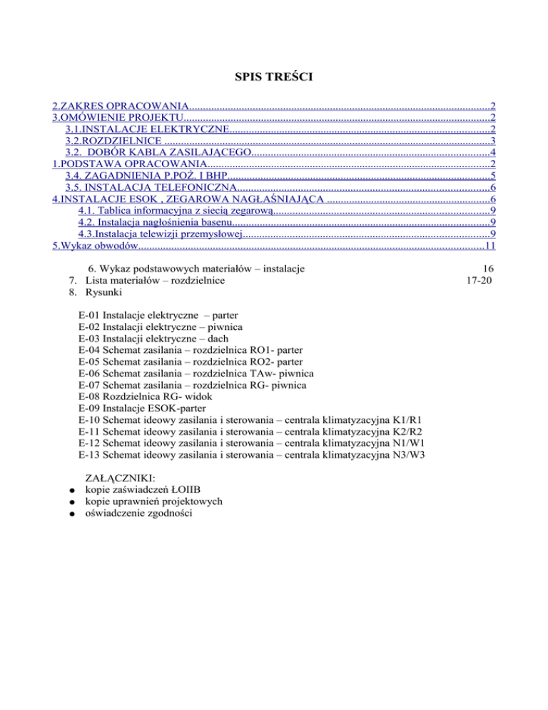 SPIS TREŚCI 2.ZAKRES OPRACOWANIA.............................................................................................................2 3.OMÓWIENIE PROJEKTU...............................................................................................................2 3.1.INSTALACJE ELEKTRYCZNE..............................................................................................2 3.2.ROZDZIELNICE ......................................................................................................................3 3.2. DOBÓR KABLA ZASILAJĄCEGO......................................................................................4 1.PODSTAWA OPRACOWANIA......................................................................................................2 3.4. ZAGADNIENIA P.POŻ. I BHP...............................................................................................5 3.5. INSTALACJA TELEFONICZNA...........................................................................................6 4.INSTALACJE ESOK , ZEGAROWA NAGŁAŚNIAJĄCA ...........................................................6 4.1. Tablica informacyjna z siecią zegarową..............................................................................9 4.2. Instalacja nagłośnienia basenu.............................................................................................9 4.3.Instalacja telewizji przemysłowej.........................................................................................9 5.Wykaz obwodów.............................................................................................................................11 6. Wykaz podstawowych materiałów – instalacje 7. Lista materiałów – rozdzielnice 8. Rysunki E-01 Instalacje elektryczne – parter E-02 Instalacji elektryczne – piwnica E-03 Instalacji elektryczne – dach E-04 Schemat zasilania – rozdzielnica RO1- parter E-05 Schemat zasilania – rozdzielnica RO2- parter E-06 Schemat zasilania – rozdzielnica TAw- piwnica E-07 Schemat zasilania – rozdzielnica RG- piwnica E-08 Rozdzielnica RG- widok E-09 Instalacje ESOK-parter E-10 Schemat ideowy zasilania i sterowania – centrala klimatyzacyjna K1/R1 E-11 Schemat ideowy zasilania i sterowania – centrala klimatyzacyjna K2/R2 E-12 Schemat ideowy zasilania i sterowania – centrala klimatyzacyjna N1/W1 E-13 Schemat ideowy zasilania i sterowania – centrala klimatyzacyjna N3/W3 ● ● ● ZAŁĄCZNIKI: kopie zaświadczeń ŁOIIB kopie uprawnień projektowych oświadczenie zgodności 16 17-20 1. PODSTAWA OPRACOWANIA Podstawą opracowania są: • wytyczne technologiczne • projekt architektoniczny • obowiązujące przepisy i normy • ustalenia z Inwestorem 2. ZAKRES OPRACOWANIA Projekt budowlany obejmuje wykonanie instalacji elektrycznych wewnętrznych opraz linii kablowych zasilania urządzeń technologicznych basenów Zasilanie obiektu odbywać się będzie z projektowanej stacji trafo i nie jest objętej niniejszym opracowaniem. 3. OMÓWIENIE PROJEKTU 3.1.INSTALACJE ELEKTRYCZNE Niniejszy opis opracowano na podstawie uzgodnień międzybranżowych związanych z kształtem architektonicznym obiektu, jego funkcją oraz instalacjami technologicznymi. Obiekt składa się z basenu pływackiego oraz z dodatkowych urządzeń do rekreacji takich jak zjeżdżalnia, sauna, solarium itp. Obiekt zawiera pomieszczenia pomocnicze (szatnie, natryski, sanitariaty) oraz techniczne, i administracyjne. Cały obiekt wyposażony będzie w następujące podstawowe instalacje elektryczne 1. instalacja oświetlenia ogólnego niecki basenu i urządzeń rekreacyjnych 2. instalacja oświetlenia pomieszczeń pomocniczych 3. instalacja oświetlenia ewakuacyjnego 4. instalacja gniazd wtykowych 5. instalacja zasilająca urządzenia technologiczne (uzdatnianie wody, wentylacja ...) 6. instalacja odgromowa 7. instalacja telefoniczna 8. Instalacja obsługi i kontroli klientów “ESOK” Ad. 1. Powierzchnia basenu oraz oraz wodne urządzenia do rekreacji oświetlone będą oprawami typu PG-250 z metalohalogenkowymi źródłami światła HQI-T 250/N, zamontowanymi pod stropem. Oprawy te wyposażone będą w specjalne rastry, ograniczające olśnienie. Ilość i typ zaprojektowanych opraw gwarantuje średnie natężenie oświetlenia na poziomie Eśr>300lx. Dobór typu, ilości oraz sposobu montażu opraw opracowano w oparciu o program komputerowy “Dialux 4.” Wyniki obliczeń (wybrane) wraz z lokalizacją opraw załączono w niniejszym opracowaniu. Załączenie oświetlenia basenów oraz atrakcji basenowych odbywać się będzie przyciskami zamontowanymi w tablicy sterowniczej SAw zlokalizowanej na parterze w pokoju trenera. Tablica posiada drzwiczki zamykane na klucz, w celu wyeliminowania niepożądanych manewrów ze strony osób nieupoważnionych. Oprawy będą podzielone na kilka oddzielnych obwodów załączanych oddzielnie. Wynika to m.in. ze znacznych prądów rozruchowych poszczególnych opraw jak również z możliwości regulowania natężenia oświetlenia w zależności od typu prowadzonych zajęć na basenie. Ad. 3. Do oświetlenia pomieszczeń pomocniczych zastosowane będą typowe oprawy oświetleniowe mocowane do stropu lub wbudowane w sufity podwieszane. Natężenie oświetlenie zgodne z PN. W pomieszczeniach ogólnie dostępnych typu szatnie, przebieralnie, ciągi komunikacyjne – załączenie obwodów odbywa się z pomieszczenia ochrony. Pozostałe - wyłącznikami przy wejściu do pomieszczeń. Ad. 4. W celu zapewnienia bezpieczeństwa osobom przebywającym na obiekcie w przypadku zaniku napięcia przewiduje się w części sportowo-rekreacyjnej montaż opraw ewakuacyjnych z własnym źródłem zasilania (czas świecenia – 2h), natomiast w pozostałej części obiektu (zwłaszcza w ciągach komunikacyjnych) część opraw wyposażona zostanie w moduły awaryjne świecące przez 3h i dające natężenie oświetlenia na poziomie E>1,5 lx. co zapewni bezpieczną