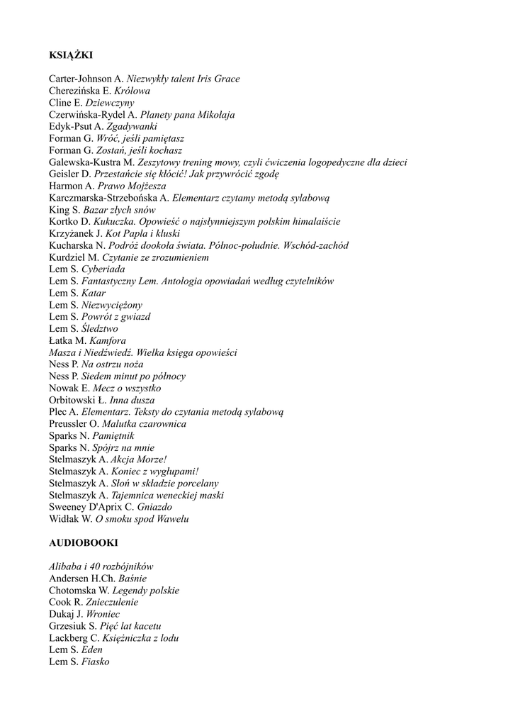 KSIĄŻKI Carter-Johnson A. Niezwykły talent Iris Grace Cherezińska E. Królowa Cline E. Dziewczyny Czerwińska-Rydel A. Planety pana Mikołaja Edyk-Psut A. Zgadywanki Forman G. Wróć, jeśli pamiętasz Forman G. Zostań, jeśli kochasz Galewska-Kustra M. Zeszytowy trening mowy, czyli ćwiczenia logopedyczne dla dzieci Geisler D. Przestańcie się kłócić! Jak przywrócić zgodę Harmon A. Prawo Mojżesza Karczmarska-Strzebońska A. Elementarz czytamy metodą sylabową King S. Bazar złych snów Kortko D. Kukuczka. Opowieść o najsłynniejszym polskim himalaiście Krzyżanek J. Kot Papla i kluski Kucharska N. Podróż dookoła świata. Północ-południe. Wschód-zachód Kurdziel M. Czytanie ze zrozumieniem Lem S. Cyberiada Lem S. Fantastyczny Lem. Antologia opowiadań według czytelników Lem S. Katar Lem S. Niezwyciężony Lem S. Powrót z gwiazd Lem S. Śledztwo Łatka M. Kamfora Masza i Niedźwiedź. Wielka księga opowieści Ness P. Na ostrzu noża Ness P. Siedem minut po północy Nowak E. Mecz o wszystko Orbitowski Ł. Inna dusza Plec A. Elementarz. Teksty do czytania metodą sylabową Preussler O. Malutka czarownica Sparks N. Pamiętnik Sparks N. Spójrz na mnie Stelmaszyk A. Akcja Morze! Stelmaszyk A. Koniec z wygłupami! Stelmaszyk A. Słoń w składzie porcelany Stelmaszyk A. Tajemnica weneckiej maski Sweeney D'Aprix C. Gniazdo Widłak W. O smoku spod Wawelu AUDIOBOOKI Alibaba i 40 rozbójników Andersen H.Ch. Baśnie Chotomska W. Legendy polskie Cook R. Znieczulenie Dukaj J. Wroniec Grzesiuk S. Pięć lat kacetu Lackberg C. Księżniczka z lodu Lem S. Eden Lem S. Fiasko Lem S. Głos Pana Perrault Ch. Czerwony kapturek Piasecki S. Zapiski oficera Armii Czerwonej Picoult J. W naszym domu FILMY Everest Pudełko po butach
