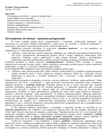Marginalizacja i wykluczenie społeczne Dr Ryszard Szarfenberg, Wykład 1 Wprowadzenie Wykład 1 Wprowadzenie (wersja z 24.11.08) Spis treści Od marginesu do kohezji – językowe peregrynacje ....................................................................................... 1 Ludzie zbędni i ich wizerunek ....................................................................................................................... 4 Mechanizmy wytwarzania zbędności............................................................................................................. 6 Funkcje marginesu w różnych czasach .......................................................................................................... 7 Polityka i marginalizacja ............................................................................................................................... 7 Reintegracja „elementów marginesowych” .................................................................................................... 8 Metafora domu społecznego .......................................................................................................................... 9 Pytania i zadania ......................................................................................................................................... 11 Od marginesu do kohezji – językowe peregrynacje W tytule wykładu użyłem słowa „marginalizacja” i wyrażenia „wykluczenie społeczne”. Nie wyczerpuje to oczywiście wielkiej różnorodności, z jaką mamy do czynienia w dyskursie publicznym i naukowym o zjawiskach i procesach społecznych, o których będę mówił. Najbardziej potoczne określenie to oczywiście „margines społeczny”, na tyle popularne, że zdefiniowano je w Słowniku Języka Polskiego PWN: • „nieliczna i mało znacząca warstwa społeczna, składająca się z jednostek prowadzących pasożytniczy tryb życia, wykolejonych, naruszających przepisy prawa i normy współżycia społecznego; męty społeczne”. Definicja „mętów społecznych” z tego samego słownika: „ludzie o niewiadomym, podejrzanym sposobie zarobkowania, niskim poziomie moralnym, cechujący się brakiem kultury”. Podobnym językiem K. Marks opisywał „lumpenproletariat”. Definicja PWN ewoluuje, w obecnej internetowej wersji tego słownika mamy: „ludzie wykolejeni, naruszający przepisy prawa i normy współżycia społecznego”, a „męt” to: „człowiek z marginesu społecznego”. W Encyklopedii PWN znajdujemy nieco inną definicję marginesu społecznego: • „nieliczna, mało znacząca grupa społ., nisko ceniona w społeczeństwie ze względu na nieprzestrzeganie ogólnie przyjętych norm i zasad współżycia; margines społeczny składa się z jednostek, których zachowania są sprzeczne z normami moralnymi, kult. i prawnymi i mają charakter patologii społecznej”. Zmiana definicji polegała na zastąpieniu wyrażenia „warstwa społeczna” terminem „grupa społeczna”. Znika „pasożytniczy tryb życia”, „wykolejenie” i „męty społeczne”. Pozostawiono naruszanie norm i skojarzono margines społeczny z patologią społeczną. Patologię określa się już w innym słowniku jako synonim „dewiacji, problemów społecznych czy też ‘choroby społecznej’”, a „patologię społeczną” jako „wczesną postać teorii dewiacji” i dodano, że „obecnie mało już wykorzystywana; opiera się na porównaniu organicznym: stwierdza, że części społeczeństwa, podobnie jak części ciała, mogą cierpieć na załamania i choroby” („Słownik socjologii i nauk społecznych”). W polityce społecznej pojęcie „patologia społeczna” czasem używane jako zbiorcze określenie szczególnych problemów społecznych takich, jak przestępczość, prostytucja, alkoholizm i narkomania, samobójstwa. Łączy je m.in. to, że przyczyn popełniania przestępstw, prostytuowania się, upijania się i narkotyzowania, przynajmniej potocznie, poszukuje się głównie w jednostkach, a nie w szerszych strukturach i procesach społecznych i gospodarczych, jak w przypadku głodu, ubóstwa, bezrobocia, czy niepełnosprawności. Z obu definicji marginesu społecznego, a szczególnie z pierwszej, wynika, że określenie to ma charakter pejoratywny, tzn. wzbudza w nas negatywne odczucia takie, jak lęk, pogarda, obrzydzenie itp. wobec ludzi, których zaliczymy do marginesu społecznego. Charakterystyczne jest też w tych ujęciach silne powiązanie marginesu społecznego z zachowaniami naruszającymi przyjęte normy. Naukowcy unikają używania wyrażeń, które w języku potocznym wyraźnie naznaczają. Dlatego częściej spotkamy w książkach naukowych słowa: marginalizacja, marginalność, marginalny, marginesowość. Trzeba też wspomnieć w tym kontekście o pojęciu „podklasa” (tłumaczenie angielskiego słowa underclass), które w niektórych podejściach oznacza bardzo podobną do marginesu społecznego zbiorowość ludzi (np. zbiorowości zamieszkujące getta wielkich amerykańskich miast – czarnoskórzy, samotne matki utrzymujące się z pomocy społecznej, młodzi mężczyźni zarabiający na handlu narkotykami i należący do 1 Marginalizacja i wykluczenie społeczne Dr Ryszard Szarfenberg, Wykład 1 Wprowadzenie gangów) i bezpośrednio nawiązuje do pojęcia klasy społecznej, czyli jednej z ważnych kategorii służących do opisu struktury społecznej. Dalej też spotkamy słowo „deklasacja”, czyli obniżanie statusu w społeczeństwie. Czasem pisze się również o „nadklasie”, czyli o ludziach bogatych, którzy mogą sobie pozwolić na życie poza społeczeństwem, ale w tym przypadku trudniej mówić o niedobrowolności. Kontynuując wątek nazywania grupy, zbiorowości czy ludzi nie mieszczących się w społeczeństwie, historycznie używano w Polsce określenia „ludzie luźni”, np. przy pierwszych spisach powszechnych z końca XVIII wieku