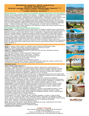 Weekend majowy 2016 zagranicą wczasy autokarem Grecja wyspa Korfu hotel Messonghi Beach*** dla maturzystów, studentów i osób młodych duchem Niespodzianka - w tym terminie przypada grecka Wielkanoc (01.05.2016) ! Polecam, sama doświadczyłam pobytu w tym okresie - a wygląda to tak: wieczorem w Wielką Sobotę celebrowana jest Wielka Msza Rezurekcyjna (Anastasi) z najbardziej podniosłym momentem w celebrze Wielkiego Tygodnia - zapaleniem świecy rezurekcyjnej; niesamowity nastrój (światło to jest corocznie przywożone samolotem wojskowym z Jerozolimy) po czym kapłan wychodzi z ową zapaloną świecą i wszyscy od niej zapalają swoje świece, pozdrawiają się słowami Christos Anesti (Chrystus Zmartwychwstał), odpowiadając Alithos Anesti (Zaiste Zmartwychwstał). Po uroczystości Grecy ostrożnie podążają z zapalonymi świecami do swoich domów, poczym siadają do wspólnego posiłku - wielkanocną zupą jest magirica, którą gotuje się z baranich lub kozich podrobów z dodatkiem cytryny, kopru i cebuli, podawany jest świąteczny, słodki chleb zwany tsoureki, który w smaku przypomina znaną nam chałkę… W programie powitalna grecka kolacja Wielkanocna ! Wyspa Korfu - w maju porwiemy Was do krainy idylli, na magiczną, bajkową wręcz wyspę Korfu! Dlaczego akurat tam? Miejscówka jest sprawdzona przez nas wzdłuż i wszerz, plaże zawsze otoczone błękitnym morzem, słońce świeci 360 dni w roku i ta atmosfera… Niepowtarzalna nigdzie indziej. Tutaj nie ma słowa pośpiech, sielankowe podejście udziela się wszystkim a wypoczynek tutaj to podstawa. Jednak ile można opalać się przy basenie lub też smażyć na plaży?! Ok, dla niektórych nie ma umiaru. Jednak ci bardziej zainteresowani poznaniem Grecji mogą podczas rejsu Paxos – Antipaxos podziwiając krystalicznie czystą wodę - naturalnie z możliwością popływania w niej oraz sławne Błękitne Groty. Mogą również udać się na całodniowe zwiedzanie Korfu, a jest na co popatrzeć! Gdy słońce zajdzie, wycieczki się skończą… Korfu nie zasypia. Wąskie uliczki miasta tętnią życiem do godzin porannych, lokalne kluby, puby i tawerny mają domyślne tabliczki nad wejściem always welcome! ;) Program Dzień 1 Wyjazd z Polski zgodnie z rozkładem jazdy Przejazd przecSłowację, Węgry Dzień 2 Przejazd przez Serbię, Macedonię Przeprawa promowa na Korfu Zakwaterowanie Powitalna Grecka Kolacja Wielkanocna Dzień 3-7 Pobyt na Korfu Aktywności na plaży Red Cup Holi Color Warsztaty taneczne Warsztaty barmańskie Imprezy Wycieczki fakultatywne: Cudna wyspa Korfu Wieczór grecki Rejs statkiem ze szklanym dnem Rejs Paxos - Antipaxos Dzień 8 Śniadanie Wykwaterowanie Przeprawa promowa Przejazd przez: Macedonię, Serbię, Węgry Słowację Dzień 9 Przekroczenie granicy z Polską Przyjazd do miast Polski centralnej w godzinach nocnych Podany program ma charakter ramowy i poszczególne punkty mogą ulec zmianie, zamianie lub wykreśleniu w zależności od warunków czasowych i pogodowych Zakwaterowanie Hotel Messonghi Beach*** Położenie: Messonghi Beach jest przestronnym resortem wakacyjnym, usytuowanym we wschodniej części wyspy Korfu, na wprost pięknej plaży. Otoczony rozległymi ogrodami oferuje zakwaterowanie w pokojach z widokiem na basen, ogród lub Morze Jońskie. Hotel od centrum wioski Messonghi dzieli tylko krótki spacer. Lotnisko oraz malownicze miasto Korfu, będące na Liście Światowego Dziedzictwa UNESCO, znajduje się 21 km na północ. W pobliżu hotelu znajdują się lokalne tawerny i bary z tradycyjną grecką kuchnią. Do miasta Korfu można w łatwy sposób dostać się busem hotelowym (za dodatkową opłatą) lub komunikacją lokalną (500 m do przystanku autobusowego, bilet na Korfu ok. 1,9 €). Pokoje: wszystkie pokoje mieszczą się w budynkach otoczonych kwiatowymi ogrodami i trawnikami, które prowadzą aż do plaży. W każdym pokoju do dyspozycji Gości jest klimatyzacja, telewizja satelitarna oraz łazienka z prysznicem i suszarką do włosów. Dodatkowo: sprzątane oraz wymiana ręczników. Wyposażenie: telefon, stolik, krzesła, lodówka, balkon lub taras. Infrastruktura: na terenie obiektu dostępne są 2 główne restauracje Nausicaa i Ulysses (bufet; dania kuchni śródziemnomorskiej i międzynarodowej), restauracja a la carte Scorpios (owoce morza), 3 kawiarnie: Le Jardin, Pergola i Oassis, bar z przekąskami na plaży, 5 barów: Blue Lagoon, BBS, Patio, Pierroto, Dionyssos a także minimarket. Do dyspozycji gości w hotelu dodatkowo znajduję się: recepcja, sejf (dodatkowo płatny), punkt wymiany walut, ogród, kącik internetowy (dodatkowo płatny), amfiteatr Dionyssos, sklepy, minimarket, jubiler, kiosk, fryzjer, opieka medyczna (dodatkowo płatna), pralnia, wypożyczalnia samochodów, wypożyczalnia rowerów, parking. Po terenie kompleksu kursują 2 kolejki "Tchu Tchu". Hotel posiada m.in. także: 4 baseny (leżaki i parasole bezpłatne, 2 baseny z wodą morską), aerobik, tenis, koszykówka, piłka nożna, siatkówka plażowa, dyskoteka. Za dodatkową opłatą: bilard, sala gier, 4 korty tenisowe, centrum nurkowe, sporty wodne na plaży (kajaki, rowery wodne, narty wodne, żaglówki, windsurfing, paragliding). Czynne w zależności od pogody. Życie nocne i rozrywki w centrum Moraitiki lub Korfu. Plaża: piaszczysto-kamienista, długa, łagodnie opadająca do morza, bezpośrednio przy hotelu. Na hotelowej plaży dostępne są bezpłatne parasole. Z leżaków Goście mogą korzystać za dodatkową opłatą Wyżywienie All Inclusive kontakt i rezerwacja: Biuro Podróży Busmarket ul. 3 Maja 36 40-097 Katowice e-mail: [email protected] tel./fax 32 253 86 34 tel. komórkowy 693 444 554 www.busmarket.turystyka.net i www.busmarket.turystyka.pl Posiłki: Powitalna tradycyjna grecka kolacja wielkanocna Śniadanie w formie bufetu od 700 - 930 Przekąski i napoje od 1030 - 1200 (kawa, herbata, ciastka, ciasta) Obiad w formie bufetu od 1230 - 1430 Przekąski