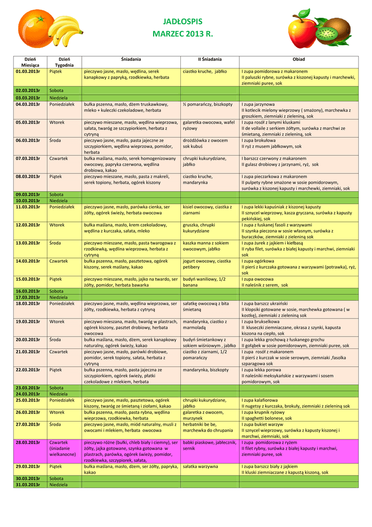 JADŁOSPIS MARZEC 2013 R. Dzień Miesiąca 01.03.2013r Dzień Tygodnia Piątek 02.03.2013r Sobota 03.03.2013r 04.03.2013r Niedziela Poniedziałek 05.03.2013r Wtorek 06.03.2013r Środa 07.03.2013r Czwartek 08.03.2013r Piątek 09.03.2013r 10.03.2013r 11.03.2013r Sobota Niedziela Poniedziałek 12.03.2013r Śniadania II Śniadania Obiad pieczywo jasne, masło, wędlina, serek kanapkowy z papryką, rzodkiewka, herbata ciastko kruche, jabłko I zupa pomidorowa z makaronem II paluszki rybne, surówka z kiszonej kapusty i marchewki, ziemniaki puree, sok bułka pszenna, masło, dżem truskawkowy, mleko + kuleczki czekoladowe, herbata ½ pomarańczy, biszkopty pieczywo mieszane, masło, wędlina wieprzowa, sałata, twaróg ze szczypiorkiem, herbata z cytryną pieczywo jasne, masło, pasta jajeczne ze szczypiorkiem, wędlina wieprzowa, pomidor, herbata bułka maślana, masło, serek homogenizowany owocowy, papryka czerwona, wędlina drobiowa, kakao pieczywo mieszane, masło, pasta z makreli, serek topiony, herbata, ogórek kiszony galaretka owocowa, wafel ryżowy drożdźówka z owocem sok kubuś I zupa jarzynowa II kotlecik mielony wieprzowy ( smażony), marchewka z groszkiem, ziemniaki z zieleniną, sok I zupa rosół z lanymi kluskami II de vollaile z serkiem żółtym, surówka z marchwi ze śmietaną, ziemniaki z zieleniną, sok I zupa brokułowa II ryż z musem jabłkowym, sok chrupki kukurydziane, jabłko I barszcz czerwony z makaronem II gulasz drobiowy z jarzynami, ryż, sok ciastko kruche, mandarynka I zupa pieczarkowa z makaronem II pulpety rybne smażone w sosie pomidorowym, surówka z kiszonej kapusty i marchewki, ziemniaki, sok pieczywo jasne, masło, parówka cienka, ser żółty, ogórek świeży, herbata owocowa kisiel owocowy, ciastka z ziarnami Wtorek bułka maślana, masło, krem czekoladowy, wędlina z kurczaka, sałata, mleko gruszka, chrupki kukurydziane 13.03.2013r Środa kaszka manna z sokiem owocowym, jabłko 14.03.2013r Czwartek pieczywo mieszane, masło, pasta twarogowa z rzodkiewką, wędlina wieprzowa, herbata z cytryną bułka pszenna, masło, pasztetowa, ogórek kiszony, serek maślany, kakao jogurt owocowy, ciastka petibery 15.03.2013r Piątek pieczywo mieszane, masło, jajko na twardo, ser żółty, pomidor, herbata bawarka budyń waniliowy, 1/2 banana I zupa lekki kapuśniak z kiszonej kapusty II sznycel wieprzowy, kasza gryczana, surówka z kapusty pekińskiej, sok I zupa z łuskanej fasoli z warzywami II szynka pieczona w sosie własnym, surówka z buraczków, ziemniaki z zieleniną sok I zupa żurek z jajkiem i kiełbasą II ryba filet, surówka z białej kapusty i marchwi, ziemniaki sok I zupa ogórkowa II pierś z kurczaka gotowana z warzywami (potrawka), ryż, sok I zupa owocowa II naleśnik z serem, sok 16.03.2013r 17.03.2013r 18.03.2013r Sobota Niedziela Poniedziałek pieczywo jasne, masło, wędlina wieprzowa, ser żółty, rzodkiewka, herbata z cytryną sałatkę owocową z bita śmietaną 19.03.2013r Wtorek mandarynka, ciastko z marmoladą 20.03.2013r Środa 21.03.2013r Czwartek 22.03.2013r Piątek pieczywo mieszana, masło, twaróg w plastrach, ogórek kiszony, pasztet drobiowy, herbata owocowa bułka maślana, masło, dżem, serek kanapkowy naturalny, ogórek świeży, kakao pieczywo jasne, masło, parówki drobiowe, pomidor, serek topiony, sałata, herbata z cytryną bułka pszenna, masło, pasta jajeczna ze szczypiorkiem, ogórek świeży, płatki czekoladowe z mlekiem, herbata 23.03.2013r 24.03.2013r 25.03.2013r Sobota Niedziela Poniedziałek 26.03.2013r Wtorek 27.03.2013r Środa pieczywo jasne, masło, pasztetowa, ogórek kiszony, twaróg ze śmietaną i ziołami, kakao bułka pszenna, masło, pasta rybna, wędlina wieprzowa, rzodkiewka, herbata pieczywo jasne, masło, miód naturalny, musli z owocami i mlekiem, herbata owocowa chrupki kukurydziane, jabłko galaretka z owocem, murzynek herbatniki be be, marchewka do chrupania 28.03.2013r Czwartek (śniadanie wielkanocne) 29.03.2013r Piątek 30.03.2013r 31.03.2013r Sobota Niedziela budyń śmietankowy z sokiem wiśniowym , jabłko ciastko z ziarnami, 1/2 pomarańczy mandarynka, biszkopty pieczywo różne (bułki, chleb biały i ciemny), ser babki piaskowe, jabłecznik, żółty, jajka gotowane, szynka gotowana w sernik plastrach, parówka, ogórek świeży, pomidor, rzodkiewka, szczypiorek, sałata, bułka maślana, masło, dżem, ser żółty, papryka, sałatka warzywna kakao I zupa barszcz ukraiński II klopsiki gotowane w sosie, marchewka gotowana ( w kostkę), ziemniaki z zieleniną sok I zupa brukselkowa II kluseczki ziemniaczane, okrasa z szynki, kapusta kiszona na ciepło, sok I zupa lekka grochową z łuskanego grochu II gołąbek w sosie pomidorowym, ziemniaki puree, sok I zupa rosół z makaronem II pierś z kurczak w sosie serowym, ziemniaki ,fasolka szparagowa sok I zupa lekka porowa II naleśniki meksykańskie z warzywami i sosem pomidorowym, sok I zupa kalafiorowa II nugetsy z kurczaka, brokuły, ziemniaki z zieleniną sok I zupa krupnik ryżowy II spaghetti bolonese, sok I zupa bukiet warzyw II sznycel wieprzowy, surówka z kapusty kiszonej i marchwi, ziemniaki, sok I zupa pomidorowa z ryżem II filet rybny, surówka z białej kapusty i marchwi, ziemniaki puree, sok I zupa barszcz biały z jajkiem II kluski ziemniaczane z kapustą kiszoną, sok