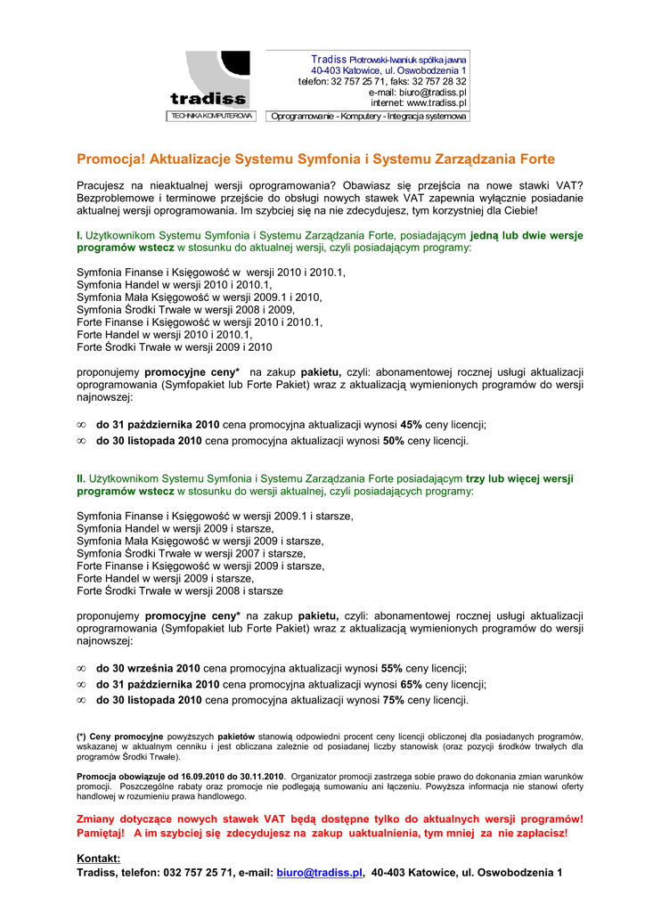 Tr ad iss Piotrowski-Iwaniuk spółka jawna 40-403 Katowice, ul. Oswobodzenia 1 telefon: 32 757 25 71, faks: 32 757 28 32 e-mail: [email protected] internet: www.tradiss.pl TECHNIKA KOMPUTEROWA Oprogramowanie - Komputery - Integracja systemowa Promocja! Aktualizacje Systemu Symfonia i Systemu Zarządzania Forte Pracujesz na nieaktualnej wersji oprogramowania? Obawiasz się przejścia na nowe stawki VAT? Bezproblemowe i terminowe przejście do obsługi nowych stawek VAT zapewnia wyłącznie posiadanie aktualnej wersji oprogramowania. Im szybciej się na nie zdecydujesz, tym korzystniej dla Ciebie! I. Użytkownikom Systemu Symfonia i Systemu Zarządzania Forte, posiadającym jedną lub dwie wersje programów wstecz w stosunku do aktualnej wersji, czyli posiadającym programy: Symfonia Finanse i Księgowość w wersji 2010 i 2010.1, Symfonia Handel w wersji 2010 i 2010.1, Symfonia Mała Księgowość w wersji 2009.1 i 2010, Symfonia Środki Trwałe w wersji 2008 i 2009, Forte Finanse i Księgowość w wersji 2010 i 2010.1, Forte Handel w wersji 2010 i 2010.1, Forte Środki Trwałe w wersji 2009 i 2010 proponujemy promocyjne ceny* na zakup pakietu, czyli: abonamentowej rocznej usługi aktualizacji oprogramowania (Symfopakiet lub Forte Pakiet) wraz z aktualizacją wymienionych programów do wersji najnowszej: • • do 31 października 2010 cena promocyjna aktualizacji wynosi 45% ceny licencji; do 30 listopada 2010 cena promocyjna aktualizacji wynosi 50% ceny licencji. II. Użytkownikom Systemu Symfonia i Systemu Zarządzania Forte posiadającym trzy lub więcej wersji programów wstecz w stosunku do wersji aktualnej, czyli posiadających programy: Symfonia Finanse i Księgowość w wersji 2009.1 i starsze, Symfonia Handel w wersji 2009 i starsze, Symfonia Mała Księgowość w wersji 2009 i starsze, Symfonia Środki Trwałe w wersji 2007 i starsze, Forte Finanse i Księgowość w wersji 2009 i starsze, Forte Handel w wersji 2009 i starsze, Forte Środki Trwałe w wersji 2008 i starsze proponujemy promocyjne ceny* na zakup pakietu, czyli: abonamentowej rocznej usługi aktualizacji oprogramowania (Symfopakiet lub Forte Pakiet) wraz z aktualizacją wymienionych programów do wersji najnowszej: • • • do 30 września 2010 cena promocyjna aktualizacji wynosi 55% ceny licencji; do 31 października 2010 cena promocyjna aktualizacji wynosi 65% ceny licencji; do 30 listopada 2010 cena promocyjna aktualizacji wynosi 75% ceny licencji. (*) Ceny promocyjne powyższych pakietów stanowią odpowiedni procent ceny licencji obliczonej dla posiadanych programów, wskazanej w aktualnym cenniku i jest obliczana zależnie od posiadanej liczby stanowisk (oraz pozycji środków trwałych dla programów Środki Trwałe). Promocja obowiązuje od 16.09.2010 do 30.11.2010. Organizator promocji zastrzega sobie prawo do dokonania zmian warunków promocji. Poszczególne rabaty oraz promocje nie podlegają sumowaniu ani łączeniu. Powyższa informacja nie stanowi oferty handlowej w rozumieniu prawa handlowego. Zmiany dotyczące nowych stawek VAT będą dostępne tylko do aktualnych wersji programów! Pamiętaj! A im szybciej się zdecydujesz na zakup uaktualnienia, tym mniej za nie zapłacisz! Kontakt: Tradiss, telefon: 032 757 25 71, e-mail: [email protected], 40-403 Katowice, ul. Oswobodzenia 1 Tr ad iss Piotrowski-Iwaniuk spółka jawna 40-403 Katowice, ul. Oswobodzenia 1 telefon: 32 757 25 71, faks: 32 757 28 32 e-mail: [email protected] internet: www.tradiss.pl TECHNIKA KOMPUTEROWA Oprogramowanie - Komputery - Integracja systemowa Promocja! Aktualizacje Systemu Symfonia i Systemu Zarządzania Forte Pracujesz na nieaktualnej wersji oprogramowania? Obawiasz się przejścia na nowe stawki VAT? Bezproblemowe i terminowe przejście do obsługi nowych stawek VAT zapewnia wyłącznie posiadanie aktualnej wersji oprogramowania. Im szybciej się na nie zdecydujesz, tym korzystniej dla Ciebie! Poniżej przedstawiona jest przykładowa kalkulacja dla różnych programów, prezentująca progresję ceny uaktualnienia, w zależności od daty zakupu. Proszę pamiętać, że rzeczywisty koszt zakupu wg cen promocyjnych pakietów uaktualnienia dla każdego programu jest obliczany zależnie od posiadanej liczby stanowisk (oraz pozycji środków trwałych dla programów Środki Trwałe) i jest mniejszy, im wcześniej dokonamy zakupu. Symulacja ceny uaktualnienia dla trzech i więcej wersji wstecz: Uaktualnienie do Programu SymfoniaFinansei Księgowość Liczba stanowisk 2 Zakup do Zakup do Zakup do 30 września 31 października 30 listopada 1 848,00 zł 2 184,00 zł 2 520,00 zł SymfoniaHandel 3 1 688,50 zł 1 995,50 zł 2 302,50 zł SymfoniaŚrodki Trwałe do 500 poz. 1 929,50 zł 1 098,50 zł 1 267,50 zł SymfoniaMała Księgowość 1 379, 50 zł 448,50 zł 517,50 zł RAZEM 4 845,50 zł 5 726,50 zł 6 607,50 zł Symulacja ceny uaktualnienia dla jednej lub dwóch wersji wstecz: Uaktualnienie do Programu SymfoniaFinansei Księgowość Liczba stanowisk 2 Zakup do Zakup do 31 października 30 listopada 1 512,00 zł 1 680,00 zł SymfoniaHandel 3 1 381,50 zł 1 55,00 zł SymfoniaŚrodki Trwałe do 500 poz. 1 760,50 zł 845,00 zł SymfoniaMała Księgowość 1 310,50 zł 345,00 zł RAZEM 3 964,50 zł 4 405,00 zł Promocja obowiązuje od 16.09.2010 do 30.11.2010. Wszystkie podane ceny są cenami netto. Należy doliczyć podatek VAT. Organizator promocji zastrzega sobie prawo do dokonania zmian warunków promocji. Poszczególne rabaty oraz promocje nie podlegają sumowaniu ani łączeniu. Powyższa informacja nie stanowi oferty handlowej w rozumieniu prawa handlowego. Pamiętaj! Zmiany dotyczące nowych stawek VAT dostępne będą tylko do aktualnych wersji programów! A im szybciej się zdecydujesz na zakup uaktualnienia, tym mniej za nie zapłacisz! Kontakt: Tradiss, telefon: 032 757 25 71, e-mail: [email protected], 40-403 Katowice, ul. Oswobodzenia 1 Tradiss. Dokument informacyjny wersja 1.0 z dnia 21.09.2010.