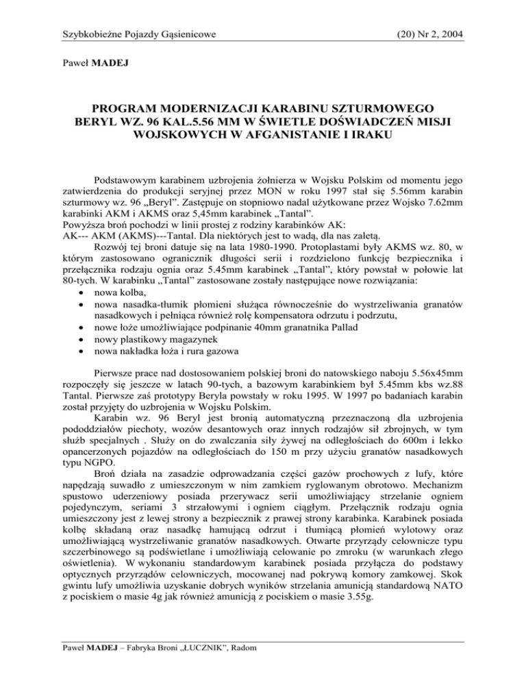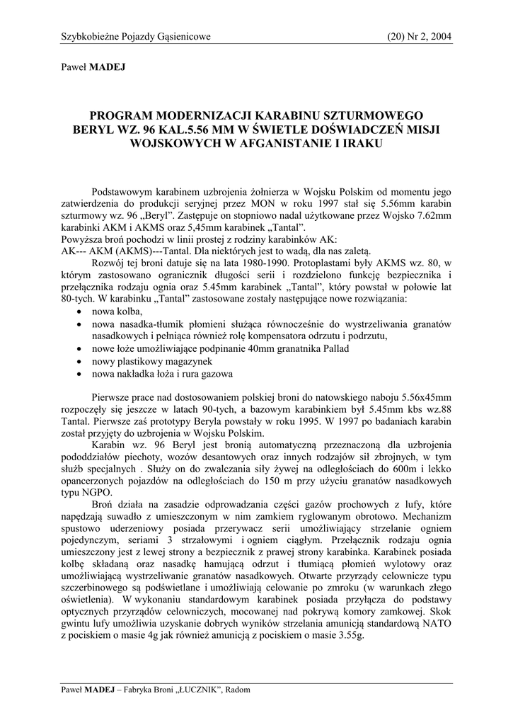 Szybkobieżne Pojazdy Gąsienicowe (20) Nr 2, 2004 Paweł MADEJ PROGRAM MODERNIZACJI KARABINU SZTURMOWEGO BERYL WZ. 96 KAL.5.56 MM W ŚWIETLE DOŚWIADCZEŃ MISJI WOJSKOWYCH W AFGANISTANIE I IRAKU Podstawowym karabinem uzbrojenia żołnierza w Wojsku Polskim od momentu jego zatwierdzenia do produkcji seryjnej przez MON w roku 1997 stał się 5.56mm karabin szturmowy wz. 96 „Beryl”. Zastępuje on stopniowo nadal użytkowane przez Wojsko 7.62mm karabinki AKM i AKMS oraz 5,45mm karabinek „Tantal”. Powyższa broń pochodzi w linii prostej z rodziny karabinków AK: AK--- AKM (AKMS)---Tantal. Dla niektórych jest to wadą, dla nas zaletą. Rozwój tej broni datuje się na lata 1980-1990. Protoplastami były AKMS wz. 80, w którym zastosowano ogranicznik długości serii i rozdzielono funkcję bezpiecznika i przełącznika rodzaju ognia oraz 5.45mm karabinek „Tantal”, który powstał w połowie lat 80-tych. W karabinku „Tantal” zastosowane zostały następujące nowe rozwiązania: nowa kolba, nowa nasadka-tłumik płomieni służąca równocześnie do wystrzeliwania granatów nasadkowych i pełniąca również rolę kompensatora odrzutu i podrzutu, nowe łoże umożliwiające podpinanie 40mm granatnika Pallad nowy plastikowy magazynek nowa nakładka łoża i rura gazowa Pierwsze prace nad dostosowaniem polskiej broni do natowskiego naboju 5.56x45mm rozpoczęły się jeszcze w latach 90-tych, a bazowym karabinkiem był 5.45mm kbs wz.88 Tantal. Pierwsze zaś prototypy Beryla powstały w roku 1995. W 1997 po badaniach karabin został przyjęty do uzbrojenia w Wojsku Polskim. Karabin wz. 96 Beryl jest bronią automatyczną przeznaczoną dla uzbrojenia pododdziałów piechoty, wozów desantowych oraz innych rodzajów sił zbrojnych, w tym służb specjalnych . Służy on do zwalczania siły żywej na odległościach do 600m i lekko opancerzonych pojazdów na odległościach do 150 m przy użyciu granatów nasadkowych typu NGPO. Broń działa na zasadzie odprowadzania części gazów prochowych z lufy, które napędzają suwadło z umieszczonym w nim zamkiem ryglowanym obrotowo. Mechanizm spustowo uderzeniowy posiada przerywacz serii umożliwiający strzelanie ogniem pojedynczym, seriami 3 strzałowymi i ogniem ciągłym. Przełącznik rodzaju ognia umieszczony jest z lewej strony a bezpiecznik z prawej strony karabinka. Karabinek posiada kolbę składaną oraz nasadkę hamującą odrzut i tłumiącą płomień wylotowy oraz umożliwiającą wystrzeliwanie granatów nasadkowych. Otwarte przyrządy celownicze typu szczerbinowego są podświetlane i umożliwiają celowanie po zmroku (w warunkach złego oświetlenia). W wykonaniu standardowym karabinek posiada przyłącza do podstawy optycznych przyrządów celowniczych, mocowanej nad pokrywą komory zamkowej. Skok gwintu lufy umożliwia uzyskanie dobrych wyników strzelania amunicją standardową NATO z pociskiem o masie 4g jak również amunicją z pociskiem o masie 3.55g. Paweł MADEJ – Fabryka Broni „ŁUCZNIK”, Radom Paweł MADEJ Wyposażenie standardowe stanowi: 1 magazynek plastikowy o pojemności 20 szt naboi 3 magazynki plastikowe o pojemności 30 szt naboi 4 łódki do szybkiego załadowania magazynków torba na magazynki która mieści całe wyposażenie odrzutnik do ślepego strzelania Zasadnicze dane taktyczno techniczne: Kaliber Prędkość początkowa pocisku Energia wylotowa pocisku Szybkostrzelność teoretyczna Pojemność magazynka Taktyczny zasięg rażenia Odległość celowania ( nastawy celownika) Długość linii celowniczej Długość lufy Ilość bruzd w lufie Skok gwintu lufy Długość z kolbą rozłożoną Długość z kolbą złożoną Masa karabinka (bez magazynka) Masa magazynka załadowanego 30-ma nabojami Typ naboju Masa naboju Masa pocisku podstawowego (standard NATO) Masa granatu nasadkowego Zasięg strzału granatem nasadkowym (w zależności od masy granatu) 5.56 mm Vo 920 m/s Eo 1690 J 700 strz./min 20 i 30 naboi 600 m od 100 do 1000 m 372 mm 457 mm 6 228 mm 943 mm 742 mm 3350 g 547 g 5,56x45 mm 12.3 g 4g 350 500 g 150 280 m Rys. 1. Beryl wz. 96 z proponowanymi zmianami. 2 Program modernizacji karabinu szturmowego Beryl wz. 96 kal.5.56mm … Rys. 2. Beryl wz. 96 z proponowanymi zmianami. Beryl jako „klon” prostego układu „kałasznikowa” jest bronią niezawodną w każdych warunkach klimatycznych. Jego eksploatacja – użytkowanie w trudnych warunkach pustynnych Libanu, Afganistanu i Iraku dowodzą tego niezbicie. Opinia użytkowników, że jest to broń niezawodna, prosta w obsłudze i bardzo celna jest jak najbardziej słuszna. Obok tych niewątpliwych zalet wymienia się jednak szereg uwag krytycznych, zarówno od użytkowników w KWP Irak i Afganistan ale też i od JW w Polsce, jak i od użytkowników prywatnych (np. strzelców sportowych). Do najbardziej krytykowanych należy: 1. Cały układ kolby. Zatrzask blokujący kolby, który wspomaga sprężynę przy składaniu kolby (położenie: kolba złożona) w trudnych warunkach piasku pustynnego blokuje się w swoim gnieździe i utrudnia poprawną pracę kolby, a w konsekwencji jego wyłamywanie. Należy jednak nadmienić, że niesprawność zatrzasku blokującego nie rzutuje na użytkowanie karabinu przy strzelaniu z kolbą rozłożoną. Drugi mankament kolby to częste uszkadzania koszulek izolacyjnych ramion kolby oraz samego trzewika gumowego 2. Niesprawności podświetlanych przyrządów celowniczych – ze względu na „delikatność” rozwiązania ich zamocowania na karabinie 3. Nieporęczna, kalecząca palce dźwignia bezpiecznika umieszczona po prawej stronie broni 4. Brak dodatkowych szyn montażowych wg standardu MIL 1913 (Picatinny), na których można byłoby zamontować nowoczesne przyrządy celownicze stosowane w krajach NATO 5. Czepliwa podstawa muszki 6. Mały, nieporęczny zatrzask magazynka, utrudniający szybką wymianę magazynka 7. Brak przedniego, pionowego chwytu pod łoże – bardzo przydatnego w czasie pa