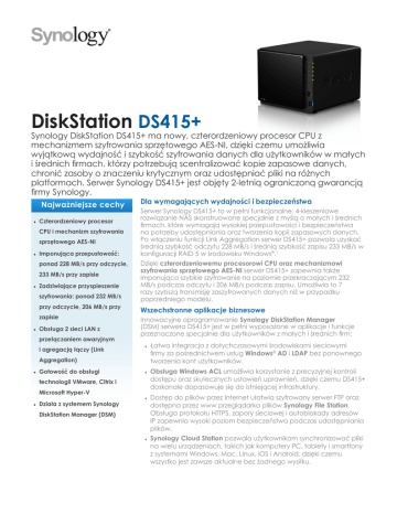 DiskStation DS415+ Synology DiskStation DS415+ ma nowy, czterordzeniowy procesor CPU z mechanizmem szyfrowania sprzętowego AES-NI, dzięki czemu umożliwia wyjątkową wydajność i szybkość szyfrowania danych dla użytkowników w małych i średnich firmach, którzy potrzebują scentralizować kopie zapasowe danych, chronić zasoby o znaczeniu krytycznym oraz udostępniać pliki na różnych platformach. Serwer Synology DS415+ jest objęty 2-letnią ograniczoną gwarancją firmy Synology. Najważniejsze cechy ●● Czterordzeniowy procesor CPU i mechanizm szyfrowania sprzętowego AES-NI ●● Imponująca przepustowość: ponad 228 MB/s przy odczycie, 233 MB/s przy zapisie ●● Zadziwiające przyspieszenie szyfrowania: ponad 232 MB/s przy odczycie, 206 MB/s przy zapisie ●● Obsługa 2 sieci LAN z przełączaniem awaryjnym i agregacją łączy (Link Dla wymagających wydajności i bezpieczeństwa Serwer Synology DS415+ to w pełni funkcjonalne, 4-kieszeniowe rozwiązanie NAS skonstruowane specjalnie z myślą o małych i średnich firmach, które wymagają wysokiej przepustowości i bezpieczeństwa na potrzeby udostępniania oraz tworzenia kopii zapasowych danych. Po włączeniu funkcji Link Aggregation serwer DS415+ pozwala uzyskać średnią szybkość odczytu 228 MB/s i średnią szybkość zapisu 233 MB/s w konfiguracji RAID 5 w środowisku Windows®.1 Dzięki czterordzeniowemu procesorowi CPU oraz mechanizmowi szyfrowania sprzętowego AES-NI serwer DS415+ zapewnia także imponująco szybkie szyfrowanie na poziomie przekraczającym 232 MB/s podczas odczytu i 206 MB/s podczas zapisu. Umożliwia to 7 razy szybszą transmisję zaszyfrowanych danych niż w przypadku poprzedniego modelu. Wszechstronne aplikacje biznesowe Innowacyjne oprogramowanie Synology DiskStation Manager (DSM) serwera DS415+ jest w pełni wyposażone w aplikacje i funkcje przeznaczone specjalnie dla użytkowników z małych i średnich firm: ●● Aggregation) ●● Gotowość do obsługi ●● technologii VMware, Citrix i Microsoft Hyper-V ●● Działa z systemem Synology ●● DiskStation Manager (DSM) ●● Łatwa integracja z dotychczasowymi środowiskami sieciowymi firmy za pośrednictwem usług Windows® AD i LDAP bez ponownego tworzenia kont użytkowników. Obsługa Windows ACL umożliwia korzystanie z precyzyjnej kontroli dostępu oraz skutecznych ustawień uprawnień, dzięki czemu DS415+ doskonale dopasowuje się do istniejącej infrastruktury. Dostęp do plików przez Internet ułatwia szyfrowany serwer FTP oraz dostępna przez www przeglądarka plików Synology File Station. Obsługa protokołu HTTPS, zapory sieciowej i autoblokady adresów IP zapewnia wysoki poziom bezpieczeństwa podczas udostępniania plików. Synology Cloud Station pozwala użytkownikom synchronizować pliki na wielu urządzeniach, takich jak komputery PC, tablety i smartfony z systemami Windows, Mac, Linux, iOS i Android, dzięki czemu wszystko jest zawsze aktualne bez żadnego wysiłku. Gotowy do wirtualizacji Synchronizacja plików między platformami Automatyczna synchronizacja plików pomiędzy DiskStation, komputerem PC i urządzeniami mobilnymi dzięki aplikacji Synology Cloud Station. Dostępność w każdej chwili Do serwera DiskStation można uzyskać dostęp z każdego miejsca za pośrednictwem aplikacji firmy Synology. Obsługa iSCSI w systemie DSM umożliwia stosowanie serwera DS415+ jako płynnie działającego rozwiązania pamięci masowej do środowisk zwirtualizowanych, w tym VMware®, Citrix®, i Hyper-V®. Zintegrowany z VMware vSphere 5 i VAAI serwer DS415+ umożliwia rozładowanie obciążenia związanego z niektórymi operacjami w pamięci masowej i optymalizuje wykorzystanie mocy obliczeniowej. W ten sposób zapewnia niezrównaną wydajność w środowiskach VMware. Jest to doskonała alternatywa dla rozwiązań SAN do zastosowań w przedsiębiorstwach. Szybki i ekonomiczny interfejs iSCSI umożliwia użytkownikom z małych i średnich firm konsolidowanie pamięci masowej w macierzach pamięci masowej w centrach danych i udostępnianie dysków działających tak jak lokalne. Synology QuickConnect i dostęp z dowolnego miejsca Użytkownicy, którzy nie dysponują publicznym adresem IP ani możliwością przekierowywania portów, mogą skorzystać z usługi QuickConnect dającej dostęp do serwera Synology NAS z dowolnego miejsca na świecie, nawet gdy serwer ten jest ukryty w sieci lokalnej. Dostosowywany identyfikator QuickConnect ID umożliwia logowanie się na serwerze Synology NAS z interfejsu przeglądarki DSM, komputerowych aplikacji Synology i aplikacji do urządzeń mobilnych. Firma Synology przygotowała aplikacje mobilne zapewniające dostęp do plików przechowywanych na serwerze DS415+ nawet w drodze. Dzięki temu można pracować w sposób bardziej elastyczny. Dostępna na platformach iOS, Android™ i Windows Phone aplikacja DS file umożliwia dostęp do plików na serwerze DS415+ i zarządzanie nimi w dowolnej chwili, a DS cloud umożliwia synchronizację danych w czasie rzeczywistym z określonych folderów współdzielonych na serwerze NAS, komputerach i urządzeniach mobilnych. Ułatwia to i przyspiesza zarządzanie chmurą prywatną. Kopia zapasowa danych i zabezpieczenia DS415+ obsługuje technologię Synology High Availability umożliwiającą łączenie serwera aktywnego i pasywnego w jeden klaster, w którym dane z jednego serwera mają lustrzane kopie na drugim. W przypadku awarii serwera głównego włącza się natychmiast serwer pasywny i przejmuje obsługę wszystkich działających usług oraz danych. Synology Hybrid RAID umożliwia optymalne wykorzystanie dysku twardego i ochronę pamięci masowej dzięki nadmiarowości danych. Kompletne rozwiązanie do kopii zapasowych, w tym Migawka jednostki LUN, Klonowanie jednostki LUN oraz Kopia zapasowa i replikacja, minimalizuje konsekwencje awarii. Energooszczędna, cicha konstrukcja zapewniająca chłodzenie Serwer Synology 