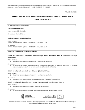 Przeprowadzenie szkoleń i superwizji dla pracowników Biura Karier w ramach projektu pt. „CZAS na zmiany! – Centrum Zaawansowanej Aktywizacji Studentów”, nr POWR.03.01.00-00-B101/15. Piła, 19.10.2016 r. WYKAZ ZMIAN WPROWADZONYCH DO OGŁOSZENIA O ZAMÓWIENIU z dnia 14.10.2016 r. I. INFORMACJE O OGŁOSZENIU Termin składania ofert Przed zmianą: 28.10.2016 r. Po zmianie: 02.11.2016 r. Miejsce i sposób składania ofert Przed zmianą: Termin składania ofert upływa – 28.10.2016 r. o godz. 12.00 Po zmianie: Termin składania ofert upływa – 02.11.2016 r. o godz. 12.00 II. OPIS PRZEDMIOTU ZAMÓWIENIA CZĘŚĆ 1: Szkolenie z używania Obrazkowego Testu Zawodów BBT M. Achtnicha (w tym narzędzia). Przed zmianą: j) Uczestnicy otrzymają zaświadczenie o ukończeniu szkolenia. Po zmianie: j) Uczestnicy otrzymają Zaświadczenie o ukończeniu szkolenia z metody Achtnicha tj. licencję nieograniczoną w czasie na wykonywanie badań metodą Achtnicha. CZĘŚĆ 2: Szkolenie z metody coachingowej Points Of You. Przed zmianą: j) Uczestnicy otrzymają zaświadczenie o ukończeniu szkolenia. Po zmianie: j) Uczestnicy otrzymają międzynarodowy certyfikat Praktyka Points Of You™ CZĘŚĆ 3: Szkolenie Certyfikowany Asesor Assessment & Development Centre. Przed zmianą: j) Uczestnicy otrzymają certyfikat o ukończeniu szkolenia. Po zmianie: j) Uczestnicy otrzymają certyfikat Asesora Assessment & Development Centre. Projekt realizowany w ramach Programu Operacyjnego Wiedza Edukacja Rozwój 2014-2020 współfinansowanego ze środków Europejskiego Funduszu Społecznego 1/4 Przeprowadzenie szkoleń i superwizji dla pracowników Biura Karier w ramach projektu pt. „CZAS na zmiany! – Centrum Zaawansowanej Aktywizacji Studentów”, nr POWR.03.01.00-00-B101/15. CZĘŚĆ 4: Szkolenie Design Thinking w biznesie. Przed zmianą: j) Uczestnicy otrzymają zaświadczenie o ukończeniu szkolenia., Po zmianie: j) Uczestnicy otrzymają certyfikat o ukończeniu szkolenia. CZĘŚĆ 5: Szkolenie na temat narzędzi coachingowych w rozwijaniu kompetencji i kariery studenta. Przed zmianą: j) Uczestnicy otrzymają zaświadczenie o ukończeniu szkolenia. Po zmianie: j) Uczestnicy otrzymają certyfikat o ukończeniu szkolenia. CZĘŚĆ 6: Szkolenie trenera programu "Spadochron". Przed zmianą: j) Uczestnicy otrzymają zaświadczenie o ukończeniu szkolenia. Po zmianie: j) Uczestnicy otrzymają licencję trenera programu „Spadochron". CZĘŚĆ 7: Superwizja dla doradców zawodowych, doradców ds. przedsiębiorczości oraz pracowników Biura Karier w zakresie świadczonych usług, mających na celu wsparcie studentów w rozpoczęciu aktywności zawodowej. Przed zmianą: e) Wykonawca zobowiązany jest do przygotowania i przekazania uczestnikom superwizji, w formie pisemnej, wniosków z obserwacji, uwag i spostrzeżeń po każdym dniu. Po zmianie: e) Wykonawca zobowiązany jest do przygotowania i przekazania uczestnikom superwizji, w formie pisemnej, wniosków z obserwacji, uwag i spostrzeżeń po każdym dniu, tj. informacji zwrotnej z rekomendacjami rozwoju. Przed zmianą: i) Uczestnicy otrzymają zaświadczenie o uczestnictwie w superwizji. Po zmianie: i) Uczestnicy otrzymają zaświadczenie/certyfikat o uczestnictwie w superwizji. Kod CPV Przed zmianą: 80500000-9 85312320-8 Projekt realizowany w ramach Programu Operacyjnego Wiedza Edukacja Rozwój 2014-2020 współfinansowanego ze środków Europejskiego Funduszu Społecznego 2/4 Przeprowadzenie szkoleń i superwizji dla pracowników Biura Karier w ramach projektu pt. „CZAS na zmiany! – Centrum Zaawansowanej Aktywizacji Studentów”, nr POWR.03.01.00-00-B101/15. Po zmianie: 80000000-4 Nazwa kodu CPV Przed zmianą: Usługi szkoleniowe Usługi doradztwa Po zmianie: Usługi edukacyjne i szkoleniowe 3. Osoby zdolne do wykonywania zamówienia Przed zmianą: CZĘŚĆ 1, 2, 3, 5, 6. Wykonawca dysponuje lub będzie dysponować co najmniej 1 osobą posiadającą: - wykształcenie wyższe pierwszego lub drugiego stopnia w rozumieniu przepisów o szkolnictwie wyższym. Preferowane wykształcenie wyższe magisterskie na kierunku: psychologia, socjologia, pedagogika, doradztwo zawodowe lub studia podyplomowe dotyczące problematyki rynku pracy (np. zawodoznawstwo) bądź doradztwa zawodowego; pożądane kursy uzupełniające z zakresu doradztwa zawodowego potwierdzone certyfikatami (zaświadczeniami), - co najmniej 3-letnie doświadczenie zawodowe jako doradca zawodowy/coach (w ostatnich 5 latach), poświadczone odpowiednimi dokumentami, - posiada umiejętności trenerskie zdobyte w toku działalności zawodowej, poświadczone odpowiednimi dokumentami. CZĘŚĆ 4 Wykonawca dysponuje lub będzie dysponować co najmniej 1 osobą posiadającą : - wykształcenie wyższe pierwszego lub drugiego stopnia w rozumieniu przepisów o szkolnictwie wyższym; preferowane wykształcenie wyższe magisterskie na kierunku: zarządzanie, prawo, doradztwo zawodowe, - co najmniej 3-letnie doświadczenie zawodowe w zakresie doradztwa w obszarze przedsiębiorczości (w ostatnich 5 latach), poświadczone odpowiednimi dokumentami, - posiada umiejętności trenerskie zdobyte w toku działalności zawodowej, poświadczone odpowiednimi dokumentami. CZĘŚĆ 7 Wykonawca dysponuje lub będzie dysponować co najmniej 1 osobą posiadającą : - wykształcenie wyższe pierwszego lub drugiego stopnia w rozumieniu przepisów o szkolnictwie wyższym; preferowane wykształcenie wyższe magisterskie na kierunku: psychologia, socjologia, pedagogika, doradztwo zawodowe lub studia podyplomowe dotyczące problematyki rynku pracy (np. zawodoznawstwo) bądź doradztwa zawodowego; pożądane kursy uzupełniające z zakresu doradztwa zawodowego potwierdzone certyfikatami (zaświadczeniami), - co najmniej 3-letnie doświadczenie zawodowe jako doradca zawodowy/coach/superwizor (w ostatnich 5 latach), poświadczone odpowiednimi dokumentami, - posiada umiejętności w zakresie doradztwa/coachingu zdobyte w tok