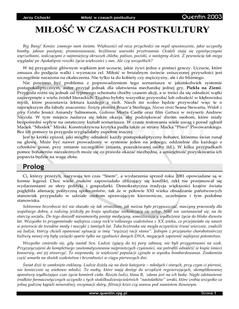Jerzy Cichocki Miłość w czasach postkultury Quentin 2003 MIŁOŚĆ W CZASACH POSTKULTURY Big Bang! Koniec znanego nam świata. Większości od razu przychodzi na myśl spustoszenie, jakie uczyniły bomby, jałowe pustynie, promieniowanie, bezlitosne warunki przetrwania. Ocaleli stają się egoistycznymi wyrzutkami, walczącymi o najmniejszy okruszek chleba, paliwo, pociski, o następny dzień. Z pewnością tak mogą wyglądać po Apokalipsie resztki życia większości z nas. Ale czy wszystkich? W tej przygodzie głównym wątkiem jest uczucie, jakie żywi jedna z postaci graczy. Uczucie, które zmusza do podjęcia walki i wyznacza cel. Miłość w brutalnym świecie zniszczonej przyszłości jest szczególnie narażona na okaleczenia. Nie tylko ta do kobiety czy mężczyzny, ale i do bliźniego. Nie powinno być problemu z poprowadzeniem tego scenariusza w jakimkolwiek systemie postapokaliptycznym, autor przyjął jednak dla ułatwienia mechanikę jednej gry, Piekła na Ziemi. Przygoda różni się jednak od typowego schematu choćby czasem akcji, a w treści da się odnaleźć wątki zaczerpnięte z wielu źródeł literackich. Trudno byłoby wszystkie przywołać lub odnaleźć w kłębowisku myśli, które pozostawia lektura każdego z nich. Niech mi wolno będzie przywołać więc te o największym dla fabuły znaczeniu: Święty płomień Bruce’a Sterlinga, Nocna straż Seana Stewarta, Widok z góry Futaba Jessici Amandy Salmonson, Gedeona Morta Castle oraz film Gattaca w reżyserii Andrew Niccola. W tym miejscu nadarza się także okazja, aby podziękować dwóm osobom, które miały bezpośredni wpływ na ostateczny kształt scenariusza. W czasie testowania wiele uwag i porad zgłosił Maciek “Miodek” Mirski. Konstruktywna krytyka padła także ze strony Maćka “Piwo” Piwowarskiego. Bez ich pomocy ta przygoda wyglądałaby zupełnie inaczej. Jest to krótki epizod, jaki mógłby odnaleźć każdy postapokaliptyczny bohater, któremu świat runął na głowę. Może być nawet prowadzony w systemie jeden na jednego, oddzielnie dla każdego z członków posse, przy zmianie szczegółów (miasta, poszukiwanej osoby itd.). W kilku przypadkach pomoc bohaterów niezależnych może się co prawda okazać niezbędna, a umiejętność pozyskiwania ich poparcia będzie na wagę złota. Prolog Ci, którzy przeżyli, nazywają ten czas “Snem”, a wydarzenia sprzed roku 2081 opowiadane są w formie legend. Choć wiele znaków zapowiadało zbliżający się konflikt, nikt nie przejmował się wydarzeniami ze sfery polityki i gospodarki. Demokratyczna tradycja większości krajów świata pogłębiła alienację polityczną społeczeństw, tak że w połowie XXI wieku obsadzanie państwowych stanowisk przypadało w udziale osobom sprawującym kierownicze, uczelniane i tym podobne stanowiska. Sektorowe bezrobocie też nie okazało się tak straszliwe, jak można było przypuszczać, maszyny pracowały dla wspólnego dobra, a rodziny jeździły po kraju spędzając niekończący się urlop. Nikt nie zastanawiał się, na ile starczy socjalu. Do tego doszedł niesamowity postęp medycyny, umożliwiający wydłużenie życia do blisko dwustu lat. Wszystko to przypominało najlepsze czasy rock’n’rollowego szaleństwa z XX wieku, co przejawiało się nawet w powrocie do trendów mody i muzyki z tamtych lat. Taka beztroska nie mogła oczywiście trwać wiecznie, znaleźli się ludzie, którzy chcieli opanować sytuację w imię “wyższej racji stanu”. Jednym z przejawów chorobotwórczej kultury nowej ery były związki oparte tylko na zgodności danych DNA, mogących zapewnić najlepsze potomstwo. Wszystko zmieniło się, gdy nastał Sen. Ludzie żyjący do tej pory zabawą, nie byli przygotowani na szok. Przyzwyczajeni do kompletnego zautomatyzowania najprostszych czynności, nie potrafili odnaleźć w kupie śmieci konserwy, ani jej otworzyć. To nieprawda, że większość populacji zginęła w wyniku bombardowania. Znakomita część umarła na skutek szaleństwa i bezradności w ciągu pierwszych dni. Świat dziś to zamknięte enklawy. Ludzie dzielą się na dwie kategorie – młodych i starych, przy czym ci pierwsi, nie koniecznie są wiekowo młodzi. To osoby, które mają dostęp do urządzeń regenerujących, skomplikowanej aparatury wydłużające czas życia komórek ciała. Reszta ludzi, klasa B, zdana jest na ich łaskę. Nagłe odstawienie środków farmaceutycznych uczyniło z tych stukilkudziesięcioletnich “nastolatków” wraki, które zrobią wszystko za jedną godzinę kąpieli mineralnej, enzymacji skóry, filtracji krwi czy seansu pod namiotem tlenowym. www.quentin.rpg.pl Strona 1 Jerzy Cichocki Miłość w czasach postkultury Quentin 2003 Miasta, które choć w części ocalały po Apokalipsie (zwykle takie, w pobliżu których bomby cudem zboczyły z trajektorii i epicentrum wybuchu znalazło się poza granicami zabudowań) podzielone są zazwyczaj na dwie części. Jedną zamieszkaną przez ludzi, drugą – przez duchy. Ocalali wpadli na ten pomysł przez przypadek i od tego czasu wieść roznosi się po całym Zachodzie. Wystarczą ofiary z ludzi, aby utrzymać wynaturzenia z dala od zamieszkanego centrum. Magiczna bariera z krwi potrafi je utrzymać. Więcej ofiar może posłużyć do całkowitego wypędzenia duchów z granic miasta. Czasem jednak udaje się jakiemuś potężniejszemu demonowi wyrwać z pułapki i czyni wtedy potworne zniszczenia. Właśnie w jednym z takich na wpół zniszczonych miast przyjdzie posse przeżyć przygodę. Zawiązanie Wydarzenia w jakich wezmą udział bohaterowie, odbywają się w kilka miesięcy po Apokalipsie. Szeryf powinien poświęcić nieco czasu przed rozpoczęciem przygody, aby “ustawić” graczy. Koniec świata nadal żyje w ich wspomnieniach, rozpacz po utracie rodziny jeszcze nie minęła. Spójrz do poniższej ramki, aby zapoznać się z sugestią dotyczącą składu drużyny. Załóżmy, że po