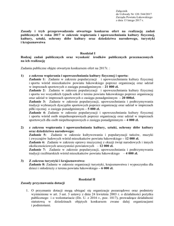Załącznik do Uchwały Nr 120 /344/2017 Zarządu Powiatu Łukowskiego z dnia 13 lutego 2017 r. Zasady i tryb przeprowadzenia otwartego konkursu ofert na realizację zadań publicznych w roku 2017 w zakresie wspierania i upowszechniania kultury fizycznej, kultury, sztuki, ochrony dóbr kultury oraz dziedzictwa narodowego, turystyki i krajoznawstwa Rozdział I Rodzaj zadań publicznych oraz wysokość środków publicznych przeznaczonych na ich realizację Zadania publiczne objęte otwartym konkursem ofert na 2017r. : 1) z zakresu wspierania i upowszechniania kultury fizycznej i sportu: Zadanie 1: Zadanie w zakresie popularyzacji i upowszechniania kultury fizycznej i sportu wśród mieszkańców powiatu łukowskiego poprzez organizację oraz udział w imprezach sportowych o zasięgu ponadgminnym – 21 000 zł. Zadanie 2: Zadanie w zakresie popularyzacji i upowszechniania kultury fizycznej i sportu we wszystkich typach szkół z terenu powiatu łukowskiego poprzez organizację oraz udział w imprezach sportowych o zasięgu ponadgminnym – 20 000zł. Zadanie 3: Zadanie w zakresie popularyzacji, upowszechniania i podtrzymywania tradycji wybranych dyscyplin sportowych poprzez organizację oraz udział w imprezach piłki ręcznej o zasięgu ponadgminnym – 5 000 zł. Zadanie 4: Zadanie w zakresie popularyzacji i upowszechniania kultury fizycznej i sportu wśród osób niepełnosprawnych poprzez organizację oraz udział w imprezach sportowych dla osób niepełnosprawnych o zasięgu ponadgminnym – 4 000 zł. 2) z zakresu wspierania i upowszechniania kultury, sztuki, ochrony dóbr kultury oraz dziedzictwa narodowego: Zadanie 5: Zadanie w zakresie kultywowania i popularyzacji tańców, muzyki i zwyczajów ludowych wśród mieszkańców powiatu łukowskiego – 12 000 zł. Zadanie 6: Zadanie w zakresie oprawy muzycznej z okazji świąt narodowych i innych okolicznościowych uroczystości powiatowych – 12 000 zł. Zadanie 7: Zadanie w zakresie popularyzacji, upowszechniania i podtrzymywania tradycji rzeźbiarskich wśród mieszkańców powiatu łukowskiego – 4 000 zł. 3) Z zakresu turystyki i krajoznawstwa: Zadanie 8: Zadanie w zakresie organizacji turystyki, krajoznawstwa i wypoczynku dla dzieci i młodzieży z terenu powiatu łukowskiego – 6 000 zł. Rozdział II Zasady przyznawania dotacji 1. O przyznanie dotacji mogą ubiegać się organizacje pozarządowe oraz podmioty wymienione w art. 3 ust. 3 ustawy z dnia 24 kwietnia 2003 r. o działalności pożytku publicznego i o wolontariacie (Dz. U. z 2016 r., poz. 1817), prowadzące działalność statutową w dziedzinach objętych konkursem zwane dalej organizacjami i podmiotami. 2. Zlecanie realizacji zadań, o których mowa w rozdziale I, nastąpi w formie wspierania i wykonywania tych zadań przez organizacje i podmioty przez udzielenie dotacji na dofinansowanie ich realizacji. 3. Oferent może złożyć jedną ofertę na wybrane zadanie lub kilka ofert, każda na inne zadanie objęte konkursem. 4. Dotacje na realizację zadań otrzymają podmioty, wybrane w niniejszym postępowaniu konkursowym. 5. Złożenie oferty nie jest równoznaczne z przyznaniem dotacji. 6. W ramach jednego zadania, dotacje może uzyskać więcej niż jeden wnioskodawca. 7. Wybór oferty nie gwarantuje przyznania środków w wysokości wskazanej przez wnioskodawcę. 8. W przypadku zaistnienia konieczności zmniejszenia kwoty dotacji w stosunku do wnioskowanej, oferent nie będzie związany złożoną ofertą. 9. Konkurs zostanie rozstrzygnięty także gdy wpłynie tylko jedna oferta na zadanie. Rozdział III Terminy i warunki realizacji zadań 1. Zadania publiczne winny zostać zrealizowane do 15 grudnia 2017 r. Terminy realizacji poszczególnych zadań określone zostaną w umowie zawartej pomiędzy wybraną organizacją lub podmiotem, a Powiatem Łukowskim. 2. Zadania winny być realizowane z najwyższą starannością, zgodnie z zawartą umową oraz obowiązującymi standardami i przepisami. 3. Szczegółowe warunki realizacji, finansowania i rozliczenia zadania zostaną określone w umowie, o której mowa w ust. 1. Rozdział IV Termin składania ofert 1. Ofertę w formie pisemnej wraz z wymaganymi dokumentami należy dostarczyć w zamkniętej kopercie do sekretariatu Starostwa Powiatowego w Łukowie, ul. Piłsudskiego 17, 21-400 Łuków, pok. 209 w terminie do dnia 7 marca 2017 r. do godz. 15.30. UWAGA – za termin złożenia oferty przyjmuje się datę i godzinę wpływu oferty do Starostwa Powiatowego w Łukowie. 2. Na kopercie należy umieścić pieczęć oferenta oraz opis w brzmieniu: „Konkurs ofert na realizację zadań publicznych w roku 2017 - zadanie nr…..”. W miejsce kropek należy wpisać nr zadania, którego wniosek dotyczy, wymieniony w Rozdziale I. 3. Złożona oferta musi być zgodna ze wzorem określonym w Rozporządzeniu Ministra Rodziny, Pracy i Polityki Społecznej z dnia 17 sierpnia 2016 r. w sprawie wzorów ofert i ramowych wzorów umów dotyczących realizacji zadań publicznych oraz wzorów sprawozdań z wykonania tych zadań (Dz. U., poz. 1300). 4. Do oferty należy dołączyć załączniki: 1) aktualny wypis z właściwego rejestru lub z ewidencji prowadzonej przez właściwy organ, potwierdzający status prawny oferenta i osób reprezentujących go; 2) w przypadku oferty wspólnej umowę partnerską lub oświadczenie partnerów o wspólne ubieganie się o realizację zadania. 5. Załączniki do oferty należy składać w oryginale lub poświadczone za zgodność z oryginałem przez uprawnione osoby. 6. W przypadku złożenia przez jednego oferenta więcej niż jednej oferty, dopuszcza się złożenie jednego kompletu załączników ze wskazaniem, do której oferty zostały dołączone. 7. Oferty złożone po terminie, sporządzone niewłaściwie bądź niekompletne oraz złożone na niewłaściwych drukach, nie będą rozpatrywane ze względów formalnych i zostaną wykazane w protokole otwarcia ofert jako niespełniające w
