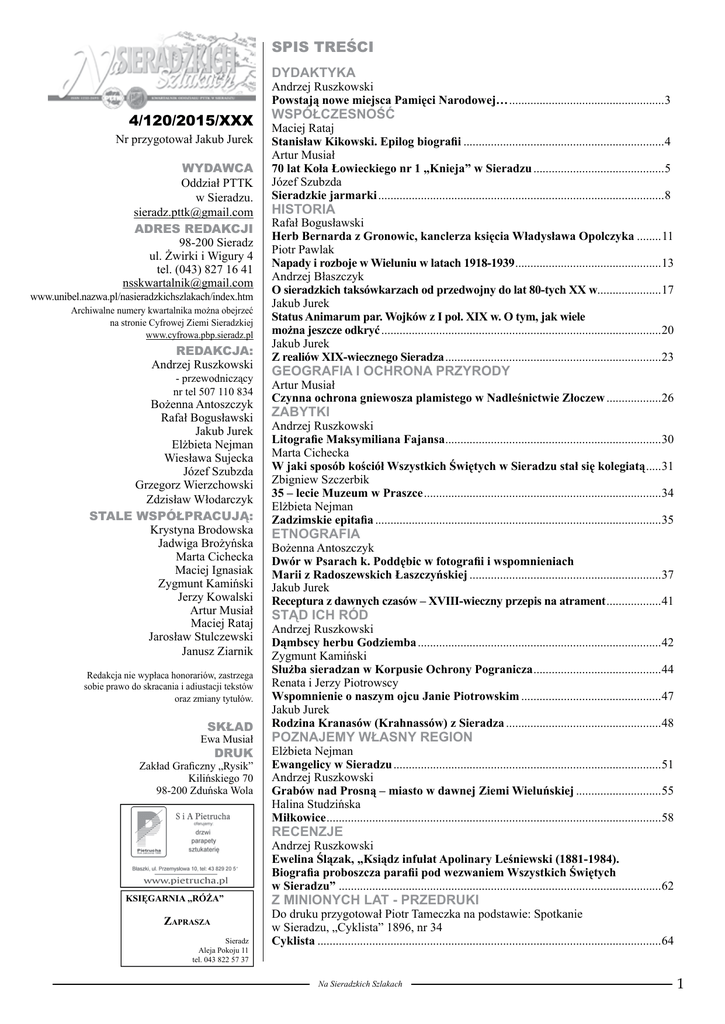 SPIS TREŚCI DYDAKTYKA Andrzej Ruszkowski Powstają nowe miejsca Pamięci Narodowej… ...................................................3 4/120/2015/XXX Nr przygotował Jakub Jurek WYDAWCA Oddział PTTK w Sieradzu. [email protected] ADRES REDAKCJI 98-200 Sieradz ul. Żwirki i Wigury 4 tel. (043) 827 16 41 [email protected] www.unibel.nazwa.pl/nasieradzkichszlakach/index.htm Archiwalne numery kwartalnika można obejrzeć na stronie Cyfrowej Ziemi Sieradzkiej www.cyfrowa.pbp.sieradz.pl REDAKCJA: Andrzej Ruszkowski - przewodniczący nr tel 507 110 834 Bożenna Antoszczyk Rafał Bogusławski Jakub Jurek Elżbieta Nejman Wiesława Sujecka Józef Szubzda Grzegorz Wierzchowski Zdzisław Włodarczyk STALE WSPÓŁPRACUJĄ: Krystyna Brodowska Jadwiga Brożyńska Marta Cichecka Maciej Ignasiak Zygmunt Kamiński Jerzy Kowalski Artur Musiał Maciej Rataj Jarosław Stulczewski Janusz Ziarnik Redakcja nie wypłaca honorariów, zastrzega sobie prawo do skracania i adiustacji tekstów oraz zmiany tytułów. SKŁAD Ewa Musiał DRUK Zakład Graficzny „Rysik” Kilińskiego 70 98-200 Zduńska Wola WSPÓŁCZESNOŚĆ Maciej Rataj Stanisław Kikowski. Epilog biografii ..................................................................4 Artur Musiał 70 lat Koła Łowieckiego nr 1 „Knieja” w Sieradzu ...........................................5 Józef Szubzda Sieradzkie jarmarki ..............................................................................................8 HISTORIA Rafał Bogusławski Herb Bernarda z Gronowic, kanclerza księcia Władysława Opolczyka ........11 Piotr Pawlak Napady i rozboje w Wieluniu w latach 1918-1939 ................................................13 Andrzej Błaszczyk O sieradzkich taksówkarzach od przedwojny do lat 80-tych XX w.....................17 Jakub Jurek Status Animarum par. Wojków z I poł. XIX w. O tym, jak wiele można jeszcze odkryć ............................................................................................20 Jakub Jurek Z realiów XIX-wiecznego Sieradza .......................................................................23 GEOGRAFIA I OCHRONA PRZYRODY Artur Musiał Czynna ochrona gniewosza plamistego w Nadleśnictwie Złoczew ..................26 ZABYTKI Andrzej Ruszkowski Litografie Maksymiliana Fajansa.......................................................................30 Marta Cichecka W jaki sposób kościół Wszystkich Świętych w Sieradzu stał się kolegiatą .....31 Zbigniew Szczerbik 35 – lecie Muzeum w Praszce ..............................................................................34 Elżbieta Nejman Zadzimskie epitafia ..............................................................................................35 ETNOGRAFIA Bożenna Antoszczyk Dwór w Psarach k. Poddębic w fotografii i wspomnieniach Marii z Radoszewskich Łaszczyńskiej ...............................................................37 Jakub Jurek Receptura z dawnych czasów – XVIII-wieczny przepis na atrament ..................41 STĄD ICH RÓD Andrzej Ruszkowski Dąmbscy herbu Godziemba ................................................................................42 Zygmunt Kamiński Służba sieradzan w Korpusie Ochrony Pogranicza ..........................................44 Renata i Jerzy Piotrowscy Wspomnienie o naszym ojcu Janie Piotrowskim ..............................................47 Jakub Jurek Rodzina Kranasów (Krahnassów) z Sieradza ...................................................48 POZNAJEMY WŁASNY REGION Elżbieta Nejman Ewangelicy w Sieradzu ........................................................................................51 Andrzej Ruszkowski Grabów nad Prosną – miasto w dawnej Ziemi Wieluńskiej ............................55 Halina Studzińska Miłkowice ..............................................................................................................58 RECENZJE KSIĘGARNIA ,,RÓŻA” ZAPRASZA Sieradz Aleja Pokoju 11 tel. 043 822 57 37 Andrzej Ruszkowski Ewelina Ślązak, „Ksiądz infułat Apolinary Leśniewski (1881-1984). Biografia proboszcza parafii pod wezwaniem Wszystkich Świętych w Sieradzu” ..........................................................................................................62 Z MINIONYCH LAT - PRZEDRUKI Do druku przygotował Piotr Tameczka na podstawie: Spotkanie w Sieradzu, „Cyklista” 1896, nr 34 Cyklista .................................................................................................................64 Na Sieradzkich Szlakach 1 DYDAKTYKA Powstają nowe miejsca Pamięci Narodowej… Andrzej Ruszkowski I. W czwartek 3 IX br. uczestniczyłem w Mszy św. za poległych w dniu 3 IX 1939 roku nad Dąbrową Wielką lotników z 1(21) EBL 2 Pułku Lotniczego z Krakowa1. Obecne były władze gminy, mieszkańcy Dąbrowy, inicjatorzy i społeczni wykonawcy pomnika. Po nabożeństwie udaliśmy się pod „lotniczy krzyż”, by odmówić modlitwy za poległych, wysłuchać z taśmy marsza lotników polskich2, przygotowanych przez uczniów miejscowej szkoły wierszy oraz przemówienia wójta gminy Sieradz. Uroczystości towarzyszył podniosły nastrój. Spod krzyża, otoczone zniczami, spoglądały na zgromadzonych utrwalone na portretach postacie poległych żołnierzy. To miejsce Pamięci Narodowej powstało w 2011 roku z inicjatywy Roberta Kielka – mieszkańca Dąbrowy. II. Wkrótce powstanie następne miejsce Pamięci Narodowej. Jego uroczyste odsłonięcie jest planowane na 11 listopada br. Burmistrz Warty, Jan Serafiński postanowił ufundować krzyż w miejscu śmierci ppor. obs. Zdzisława Mutkowskiego z 36 Eskadry Obserwacyjnej 3 Pułku Lotniczego z Poznania, który w dniu 11 IX 39 wykonywał, na rzecz Grupy Operacyjnej gen. Edmunda St. Knolla-Kownackiego, zadanie rozpoznania przeprawy niemieckiej przez Wartę w miejscowości Miłkowice. Polski samolot, Lublin R-XIII/D, został zestrzelony3 przez niemiecką OPL nad wsią Wola Miłkowsk