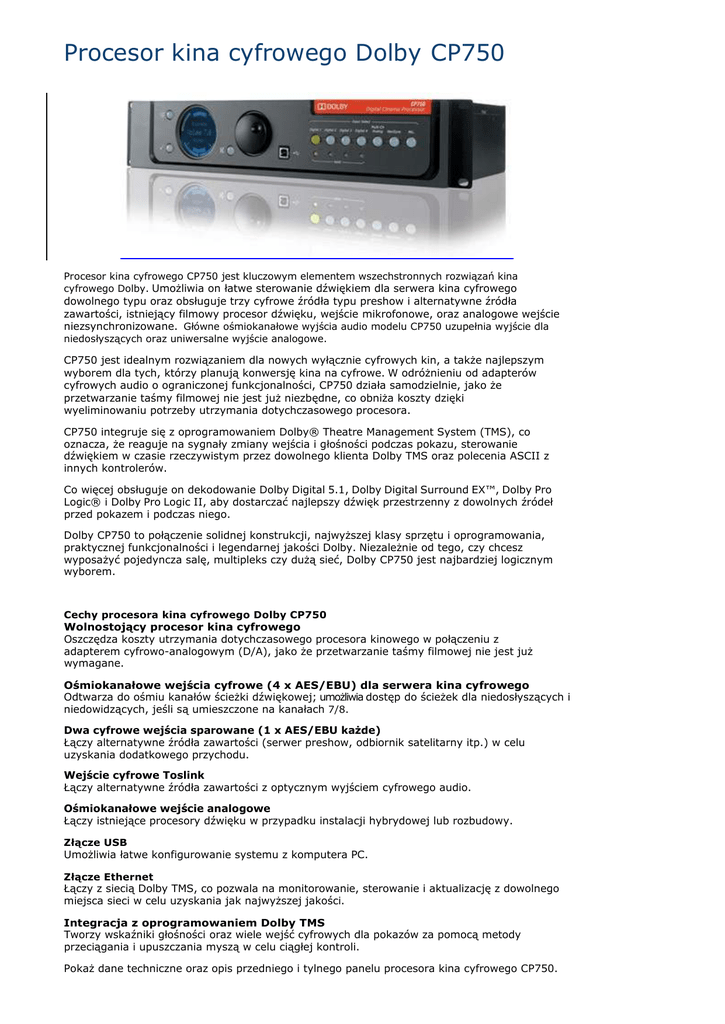 Procesor kina cyfrowego Dolby CP750 Digital Cinema Processor Procesor kina cyfrowego CP750 jest kluczowym elementem wszechstronnych rozwiązań kina cyfrowego Dolby. Umożliwia on łatwe sterowanie dźwiękiem dla serwera kina cyfrowego dowolnego typu oraz obsługuje trzy cyfrowe źródła typu preshow i alternatywne źródła zawartości, istniejący filmowy procesor dźwięku, wejście mikrofonowe, oraz analogowe wejście niezsynchronizowane. Główne ośmiokanałowe wyjścia audio modelu CP750 uzupełnia wyjście dla niedosłyszących oraz uniwersalne wyjście analogowe. CP750 jest idealnym rozwiązaniem dla nowych wyłącznie cyfrowych kin, a także najlepszym wyborem dla tych, którzy planują konwersję kina na cyfrowe. W odróżnieniu od adapterów cyfrowych audio o ograniczonej funkcjonalności, CP750 działa samodzielnie, jako że przetwarzanie taśmy filmowej nie jest już niezbędne, co obniża koszty dzięki wyeliminowaniu potrzeby utrzymania dotychczasowego procesora. CP750 integruje się z oprogramowaniem Dolby® Theatre Management System (TMS), co oznacza, że reaguje na sygnały zmiany wejścia i głośności podczas pokazu, sterowanie dźwiękiem w czasie rzeczywistym przez dowolnego klienta Dolby TMS oraz polecenia ASCII z innych kontrolerów. Co więcej obsługuje on dekodowanie Dolby Digital 5.1, Dolby Digital Surround EX™, Dolby Pro Logic® i Dolby Pro Logic II, aby dostarczać najlepszy dźwięk przestrzenny z dowolnych źródeł przed pokazem i podczas niego. Dolby CP750 to połączenie solidnej konstrukcji, najwyższej klasy sprzętu i oprogramowania, praktycznej funkcjonalności i legendarnej jakości Dolby. Niezależnie od tego, czy chcesz wyposażyć pojedyncza salę, multipleks czy dużą sieć, Dolby CP750 jest najbardziej logicznym wyborem. Cechy procesora kina cyfrowego Dolby CP750 Wolnostojący procesor kina cyfrowego Oszczędza koszty utrzymania dotychczasowego procesora kinowego w połączeniu z adapterem cyfrowo-analogowym (D/A), jako że przetwarzanie taśmy filmowej nie jest już wymagane. Ośmiokanałowe wejścia cyfrowe (4 x AES/EBU) dla serwera kina cyfrowego Odtwarza do ośmiu kanałów ścieżki dźwiękowej; umożliwia dostęp do ścieżek dla niedosłyszących i niedowidzących, jeśli są umieszczone na kanałach 7/8. Dwa cyfrowe wejścia sparowane (1 x AES/EBU każde) Łączy alternatywne źródła zawartości (serwer preshow, odbiornik satelitarny itp.) w celu uzyskania dodatkowego przychodu. Wejście cyfrowe Toslink Łączy alternatywne źródła zawartości z optycznym wyjściem cyfrowego audio. Ośmiokanałowe wejście analogowe Łączy istniejące procesory dźwięku w przypadku instalacji hybrydowej lub rozbudowy. Złącze USB Umożliwia łatwe konfigurowanie systemu z komputera PC. Złącze Ethernet Łączy z siecią Dolby TMS, co pozwala na monitorowanie, sterowanie i aktualizację z dowolnego miejsca sieci w celu uzyskania jak najwyższej jakości. Integracja z oprogramowaniem Dolby TMS Tworzy wskaźniki głośności oraz wiele wejść cyfrowych dla pokazów za pomocą metody przeciągania i upuszczania myszą w celu ciągłej kontroli. Pokaż dane techniczne oraz opis przedniego i tylnego panelu procesora kina cyfrowego CP750. Procesor kina cyfrowego Dolby CP750 Digital Cinema Processor Dane techniczne Panel przedni +powiększ Wejście cyfrowe 1 4 × AES, 25-stykowe żeńskie złącze D obsługuje cztery pary kanałów wejść AES/EBU Impedancja wejściowa: 110 Ω (symetryczne) Wejścia cyfrowe 2, 3 1 × AES męskie złącza BNC, niesymetryczne, ale płynne, dla AES-3id-1995/SMPTE 276M Wielokanałowe wejście analogowe Ośmiokanałowe, żeńskie 25-stykowe złącze D, symetryczne analogowe, wejściowa impedancja różnicowa 10K Poziom referencyjny: 300 mV Wejście niesynchroniczne Dwukanałowe złącze RCA, impedancja wejściowa 21K, regulowany poziom wejściowy. Impedancja wejściowa: 75 Ω Wejście mikrofonowe Wejście cyfrowe 4 Złącze optyczne Toslink™ Złącze XLR, standardowy układ styków, wejściowa impedancja różnicowa 10K, dostępne zasilanie fantomowe 12 V, regulowany uzysk Panel tylny +powiększ Główne wyjście audio Ośmiokanałowe, męskie 25-stykowe złącze D, symetryczne, płynne analogowe, wyjściowa impedancja różnicowa 100 Ω Nie obciążać poniżej impedancji różnicowej 600 Ω Wyjście uniwersalne Dwa kanały, niesymetryczne analogowe, impedancja wyjściowa 100 Ω, złącza RCA Poziom referencyjny: 200 mV Zawsze prowadzi parę kanałów 7/8 dla wejść 4 × AES do alternatywnego użycia, takiego jak nadajniki H/I i VI-N — to wyjście o ustalonym poziomie nie ma żadnego EQ i nie jest sterowane przez pokrętło regulatora głośności Wyjście dla niedosłyszących Jeden kanał, niesymetryczne analogowe, impedancja wyjściowa 100 Ω, złącze RCA Środek jest sumą ważoną lewego, środkowego i prawego kanału. Poziom wyjściowy: 200 mV