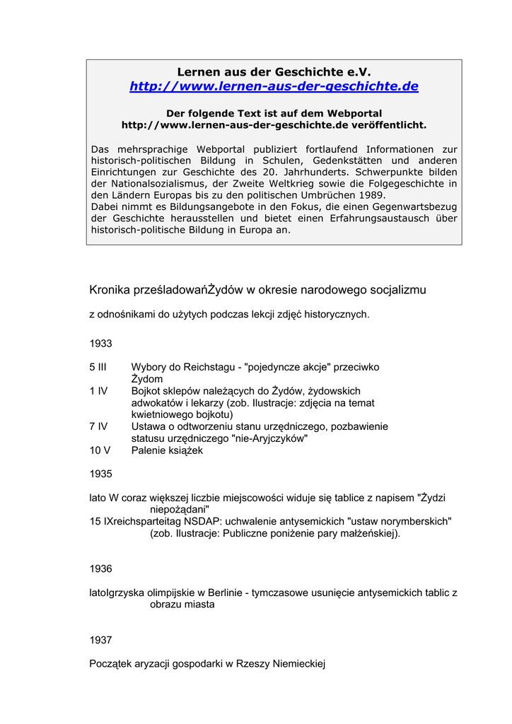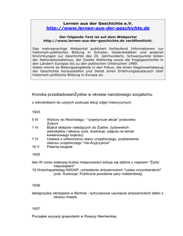 Lernen aus der Geschichte e.V. http://www.lernen-aus-der-geschichte.de Der folgende Text ist auf dem Webportal http://www.lernen-aus-der-geschichte.de veröffentlicht. Das mehrsprachige Webportal publiziert fortlaufend Informationen zur historisch-politischen Bildung in Schulen, Gedenkstätten und anderen Einrichtungen zur Geschichte des 20. Jahrhunderts. Schwerpunkte bilden der Nationalsozialismus, der Zweite Weltkrieg sowie die Folgegeschichte in den Ländern Europas bis zu den politischen Umbrüchen 1989. Dabei nimmt es Bildungsangebote in den Fokus, die einen Gegenwartsbezug der Geschichte herausstellen und bietet einen Erfahrungsaustausch über historisch-politische Bildung in Europa an. Kronika prześladowańŻydów w okresie narodowego socjalizmu z odnośnikami do użytych podczas lekcji zdjęć historycznych. 1933 5 III 1 IV 7 IV 10 V Wybory do Reichstagu - "pojedyncze akcje" przeciwko Żydom Bojkot sklepów należących do Żydów, żydowskich adwokatów i lekarzy (zob. Ilustracje: zdjęcia na temat kwietniowego bojkotu) Ustawa o odtworzeniu stanu urzędniczego, pozbawienie statusu urzędniczego "nie-Aryjczyków" Palenie książek 1935 lato W coraz większej liczbie miejscowości widuje się tablice z napisem "Żydzi niepożądani" 15 IXreichsparteitag NSDAP: uchwalenie antysemickich "ustaw norymberskich" (zob. Ilustracje: Publiczne poniżenie pary małżeńskiej). 1936 latoIgrzyska olimpijskie w Berlinie - tymczasowe usunięcie antysemickich tablic z obrazu miasta 1937 Początek aryzacji gospodarki w Rzeszy Niemieckiej 12 VI Tajne rozporządzenie Heydricha: "hańbiciele rasy" po odsiedzeniu kary więzienia są przekazywani do obozów koncentracyjnych. 1938 13 III Anszlus Austrii (zob. Ilustracje: Wiedeńscy Żydzi musząszorować ulice; Żydowski chłopiec musi mazać sklep ojca). 6 VII Konferencja w Evian: narada na temat losu Żydów chcących wyemigrować z Rzeszy Niemieckiej 28 XPonad 17 000 Żydów polskiego pochodzenia zostaje wypędzonych do Polski (tzw. Akcja Polska) 6 XIHerschel Grynszpan zabija pracownika ambasady niemieckiej w Paryżu Ernsta vom Ratha. 9 XIPogrom listopadowy, tak zwana noc kryształowa - około 30 000 Żydów w Rzeszy Niemieckiej zostaje aresztowanych i osadzonych w różnych obozach koncentracyjnych (zob. Ilustracje: Spalona synagoga w Oldenburgu). 15 XIŻydowskie dzieci także oficjalnie nie mogą już uczęszczaćdo szkół powszechnych (zob. Ilustracje: Wyszydzanie dwóch żydowskich uczniów). 28 XIWprowadzenie ograniczeń w swobodnym wyborze miejsca zamieszkania przez Żydów 3 XII Rozporządzenie o "przymusowym zbywaniu" małych przedsiębiorstw i sklepów przez żydowskich właścicieli 1939 17 I Zniesienie ochrony najemców dla Żydów 30 I W przemówieniu na forum Reichstagu Hitler przepowiada "zagładę rasy żydowskiej w Europie". 1 IXNapaść na Polskę, początek prześladowania Żydów w okupowanej Polsce (zob. Ilustracje: Niemieccy żołnierze w Polsce) 21 IX Heydrich wydaje rozkaz tworzenia gett w okupowanej Polsce; ich administracja ma podlegać "radom żydowskim". 12 X Pierwsze deportacje Żydów z Austrii i Moraw do Polski 23 XI Wprowadzenie "gwiazdy żydowskiej" w Generalnym Gubernatorstwie 28 XIHans Frank wydaje rozkaz tworzenia rad żydowskich w centralnej Polsce; pierwsze getto na ziemiach polskich w Piotrkowie. 1940 10 II Początek deportacji z Pomorza do Lublina 9 IV Napaść Niemiec na Danię 27 IV Himmler wydaje rozkaz utworzenia obozu koncentracyjnego w Oświęcimiu/Auschwitz. 30 IV Utworzenie getta w Łodzi 10 V Napaść Niemiec na Holandię, Belgię, Luksemburg i Francję 3X Uchwalenie antysemickich ustaw w Vichy, Francja 16 XRozkaz utworzenia getta w Warszawie 15 XIIzolacja od świata getta warszawskiego 1941 25 II "Februari-Staking", strajk przeciwko antyżydowskim zarządzeniom w wielu miastach Holandii 7 III Wykorzystywanie Żydów do pracy przymusowej w Rzeszy Niemieckiej koniec maja Utworzenie "einsatzgruppen" 22 VI Napaść Niemiec na ZSRR 31 VII Göring powierza Heydrichowi "ostateczne rozwiązanie kwestii żydowskiej". 1 IX Wprowadzenie w Rzeszy Niemieckiej "gwiazdy żydowskiej" dla Żydów od szóstego roku życia 3 IX Pierwsze zagazowania w Auschwitz 14 X Rozkaz rozpoczęcia deportacji niemieckich Żydów do Łodzi 8 XII Utworzenie obozu zagłady w Chełmnie/Kulmhof; masakra w Rydze 1942 20 I Konferencja w Wannsee w sprawie "ostatecznego rozwiązania kwestii żydowskiej" 31 I Einsatzgruppe A informuje o wymordowaniu 229 052 Żydów w republikach nadbałtyckich. 1 III Początek mordowania Żydów w obozie zagłady w Sobiborze 16 III Utworzenie obozu zagłady w Bełżcu 1 VI Utworzenie obozu zagłady w Treblince 22 VII Początek masowych deportacji z getta warszawskiego do Bełżca i Treblinki 28 VII Utworzenie Żydowskiej Organizacji Bojowej (ŻOB) w getcie warszawskim 16 IX Zakończenie pierwszego "przesiedlenia" w getcie łódzkim, które pochłonęło około 55 000 ofiar17 XII Alianci obiecują, że ukarzą odpowiedzialnych zawymordowanie europejskich Żydów. 1943 18 I Początek oporu przeciwko deportacjom w getcie warszawskim 22 III Uruchomienie pierwszego z nowych krematoriów w Auschwitz-Birkenau 19 IV Rozpoczęcie "likwidacji" getta warszawskiego, wybuch powstania w getcie 16 V Koniec getta warszawskiego 11 VI Himmler wydaje rozkaz "likwidacji" gett na ziemiach polskich. 26 VI Himmler rozkazuje także "likwidację" gett na okupowanych terytoriach ZSRR. 2 XUratowanie około 7000 duńskich Żydów przez duński ruch oporu; niemieckim okupantom udaje się zatrzymać 475 Żydów. 1944 15 V Początek deportacji węgierskich Żydów; do 8 lipca 1944 zostaje wywiezionych do Auschwitz około 476 000. 24 VII Wyzwolenie obozu zagłady w Majdanku przez wojska radzieckie; wymordowano tam 50 000 do 60 000 Żydów. 26 XI Himmler wydaje rozkaz zniszczenia krematoriów w Auschwitz-Birkenau. 1945 17 I Rozpoczęcie "marszów śmierci" z Auschwitz 27 I Wyzwolenie obozu w Auschwitz przez wojska radzieckie 11 IV Wyzwolenie