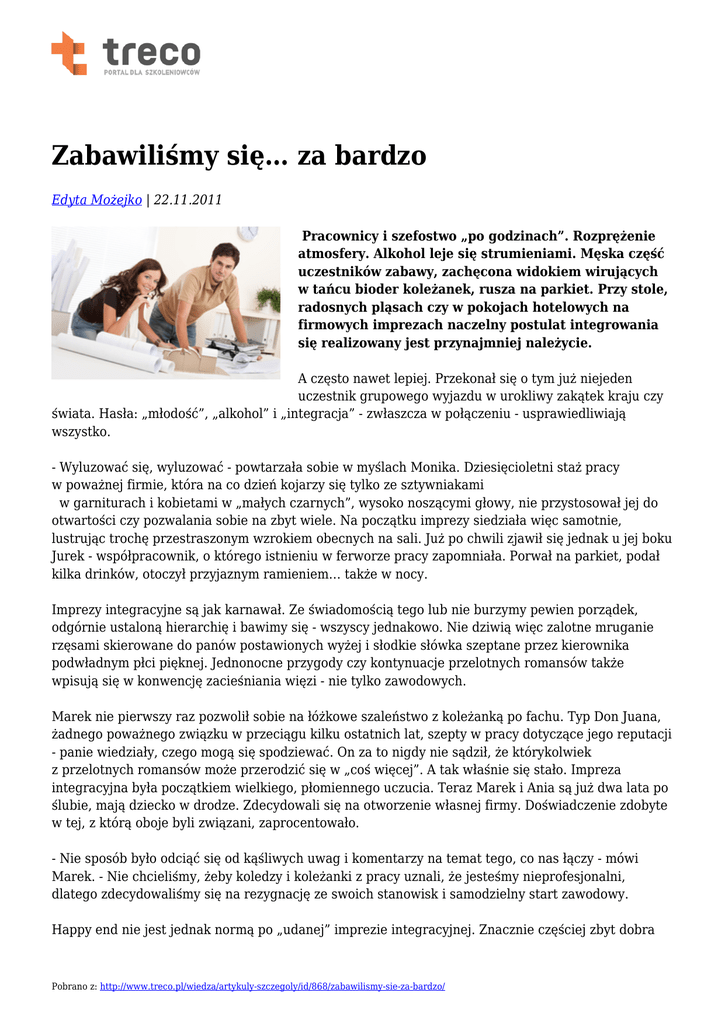 Zabawiliśmy się… za bardzo Edyta Możejko | 22.11.2011 Pracownicy i szefostwo „po godzinach”. Rozprężenie atmosfery. Alkohol leje się strumieniami. Męska część uczestników zabawy, zachęcona widokiem wirujących w tańcu bioder koleżanek, rusza na parkiet. Przy stole, radosnych pląsach czy w pokojach hotelowych na firmowych imprezach naczelny postulat integrowania się realizowany jest przynajmniej należycie. A często nawet lepiej. Przekonał się o tym już niejeden uczestnik grupowego wyjazdu w urokliwy zakątek kraju czy świata. Hasła: „młodość”, „alkohol” i „integracja” - zwłaszcza w połączeniu - usprawiedliwiają wszystko. - Wyluzować się, wyluzować - powtarzała sobie w myślach Monika. Dziesięcioletni staż pracy w poważnej firmie, która na co dzień kojarzy się tylko ze sztywniakami w garniturach i kobietami w „małych czarnych”, wysoko noszącymi głowy, nie przystosował jej do otwartości czy pozwalania sobie na zbyt wiele. Na początku imprezy siedziała więc samotnie, lustrując trochę przestraszonym wzrokiem obecnych na sali. Już po chwili zjawił się jednak u jej boku Jurek - współpracownik, o którego istnieniu w ferworze pracy zapomniała. Porwał na parkiet, podał kilka drinków, otoczył przyjaznym ramieniem… także w nocy. Imprezy integracyjne są jak karnawał. Ze świadomością tego lub nie burzymy pewien porządek, odgórnie ustaloną hierarchię i bawimy się - wszyscy jednakowo. Nie dziwią więc zalotne mruganie rzęsami skierowane do panów postawionych wyżej i słodkie słówka szeptane przez kierownika podwładnym płci pięknej. Jednonocne przygody czy kontynuacje przelotnych romansów także wpisują się w konwencję zacieśniania więzi - nie tylko zawodowych. Marek nie pierwszy raz pozwolił sobie na łóżkowe szaleństwo z koleżanką po fachu. Typ Don Juana, żadnego poważnego związku w przeciągu kilku ostatnich lat, szepty w pracy dotyczące jego reputacji - panie wiedziały, czego mogą się spodziewać. On za to nigdy nie sądził, że którykolwiek z przelotnych romansów może przerodzić się w „coś więcej”. A tak właśnie się stało. Impreza integracyjna była początkiem wielkiego, płomiennego uczucia. Teraz Marek i Ania są już dwa lata po ślubie, mają dziecko w drodze. Zdecydowali się na otworzenie własnej firmy. Doświadczenie zdobyte w tej, z którą oboje byli związani, zaprocentowało. - Nie sposób było odciąć się od kąśliwych uwag i komentarzy na temat tego, co nas łączy - mówi Marek. - Nie chcieliśmy, żeby koledzy i koleżanki z pracy uznali, że jesteśmy nieprofesjonalni, dlatego zdecydowaliśmy się na rezygnację ze swoich stanowisk i samodzielny start zawodowy. Happy end nie jest jednak normą po „udanej” imprezie integracyjnej. Znacznie częściej zbyt dobra Pobrano z: http://www.treco.pl/wiedza/artykuly-szczegoly/id/868/zabawilismy-sie-za-bardzo/ zabawa skutkuje kacem moralnym - informacją, że to, co się wydarzyło, było pomyłką i nie mogą dowiedzieć się o tym osoby trzecie - lub… rozpadem związku. Ostatnie wiąże się oczywiście z „wyjściem na jaw” epizodu, który miał miejsce. Często, przytłoczeni wyrzutami sumienia, sami się do takowych przyznajemy. Hania, od piętnastu lat żona Łukasza, nie mogła dojść do ładu ze sobą, kiedy małżonek oświadczył jej, że jednorazowo przespał się z inną. Nie pomagały tłumaczenia, że to tylko seks, że bez miłości, po alkoholu itp. - Nie wyobrażam sobie, że miałbym jej nie powiedzieć. Kocham ją, popełniłem błąd i byłem świadomy, że muszę ponieść jego konsekwencje - mówi Łukasz. - Zaczęło się niewinnie. Na co dzień niedostępna koleżanka pojawiła się przy barze w odsłaniającej dekolt i fenomenalne nogi sukience. Zapomniałem się. Na chwilę. Przecież każdemu się to zdarza - dodaje, rozkładając ręce w przepraszającym geście. Hania jest zdruzgotana. - Było nam dobrze, nic nie zapowiadało takiego obrotu spraw. Nie potrafię wybaczyć. Cały czas mam w głowie obrazy z wszystkich poprzednich imprez, na których mąż bywał. I chociaż zarzeka się, że to jeden jedyny raz, mój umysł generuje setki niestworzonych historii. Nie mam powodu, by wierzyć w to, co mówi. Tak, jak przedtem nie miałam przesłanek ku temu, by mu nie wierzyć. To koniec. Jest jednak pewna grupa społeczna, której zintegrowanie się za bardzo może służyć. To ludzie nastawieni na robienie kariery i zdobywanie prestiżu. Żyjemy w czasach, kiedy coraz więcej spośród nas już nie tylko pracuje, ale wręcz żyje pracą, nie mając czasu na nic poza nią. W takiej sytuacji jedyne kontakty, jakie mamy, to te ze współpracownikami - zarówno zawodowe, jak i „po godzinach”. Czy jest wtedy jakakolwiek szansa, by kogoś bliżej poznać? Tak, właśnie choćby podczas zabawy firmowej. - Pracowałam naprawdę całymi dniami - mówi Marzena. Pracuje w firmie informatycznej, a w tej branży „nie ma zmiłuj” - trzeba być na bieżąco. - Wracałam do domu i dalej zajmowałam się sprawami zawodowymi - opowiada. - Szukałam informacji o dodatkowych kursach, czytałam specjalistyczne książki, śledziłam artykuły branżowe. W tym wszystkim brakowało mi czasu dla siebie, na wyjście do prawdziwych, realnych ludzi, z rzeczywistymi problemami i radościami. Kiedyś firma zorganizowała kilkudniowy wypad w góry. Gdyby był nastawiony na samą zabawę, pewnie bym nie pojechała, ale że miała być połączona z nauką - nie mogłam przepuścić okazji. - Tyle, że w którymś momencie integracja zdecydowanie wzięła górę nad elementami szkoleniowymi w trakcie wyjazdu. Oboje od dawna byliśmy sami, oboje zakochani w tym, co robimy, to nie mogło skończyć się inaczej - śmieje się, dopowiadając, Paweł. Nie przespali się ze sobą na imprezie. Ani po. Wystarczył niewinny flirt, który kontynuowali już po wyjeździe. Teraz spotykają się regu