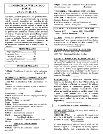 III NIEDZIELA WIELKIEGO POSTU 28 LUTY 2016 r. Nie mów: „Jestem w porządku”, „Są gorsi ode mnie”. Nie trać energii na porównywanie się z innymi. A jeśli wreszcie dochodzisz do wniosku, że nie potrafisz kochać, że wciąż kochasz za mało, że twoje życie nie przynosi owoców miłości, to zwróć się do Chrystusa-Ogrodnika i pozwól, by On się o ciebie zatroszczył. Uwierz, że jeśli „pokornie przyznasz się do przewinień”, zostaniesz od nich przez Chrystusa uwolniony. Wszyscy jesteśmy grzesznikami, wszyscy potrzebujemy nawrócenia – metanoi, czyli odnowy w naszym myśleniu. Drogę do niej wskazuje Kościół, który mówi, że post, modlitwa i jałmużna to naprawdę skuteczne lekarstwa na nasze grzechy. O. Przemysław Ciesielski OP & Łukasz Kubiak OP, „Oremus PIEŚNI MSZALNE 1 Ogrodzie Oliwny….…………..103 2. Ach mój Jezu……..…………….90 3. Witam Cię witam …………..…165 4. Zawitaj Ukrzyżowany …..……114 5. Jezu Chryste…….........................95 INTENCJE MSZALNE 7:00pm +Anna Kopeć (3-cia r. śm.) córka Małgorzata z rodz. (Lantana) II III NIEDZIELA WIELKIEGO POSTU 28.II. 2016 9:00AM + Stanisław Klimko – żona, dzieci i wnuki 11:00 AM za zmarłych z rodz. Gastomczyk – M. Gastom 3:30PM ++ Stefan i Antonina Mysak w rocznicę śmierci – żona i synowa (Miami) Poniedziałek - 29 luty 8:00am O zdrowie dla Wacława od przyjaciół i Marysi Wtorek 1 marzec 8:00 am + Hank – od przyjaciół Środa - 2 marzec 8:00am - Dziękczynna za otrzymane łaski, szczególnie za łaskę zdrowia otrzymaną przez wstawiennictwo Bogurodzicy - Katarzyna Czwartek – 3 marzec 8:00am + Ireneusz Baska - przyjaciel Piątek - 4 marzec św. Kazimierza I-szy Piątek miesiąca 7:00 pm o zdrowie dla Teresy i dalszą opiekę – mąż Henryk Po mszy św. Droga Krzyżowa Sobota 5 marzec 8:00 am o zdrowie dla Kazimierza Trzeciak przyjaciele 7:00pm +Stella Kulas, oraz Siostra Maria, Bonaventura od siostrzenicy z rodz. (Lantana) IV NIEDZIELA WIELKIEGO POSTU 6.III. 2016 9:00AM Przez wstawiennictwo św. Michała Archanioła o bezpieczeństwo i opiekę dla Mateusza w Jego misji - Mama 11:00 AM + Mirosława Licznerska oraz Helena i Stanisław Foerster - Dzieci 3:30PM za zmarłych z rodziny Danikowskich, Branisława, Gustaw i Władysław (Miami) KOLEKTA – II Niedziela Postu – 21.II. 2016 Pompano $1571 Lantana $450 Miami $285 II – taca „Fundusz Remontowy” $334 II – taca – dzisiaj jest przeznaczona na „Fundusz Remontowy” a w następnym tygodniu II taca będzie przeznaczona na „Church in Latin America” Za wszelkie ofiary serdeczne Bóg zapłać!. ************** LEKTORZY NA NIEDZIELĘ 28. II. 2016 9:00 AM - Renata $ Krzysztof Tomaszewski 11:00 AM – Joanna & Mirosław Cieślak ************ KWIATY I ŚWIECA DO TABERNAKULUM - z wielką wdzięcznością przyjmujemy ofiary na kwiaty do kościoła lub świecę do tabernakulum. Zakup świeżych kwiatów na niedzielę kosztuje ok. $100 a świeca $10. Ten gest ofiarny można uczynić dla uczczenia pamięci zmarłych i żywych lub za otrzymane łaski. Świeca w tym tygodniu została ofiarowana za otrzymane łaski i dalszą opiekę i zdrowie dla Teresy, od męża Henryka i synów Andrzeja i Roberta. Za ten gest serdeczne Bóg zapłać! ************** KAWIARENKA - Zgłoszenia dyżurów proszę kierować do Państwa Ewy i Irka Otfinowskich, tel. (954) 422-5434 – dziękuję za pomoc! W ubiegłą niedzielę dyżur w kawiarence pełniły, Krysia, Eugenia i Hania. Dochód wyniósł $371. w tym ofiara na kościół od rodziców polskiej szkoły $100 (Lenka i Arek Słowik oraz Ania i Andrzej Pastewski) po $50. Serdeczne Bóg zapłać. Kolejne osoby mogą wpisać się na dyżur w kawiarence. Zapraszamy! *************** NABOŻEŃSTWA WIELKOPOSTNE DROGA KRZYŻOWA - W każdy piątek po Mszy św. o godz. 8:30pm GORZKIE ŻALE - w niedzielę 20 minut przed Mszą św. o 10:40AM * w sobotę w Lantanie o godz. 6:40PM; w Miami o godz. 3:10PM. ************ W środę Popielcową gościem naszej Misji był Ks. Tadeusz Szyjka z Krasnojarska na dalekiej Syberii. Specjalna zbiórka była wsparciem dla dzielnego kapłana – misjonarza. Ks. Tadeusz zadzwonił i serdecznie podziękował za złożone dary w wysokości $2300. W Jego imieniu składam serdeczne Bóg zapłać. ************* Pomoc Kościołowi w Płd. Ameryce W naszym biuletynie zamieszczamy list Ks. Abpa Thomas Wenski odnośnie przyszłotygodniowej specjalnej kolekty w całej naszej Archidiecezji na pomoc Kościołowi w Ameryce południowej. Prosimy o przeczytanie listu, bo to pomoże nam lepiej zrozumieć ideę pomocy naszym braciom w biednych krajach Ameryki południowej. Liczymy także na otwarte serca i życzliwe wsparcie. Serdeczne Bóg zapłać. Serdeczne podziękowanie kierujemy do p. Henryka i Teresy Bielawski za donację $500 na klęczniki. TELEFONY KOMÓRKOWE Bardzo proszę o wyłączanie swoich telefonów przed wejściem do kościoła. Dziękuję za współpracę. Odszedł do wieczności śp. Lucjan Dąbrowski, ojciec Ks. Klemensa Dąbrowskiego. Wczoraj odbyła się uroczystość pogrzebowa. Ks. Klemensowi składamy głębokie wyrazy współczucia. Wieczny odpoczynek racz Mu dać Panie, a światłość wiekuista niechaj mu świeci. OGŁOSZENIA POLONIJNE Oferta: Pani poszukuje małe mieszkanie lub samodzielny pokój do wynajęcia w okolicach WPB, Lake Worth, lub Lantana. Anna - tel:954-934-5026 (3x) Oferta: Do wynajęcia mieszkanie 1/1 w Pompano Beach na parterze, umeblowane lub bez, basen, security , całkowity remodeling. Tel: 954-608-4552 (4x) Oferta: do sprzedania umeblowane mieszkanie 2/2 blisko plaży, blisko kościoła w Pompano Beach tel.954856-4272 Oferta: Kręgarz/ Chiropraktor w Pompano Beach tel. 843-360-3955 www.grzegorzjablonski.pl (3x) Oferta: Kobieta lat 45 poszukuje pracy. Z Zawodu krawcowa, może również być praca przy sprzątaniu lub opieka nad starszą osobą. Tel:773-510-5447 lub 860984-2112 Oferta: Odpowiedzialna pracowit