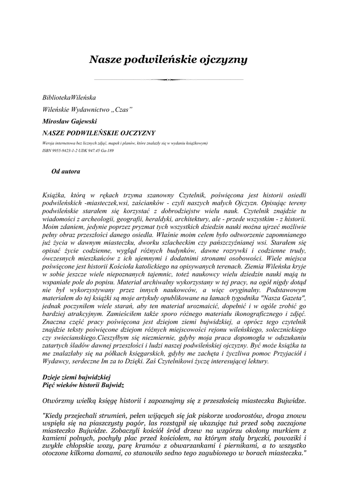 Nasze podwileńskie ojczyzsy BibliotekaWileńska Wileńskie Wydawnictwo „Czas” Mirosław Gajewski NASZE PODWILEŃSKIE OJCZYZNY Wersja internetowa bez licznych zdjęć, mapek i planów, które znalazły się w wydaniu książkowym) ISBN 9955-9423-1-2 UDK 947.45 Ga-189 Od autora Książka, którą w rękach trzyma szanowny Czytelnik, poświęcona jest historii osiedli podwileńskich -miasteczek,wsi, zaścianków - czyli naszych małych Ojczyzn. Opisując tereny podwileńskie starałem się korzystać z dobrodziejstw wielu nauk. Czytelnik znajdzie tu wiadomości z archeologii, geografii, heraldyki, architektury, ale - przede wszystkim - z historii. Moim zdaniem, jedynie poprzez pryzmat tych wszystkich dziedzin nauki można ujrzeć możliwie pełny obraz przeszłości danego osiedla. Właśnie moim celem było odtworzenie zapomnianego już życia w dawnym miasteczku, dworku szlacheckim czy pańszczyźnianej wsi. Starałem się opisać życie codzienne, wygląd różnych budynków, dawne rozrywki i codzienne trudy, ówczesnych mieszkańców z ich ujemnymi i dodatnimi stronami osobowości. Wiele miejsca poświęcone jest historii Kościoła katolickiego na opisywanych terenach. Ziemia Wileńska kryje w sobie jeszcze wiele niepoznanych tajemnic, toteż naukowcy wielu dziedzin nauki mają tu wspaniałe pole do popisu. Materiał archiwalny wykorzystany w tej pracy, na ogół nigdy dotąd nie był wykorzystywany przez innych naukowców, a więc oryginalny. Podstawowym materiałem do tej książki są moje artykuły opublikowane na łamach tygodnika "Nasza Gazeta", jednak poczyniłem wiele starań, aby ten materiał urozmaicić, dopełnić i w ogóle zrobić go bardziej atrakcyjnym. Zamieściłem także sporo różnego materiału ikonograficznego i zdjęć. Znaczna część pracy poświęcona jest dziejom ziemi bujwidzkiej, a oprócz tego czytelnik znajdzie teksty poświęcone dziejom różnych miejscowości rejonu wileńskiego, solecznickiego czy swiecianskiego.Cieszyłbym się niezmiernie, gdyby moja praca dopomogła w odszukaniu zatartych śladów dawnej przeszłości i ludzi naszej podwileńskiej ojczyzny. Być może książka ta me znalazłaby się na półkach księgarskich, gdyby me zachęta i życzliwa pomoc Przyjaciół i Wydawcy, serdeczne Im za to Dzięki. Zaś Czytelnikowi życzę interesującej lektury. Dzieje ziemi bujwidzkiej Pięć wieków historii Bujwidz Otwórzmy wielką księgę historii i zapoznajmy się z przeszłością miasteczka Bujwidze. "Kiedy przejechali strumień, pełen wijących się jak piskorze wodorostów, droga znowu wspięła się na piaszczysty pagór, las rozstąpił się ukazując tuż przed sobą zaczajone miasteczko Bujwidze. Zobaczyli kościół śród drzew na wzgórzu okolony murkiem z kamieni polnych, pochyły plac przed kościołem, na którym stały bryczki, powoziki i zwykłe chłopskie wozy, parę kramów z obwarzankami i piernikami, a to wszystko otoczone kilkoma domami, co stanowiło sedno tego zagubionego w borach miasteczka." Taki widok mieli przed oczyma bohaterowie książki T. Konwickiego pt. "Bohiń". Zresztą w utworach Konwickiego Bujwidze są wspominane dość często. Teraźniejsze osiedle Bujwidze to nieduża miejscowość na płn. - wsch. krańcu rejonu wileńskiego, tuż przy granicy państwowej. Mieści się tu także centrum gminy i parafii bujwidzkiej. Gmina bujwidzka jest zamieszkana w zdecydowanej większości przez Polaków (według danych z roku 1990 w gminie było 1367 mieszkańców, z czego 1297 stanowią Polacy, 13 - Litwini, 30 - Rosjanie oraz 27 - inne narodowości).Osiedle nie ma teraz żadnych znaczniejszych zabytków architektonicznych ani historycznych, kompensują to jednak walory przyrodnicze - zakola Wilii, łagodne wzgórza morenowe, sosnowe bory. Jest to zresztą teren charakterystyczny dla okolic Wilna. Chociaż oficjalna nazwa osiedla brzmi Buivydżiai, jednak miejscowi mieszkańcy używają starej, przedwojennej nazwy Bujwidze. W najstarszych dokumentach archiwalnych z XVI wieku nazwa osady brzmi trochę inaczej - Bujwidy bądź Bojwidy. Pochodzenie nazwy osiedla jest trudne do objaśnienia. Sami mieszkańcy Bujwidz tak oto tłumaczą pochodzenie nazwy swego osiedla: - Pewnego razu Napoleon stał na górze i zobaczył, że w dolinie toczy się walka pomiędzy Francuzami a Rosjanami. Zobaczył i powiedział - "Bój widzę". Stąd jakoby nazwa miasteczka - Bujwidze. Prawdopodobnie opowieść tę można zaliczyć do legend, mającą niedużo wspólnego z prawdą. Nazwę raczej trzeba wywodzić od dość pospolitego niegdyś imienia bądź nazwiska "Bujwid". Nazwa mogła powstać od mieszkającej tu niegdyś rodziny, noszącej nazwisko Bujwid, chociaż opisy z XVI wieku nie wymieniają już tu mieszkających ludzi o tak brzmiącym nazwisku. Osada założona była na lewym brzegu Wilii, przy ujściu dwóch niedużych strumieni. Większy z nich, zwany teraz Bujwidką, w dokumentach archiwalnych ma, co najmniej trzy wersje nazwy. Spotkałem następujące -Mejłupis, Montka, Munduć. Są to nazwy oryginalne i mające na pewno bardzo stare pochodzenie. Miejsce dawnej osady jest trudne do zlokalizowania, nie przeprowadzano, bowiem w okolicach Bujwidz badań archeologicznych. Ludzie mieszkają tu od dawna, o czym świadczą położone w lasach przy zaścianku Wesełucha kurhany ciałopalne (VIII - XII wiek). Zresztą okolice tych kurhanów mogły też mieć dawniej inne przeznaczenie. Jeszcze w XIX wieku i dawniej istniał tu zaścianek Święty (czasami nazywany Światełka). Sądząc z nazwy, która pochodzi zapewne z czasów pogańskich, mogło tu istnieć jakieś centrum kultu religijnego. Nasuwa się zatem wniosek, że ziemia kryje w sobie wiele tajemnic, potrzebne są tu jednak gruntowne badania archeologiczne. W czasach późniejszych Bujwidze i okolice miały należeć do lokalnego księstwa Nalszcza (później stało się ono dzielnicą Księstwa Litewskiego). Kilka kilometrów na wschód prawdopodobnie przech