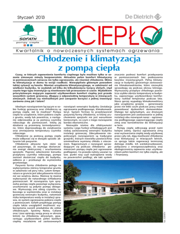 Styczeñ 2013 EKOCIEP£O Kwartalnik o nowoczesnych systemach ogrzewania Chłodzenie i klimatyzacja z pompą ciepła Idealnym rozwiązaniem łączącym w sobie funkcję grzewczą oraz chłodniczą są pompy ciepła. Jak to możliwe? Pompa ciepła to urządzenie, które pobiera ciepło z gruntu, wody lub powietrza, a następnie odprowadza je za pomocą czynnika roboczego do pomieszczeń. Istotą jej działania są przemiany termodynamiczne, które doprowadzają do zwiększenia oraz zmniejszenia temperatury czynnika roboczego. Chłodzenie za pomocą pompy ciepła może odbywać się w dwojaki sposób: aktywnie lub pasywnie. Chłodzenie aktywne tym różni się od pasywnego, że wymaga dostarczenia energii elektrycznej i uruchomienia sprężarki. Poprzez odwrócenie kierunku przepływu czynnika roboczego, pompa zamiast dostarczać ciepło do budynku, odbiera je i przekazuje do wymiennika gruntowego. Pasywna forma chłodzenia polega na wykorzystaniu różnicy temperatur gruntu w zależności od pory roku. Latem temperatura w gruncie jest zdecydowanie niższa niż we wnętrzu domu. Różnicę tę można wykorzystać do naturalnego schładzania pomieszczeń. W rozwiązaniu tym sprężarka pompy ciepła pozostaje wyłączona, uruchamiane są jedynie pompy obiegowe. Wymuszają one obieg czynnika roboczego w wymienniku oraz w instalacji grzewczej wewnątrz budynku, natomiast niska temperatura wody w instalacji sprawia, że system ogrzewania pobiera ciepło z pomieszczeń. Sofath projektując pompy ciepła także uwzględnił możliwość wykorzystania swoich produktów do celów chłodniczych. Systemy Natea, Caliane oraz Lizea opierają swoją pracę w okresie letnim na chłodzeniu aktywnym, gwarantując użytkownikom pełen komfort cieplny niezależnie od zastosowanych rozwiązań wewnątrz budynku (instalacja ogrzewania podłogowego, klimakonwektory). System Termeo to przedstawiciel pasywnej formy chłodzenia, w której uruchomienie sprężarki nie jest warunkiem koniecznym, co czyni z niego rozwiązanie bardzo ekonomiczne. Niezwykle istotne dla efektywności systemu i jego funkcji schładzających jest rodzaj zastosowanej wewnątrz budynku instalacji grzewczej. Zdecydowanie niepolecanym rozwiązaniem są tradycyjne grzejniki, których niewielka powierzchnia uniemożliwia wymianę chłodu z otoczeniem. Najprostszym z rozwiązań sprawdzającym się podczas chłodzenia pomieszczeń pompą ciepła jest ogrzewanie podłogowe. Co prawda należy uważać na tzw. punkt rosy czyli wykraplanie wody na powierzchni podłogi, ale taki system znacznie podnosi komfort przebywania w pomieszczeniach bez podnoszenia kosztów inwestycyjnych. Pełną klimatyzację w budynku gwarantuje zastosowanie klimakonwektorów, które niezwykle sprawdzają się podczas okresu letniego. Wymuszony przepływ chłodnego powietrza szybko obniża temperaturę w budynku, zapewniając użytkownikowi komfortowy rozkład temperatur podczas lata. Nieco gorzej wypadają klimakonwektory jako urządzenia grzejne – generowany przez nie lekki szum podczas pracy może powodować dyskomfort domowników. Dlatego też optymalnym, acz droższym rozwiązaniem jest zastosowanie w jednej instalacji obu rozwiązań naraz – ogrzewania podłogowego zapewniającego ciepło zimą oraz konwektorów do klimatyzacji w lecie. Pompy ciepła odkrywają przed nami kolejne zalety. Oprócz ogrzewania zimą oraz wytwarzania ciepłej wody użytkowej przez cały rok, dają możliwość chłodzenia oraz klimatyzacji w miesiącach letnich, co sprzyja także regeneracji termicznej dolnego źródła. Ich wielokierunkowość, połączona z energooszczędnością oraz ekologicznością zapewnia więc użytkownikom pełen komfort nie tylko cieplny, ale i finansowy. fot. SOFATH Czasy, w których zapewnienie komfortu cieplnego było możliwe tylko w sezonie zimowym minęły bezpowrotnie. Aktualnie pełen komfort klimatyczny w pomieszczeniach oznacza nie tylko ogrzewanie, ale również chłodzenie. Mimo to klimatyzacja w domu to wciąż rzadkość. Niewątpliwie głównym powodem takiej sytuacji są koszta. Montaż urządzenia klimatyzacyjnego, w zależności od wielkości budynku, to wydatek od kilku do kilkudziesięciu tysięcy złotych, stąd często tego typu inwestycje są niwelowane lub przesuwane w czasie. Wydatkiem priorytetowym mającym zapewnić użytkownikom komfort cieplny jest przede wszystkim system grzewczy, dbający o odpowiednią temperaturę w miesiącach zimowych. Jednak czy niemożliwym jest czerpanie korzyści z jednej inwestycji zarówno zimą jak i latem? Kronika instalacji Dom o powierzchni użytkowej: 275 m2 Położenie: Wiśniowa k. Dobczyc, woj. małopolskie Instalacja: Pompa ciepła Caliane Ca 15.10 z opcją c.w.u. (zasobnik 250 l) Uruchomienie instalacji: październik 2012 Instalator: DUMARCH-WENT GEO POWER Inwestor: Pan Czesław Wcześniej ogrzewał Pan dom za pomocą kotła olejowego, a ciepłą wodę użytkową uzyskiwał Pan z elektrycznego podgrzewacza. Jakie zauważa Pan różnice między tymi rozwiązaniami, a zainstalowaną pompą ciepła Caliane. Zauważam, jedną bardzo ważną różnicę: koszty eksploatacyjne. W ciągu ostatnich kilku lat cena oleju opałowego stale wzrastała. Doszło do tego, że koszty ogrzania domu, przez okres grzewczy, wyniosły mnie ponad 8 000 zł. Należy pamiętać o dodatkowych kosztach podgrzewu ciepłej wody. Porównując to z pompą ciepła, widzę duże oszczędności. Nawet trzykrotne. Bezobsługowość rozwiązania również jest warta pochwały, wszystko wykonuje pełna automatyka urządzenia. Co może nam Pan powiedzieć o efektywności ogrzewania? Dom, w którym została zainstalowana pompa Caliane, jest podzielony na dwie strefy ogrzewania. Na przyziemiu grzejniki, a na piętrze i poddaszu ogrzewanie podłogowe. Wystarczyło kilka minut od uruchomienia aby można było poczuć ciepło grzejnika na dłoni. Na razie przed nami zima, która zweryfikuje wszystko, ale jestem pełen optymizmu, ponie