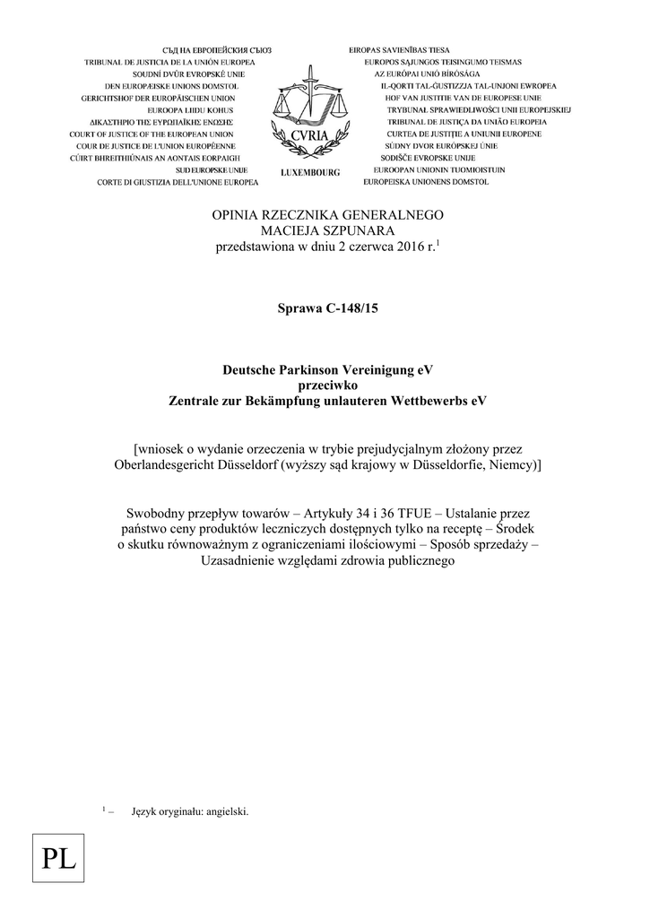 OPINIA RZECZNIKA GENERALNEGO MACIEJA SZPUNARA przedstawiona w dniu 2 czerwca 2016 r.1 Sprawa C-148/15 Deutsche Parkinson Vereinigung eV przeciwko Zentrale zur Bekämpfung unlauteren Wettbewerbs eV [wniosek o wydanie orzeczenia w trybie prejudycjalnym złożony przez Oberlandesgericht Düsseldorf (wyższy sąd krajowy w Düsseldorfie, Niemcy)] Swobodny przepływ towarów – Artykuły 34 i 36 TFUE – Ustalanie przez państwo ceny produktów leczniczych dostępnych tylko na receptę – Środek o skutku równoważnym z ograniczeniami ilościowymi – Sposób sprzedaży – Uzasadnienie względami zdrowia publicznego 1 PL – Język oryginału: angielski. DEUTSCHE PARKINSON VEREINIGUNG I– Wprowadzenie 1. Problematyką art. 36 TFUE2 Trybunał zajmował się zanim nawet wypracowano zasady bezpośredniej skuteczności czy pierwszeństwa prawa3. Rozstrzyganie między unijnym interesem w swobodnym przepływie a interesami państw członkowskich, realizujących pozagospodarcze cele polityki publicznej, jest delikatnym zadaniem, które z upływem czasu nie straciło znaczenia. Wręcz przeciwnie – te same kwestie prawne pojawiają się na nowo w kontekście różnych okoliczności faktycznych. Niniejsza sprawa świadczy o tym, że postanowienia traktatu dotyczące rynku wewnętrznego, a w szczególności swobodnego przepływu towarów, nadal stanowią istotę porządku prawnego Unii i jej struktury gospodarczej. 2. Niniejsze odesłanie prejudycjalne złożone przez Oberlandesgericht Düsseldorf (wyższy sąd krajowy w Düsseldorfie, Niemcy), który pragnie upewnić się, czy system, na mocy którego produkty lecznicze dostępne tylko na receptę mogą być przedmiotem jednolitych cen, jest zgodny z art. 34 i 36 TFUE, wyraźnie świadczy o znaczeniu postanowień dotyczących swobodnego przepływu towarów. 3. Niezależnie od tej kwestii i w mniej oczywisty sposób sprawa ta dostarcza kolejnego przykładu znaczenia postępowania prejudycjalnego. W wyniku rozbieżnego orzecznictwa dwóch z niemieckich sądów najwyższych – Bundessozialgericht (federalny sąd ds. socjalnych) i Bundesgerichtshof (federalny trybunał sprawiedliwości) – odnośnie do zgodności z prawem spornych przepisów w świetle art. 34 i 36 TFUE, wspólna izba najwyższych sądów federalnych4 orzekła, że przepisy te są zgodne z prawem Unii5. Gdyby nie Oberlandesgericht Düsseldorf, który moim zdaniem słusznie żywi wątpliwości co do tej zgodności, sprawa nigdy nie dotarłaby do Trybunału. 2 – Dawniej art. 30 WE (traktat z Amsterdamu) i art. 36 EWG (traktat rzymski). 3 – Pierwszy wyrok dotyczący art. 36 TFUE (wówczas EWG), Komisja/Włochy (7/61, EU:C:1961:31), został wydany w dniu 19 grudnia 1961 r., natomiast wyrok van Gend & Loos (26/62, EU:C:1963:1) w dniu 5 lutego 1963 r., zaś Costa (6/64, EU:C:1964:66) w dniu 15 lipca 1964 r. 4 – Ta wspólna izba, przewidziana w art. 95 ust. 3 niemieckiej ustawy zasadniczej (konstytucji), ma na celu, zgodnie z tym przepisem, „zachowanie jednolitości orzecznictwa” niemieckich sądów najwyższych, jest organem powoływanym ad hoc tylko w nadzwyczajnym wypadku, kiedy najwyższe sądy niemieckie różnią się w swoim orzecznictwie. Podejmuje ona wiążącą decyzję w sprawie. Jej szczegółowe zadania i skład są określone w specjalnej ustawie – Gesetz zur Wahrung der Einheitlichkeit der Rechtsprechung der obersten Gerichtshöfe des Bundes z dnia 19 czerwca 1968 r. (BGBl. I, s. 661–664). 5 – Zobacz GmS-OGB, postanowienie z dnia 22 sierpnia 2012 r., dostępne na: https://openjur.de/u/617231.html. Orzeczenie to jako ostatnie z wydanych przez ten organ jest faktycznie dopiero czternastym orzeczeniem od chwili utworzenia wspólnej izby w 1968 r., zob. https://openjur.de/gericht_e-235–0-ed-desc.html. I-1 OPINIA M. SZPUNARA – SPRAWA C-148/15 4. W końcu powinniśmy nazwać rzecz po imieniu: do Trybunału zwrócono się po raz trzeci o ocenę zgodności uregulowania niemieckiego z postanowieniami traktatu dotyczącymi swobodnego przepływu w sprawie, w której niderlandzka apteka DocMorris stara się uzyskać dostęp do rynku niemieckiego. W pierwszej sprawie, w której stronami byli Deutscher Apothekerverband eV, 0800 DocMorris NV i Jacques Waterval6, do Trybunału zwrócono się o zbadanie, czy niemiecki zakaz sprzedaży wysyłkowej produktów leczniczych, których sprzedaż w danym państwie członkowskim jest zastrzeżona dla aptek, był zgodny z art. 34 i 36 TFUE. Trybunał orzekł, że o ile rozpatrywany środek stanowił środek o skutku równoważnym w rozumieniu art. 34 TFUE, o tyle można było powołać się na art. 36 TFUE w odniesieniu do produktów leczniczych wymagających recepty w Niemczech, ale nie do produktów niewymagających recepty. Druga sprawa – a właściwie sprawy połączone, w których stronami w postępowaniu były Apothekerkammer des Saarlandes i in., Saarland, Ministerium für Justiz, Gesundheit und Soziales (C-171/07) oraz Helga Neumann-Seiwert, Saarland, Ministerium für Justiz, Gesundheit und Soziales (C-172/07)7 – dotyczyła tego, czy postanowienia traktatu odnoszące się do przedsiębiorczości8 sprzeciwiają się przepisom niemieckim, które zakazują posiadania i prowadzenia aptek osobom niemającym statusu farmaceuty (Fremdbesitzverbot). Trybunał orzekł, że swoboda przedsiębiorczości nie wyklucza Fremdbesitzverbot. 5. W następstwie pierwszej sprawy, w której stroną była DocMorris, Niemcy zmieniły swoje ustawodawstwo i zezwoliły na sprzedaż wysyłkową nie tylko produktów leczniczych niewymagających recepty, lecz również dostępnych tylko na receptę. Z informacji dostarczonych Trybunałowi wynika, że przynajmniej czasowo brak było przepisów dotyczących jednolitych cen w odniesieniu do produktów leczniczych dostępnych tylko na receptę importowanych z innych państw członkowskich. Później przepisy takie zaczęto stosować również do tych produktów. Prowadzi nas to do ram prawnych. II 