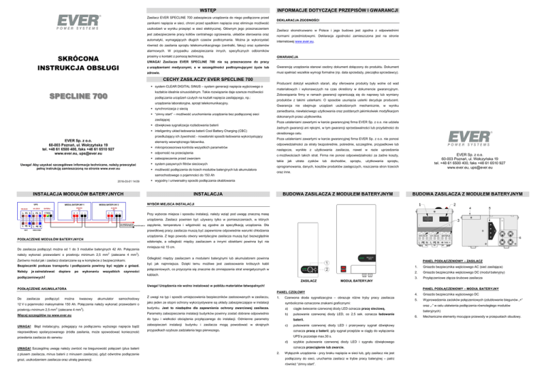 WSTĘP Zasilacz EVER SPECLINE 700 zabezpiecza urządzenia do niego podłączone przed zanikami napięcia w sieci, chroni przed spadkiem napięcia oraz eliminuje możliwość INFORMACJE DOTYCZĄCE PRZEPISÓW I GWARANCJI DEKLARACJA ZGODNOŚCI uszkodzeń w wyniku przepięć w sieci elektrycznej. Głównym jego przeznaczeniem Zasilacz skonstruowano w Polsce i jego budowa jest zgodna z odpowiednimi jest zabezpieczenie pracy kotłów centralnego ogrzewania, układów sterowania oraz normami przedmiotowymi. Deklaracja zgodności zamieszczona jest na stronie automatyki, wymagających długich czasów podtrzymania. Można je wykorzystać internetowej www.ever.eu. również do zasilania sprzętu telekomunikacyjnego (centralki, faksy) oraz systemów alarmowych. W przypadku zabezpieczania innych, specyficznych odbiorników SKRÓCONA INSTRUKCJA OBSŁUGI prosimy o kontakt z pomocą techniczną. GWARANCJA UWAGA! Zasilacze EVER SPECLINE 700 nie są przeznaczone do pracy z urządzeniami medycznymi, a w szczególności podtrzymującymi życie lub Gwarancję urządzenia stanowi osobny dokument dołączony do produktu. Dokument zdrowie. musi spełniać wszelkie wymogi formalne (np. data sprzedaży, pieczątka sprzedawcy). CECHY ZASILACZY EVER SPECLINE 700 system CLEAR DIGITAL SINUS – system generacji napięcia wyjściowego o kształcie idealnie sinusoidalnym. Takie rozwiązanie daje szersze możliwości SPECLINE 700 podłączania urządzeń czułych na kształt napięcia zasilającego, np.: urządzenia laboratoryjne, sprzęt telekomunikacyjny. synchronizacja z siecią “zimny start” – możliwość uruchomienia urządzenia bez podłączonej sieci zasilającej dźwiękowa sygnalizacja rozładowania baterii inteligentny układ ładowania baterii Cool Battery Charging (CBC) przedłużający ich żywotność - nowatorski sposób ładowania wykorzystujący EVER Sp. z o.o. 60-003 Poznań, ul. Wołczyńska 19 tel. +48 61 6500 400, faks +48 61 6510 927 www.ever.eu, [email protected] elementy wewnętrznego falownika. mikroprocesorowa kontrola wszystkich parametrów odporność na przeciążenia zabezpieczenie przed zwarciem system pasywnych filtrów sieciowych Uwaga! Aby uzyskać szczegółowe informacje techniczne, należy przeczytać pełną instrukcję zamieszczoną na stronie www.ever.eu możliwość podłączenia do trzech modułów bateryjnych lub akumulatora samochodowego o pojemności do 150 Ah 2016-03-01 14:09 materiałowych i wykonawczych na czas określony w dokumencie gwarancyjnym. Zobowiązania firmy w ramach gwarancji ograniczają się do naprawy lub wymiany produktów z takimi usterkami. O sposobie usunięcia usterki decyduje producent. Gwarancja nie obejmuje urządzeń uszkodzonych mechanicznie, w wyniku zaniedbania, niewłaściwego użytkowania oraz poddanych jakimkolwiek modyfikacjom dokonanych przez użytkownika. Poza ustaleniami zawartymi w karcie gwarancyjnej firma EVER Sp. z o.o. nie udziela żadnych gwarancji ani rękojmi, w tym gwarancji sprzedawalności lub przydatności do określonego celu. Poza ustaleniami zawartymi w karcie gwarancyjnej firma EVER Sp. z o.o. nie ponosi odpowiedzialności za straty bezpośrednie, pośrednie, szczególne, przypadkowe lub następcze, wynikłe z użytkowania zasilacza, nawet w razie uprzedzenia EVER Sp. z o.o. 60-003 Poznań, ul. Wołczyńska 19 tel. +48 61 6500 400, faks +48 61 6510 927 www.ever.eu, [email protected] o możliwościach takich strat. Firma nie ponosi odpowiedzialności za żadne koszty, takie jak utrata zysków lub dochodów, sprzętu, użytkowania sprzętu, oprogramowania, danych, kosztów produktów zastępczych, roszczenia stron trzecich oraz inne. wygodny i uniwersalny sposób podłączania okablowania 24 miesiące gwarancji INSTALACJA MODUŁÓW BATERYJNYCH Producent dołożył wszelkich starań, aby oferowane produkty były wolne od wad \ Produkt zgodny z CE / Wyprodukowany w Polsce INSTALACJA BUDOWA Z MODUŁEM Produkt zgodny ZASILACZA z CE / Wyprodukowany w PolsceBATERYJNYM BUDOWA ZASILACZA Z MODUŁEM BATERYJNYM WYBÓR MIEJSCA INSTALACJI wyborze 24 miesiące gwarancji Przy miejsca i sposobu instalacji, należy wziąć pod uwagę znaczną masę urządzenia. Zasilacz powinien być używany tylko w pomieszczeniach, w których zapylenie, temperatura i wilgotność są zgodne ze specyfikacją urządzenia. Dla prawidłowej pracy zasilacza muszą być zapewnione odpowiednie warunki chłodzenia urządzenia. Z tego powodu otwory wentylacyjne zasilacza muszą być bezwzględnie PODŁACZENIE MODUŁÓW BATERYJNYCH odsłonięte, a odległość między zasilaczem a innymi obiektami powinna być nie Do zasilacza podłączyć można od 1 do 3 modułów bateryjnych 42 Ah. Połączenia należy wykonać przewodami o przekroju minimum 2,5 mm 2 (zalecane 4 mm ). Zarówno moduł jak i zasilacz dostarczane są w komplecie z bezpiecznikami. Bezpieczniki podczas transportu i podłączania powinny być wyjęte z gniazd. Należy je zainstalować dopiero po wykonaniu mniejsza niż 15 cm. 2 wszystkich czynności Odległość między zasilaczem a modułami bateryjnymi lub akumulatorem powinna PANEL PODŁĄCZENIOWY – ZASILACZ być jak najmniejsza. Dzięki temu możliwe jest zastosowanie krótszych kabli połączeniowych, co przyczynia się znacznie do zmniejszenia strat energetycznych w kablach. podłączeniowych! ZASILACZ zasilacza podłączyć można PANEL CZOŁOWY kwasowy akumulator samochodowy 12 V o pojemności maksymalnie 150 Ah. Połączenia należy wykonać przewodami o przekroju minimum 2,5 mm2 (zalecane 4 mm2). Więcej szczegółów na www.ever.eu Z uwagi na typ i sposób umiejscowienia bezpieczników zastosowanych w zasilaczu, 1. Czerwona dioda sygnalizacyjna – obrazuje różne tryby pracy zasilacza jako jeden ze stopni ochrony wykorzystywane są układy zabezpieczające w instalacji symbolicznie oznaczone znakami graficznymi: budynku. Jest to niezbędne dla zapewnienia ochrony zwarciowej zasilacza. a) ciągłe świecenie czerwonej diody LED ozna