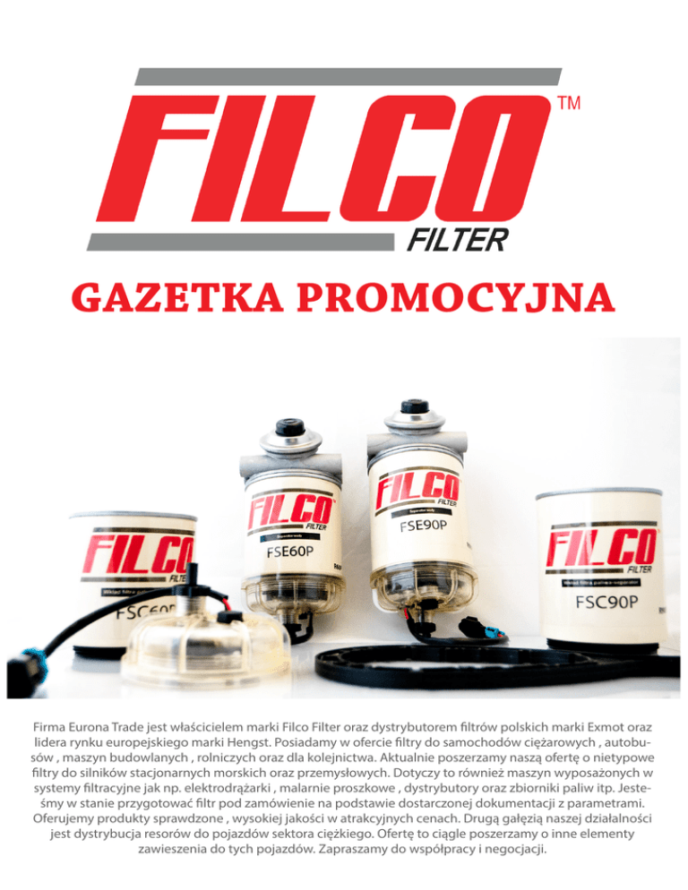 GAZETKA PROMOCYJNA Firma Eurona Trade jest właścicielem marki Filco Filter oraz dystrybutorem filtrów polskich marki Exmot oraz lidera rynku europejskiego marki Hengst. Posiadamy w ofercie filtry do samochodów ciężarowych , autobusów , maszyn budowlanych , rolniczych oraz dla kolejnictwa. Aktualnie poszerzamy naszą ofertę o nietypowe filtry do silników stacjonarnych morskich oraz przemysłowych. Dotyczy to również maszyn wyposażonych w systemy filtracyjne jak np. elektrodrążarki , malarnie proszkowe , dystrybutory oraz zbiorniki paliw itp. Jesteśmy w stanie przygotować filtr pod zamówienie na podstawie dostarczonej dokumentacji z parametrami. Oferujemy produkty sprawdzone , wysokiej jakości w atrakcyjnych cenach. Drugą gałęzią naszej działalności jest dystrybucja resorów do pojazdów sektora ciężkiego. Ofertę to ciągle poszerzamy o inne elementy zawieszenia do tych pojazdów. Zapraszamy do współpracy i negocjacji. WIOSENNA PROMOCJA!!! Filtry kabinowe chronią zdrowie. Bardzo istotnym problemem dla kierowców samochodów ciężarowych i autobusów, poruszających się zawodowo po drogach jest stałe wdychanie pyłków roślin, kurzu, ozonu i spalin. Nagromadzenie tych zanieczyszczeń w kabinie pojazdu wpływa na obniżenie zdolności koncentracji, opóźnienia w reakcji na sytuacje na drodze, powoduje senność. Może tez wpływać na wzrost agresywności kierowcy wobec otoczenia. Czyste powietrze w kabinie obniża ryzyko spowodowania wypadku i zwiększa znacznie odporność kierowcy, zwłaszcza kiedy cierpi on na alergie lub astmę. Wydatnie poprawia samopoczucie oraz komfort pracy kierowcy. Temat czystości powietrza w kabinie samochodu jest również w centrum uwagi producentów samochodów ciężarowych i autobusów, którzy przywiązują coraz większą wagę do konstrukcji klimatyzacji w produkowanych przez siebie samochodach, jak również zwracają baczną uwagę na szczególnie wydajne filtry kabinowe. Oferowane przez nas filtry kabinowe redukują niemal do zera ilość pyłków i innych niepożądanych cząsteczek zanieczyszczeń, które przedostają się przez dmuchawę powietrza do wnętrza samochodu. Nie trzeba już dzisiaj wspominać o tym, jak bardzo ważne są te filtry dla alergików i jak efektywnie mogą one chronić przed wysoką koncentracją alergenów w kabinie samochodu, czy autobusu. Mamy wiosnę a więc okres intensywnego pylenia roślin tym bardzie polecamy okresową wymianę filtrów kabinowych. PRACODAWCO - zadbaj o zdrowie , bezpieczeństwo i komfort pracy Twoich kierowców !! Serdecznie zapraszamy do skorzystania z naszej wiosennej promocji !! FSE90P FSE60P 155,00 zł 135,00 zł Separator Filco Kompletny z pompką i grzałką uniwersalny zamiennik dla R90P FILCO FILTER ul. Koronowska 97 85-405 Bydgoszcz Separator Filco Kompletny z pompką i grzałką uniwersalny zamiennik dla R60P www.filco.pl WK-851 WK-854 24,90 zł 33,20 zł Wkład Filtra Kabinowy M.A.N. nr OE 81.61910.0011 WK-852 WK-856 31,50 zł 63,00 zł Wkład Filtra Kabinowy Scania P/G/R/T/4 nr OE 1420197 Wkład Filtra Kabinowy Volvo / Bus nr OE 20746873 WK-850 WK-855 19,90 zł 23,90 zł Wkład Filtra Kabinowy Volvo/FH/FM/FMX nr OE 8143691 FILCO FILTER ul. Koronowska 97 85-405 Bydgoszcz Wkład Filtra Kabinowy M.A.N. nr OE 81.61910.0018 Wkład Filtra Kabinowy Mercedes Actros nr OE 000 830 1118 www.filco.pl WK-853 WPO-919 29,40 zł 215,70 zł Wkład Filtra Kabinowy DAF/XF105/XF95/CF85 nr OE 1322255 Filtr powietrza Exmot Volvo nr OE 3181986 WPO-402 WPO-722FR 104,60 zł 179,30 zł Filtr powietrza Exmot DAF nr OE 1353115 Filtr powietrza Exmot Scania nr OE 1421022 WPO-569 126,40 zł Flitr powietrza Exmot Volvo nr OE 8149961 FILCO FILTER ul. Koronowska 97 85-405 Bydgoszcz www.filco.pl 236019 790604 795,00 zł Resor MFT nr OE 521,00 zł Resor MFT Schmitz ne OE M001480 886167 901280 520,00 zł Resor MFT SAF nr OE 3155103602 881564 382,00 zł Resor MFT BPW nr OE 0508213880 750,00 zł Resor MFT Scania nr OE 1377668 901992 890,00 zł Resor MFT Scania nr OE 1421061 Okres trwania promocji do 31.07.2015 lub do wyczerpania zapasów. SERDECZNIE ZAPRASZAMY FILCO FILTER ul. Koronowska 97 85-405 Bydgoszcz www.filco.pl