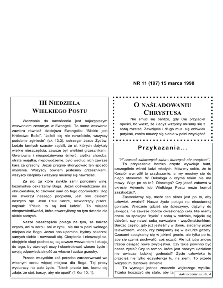 NR 11 (197)/1 PO GÓRACH, DOLINACH... 15 marca 1998 r. NR 11 (197) 15 marca 1998 III NIEDZIELA WIELKIEGO POSTU Wezwanie do nawrócenia jest najczęstszym wezwaniem zawartym w Ewangelii. To samo wezwanie zawiera równieŜ dzisiejsza Ewangelia: “Bliskie jest Królestwo BoŜe”. “JeŜeli się nie nawrócicie, wszyscy podobnie zginiecie” (Łk 13,3), ostrzegał Jezus śydów. Ludzie tamtych czasów sądzili, Ŝe ci, których dotykały wielkie nieszczęścia, zawsze byli wielkimi grzesznikami. Gwałtowna i niespodziewana śmierć, cięŜka choroba, utrata majątku, niepowodzenie, było według nich zawsze karą za grzechy. Jezus pragnie skorygować ten sposób myślenia. Wszyscy bowiem jesteśmy grzesznikami, wszyscy cierpimy i wszyscy musimy się nawracać. Za zło, za które zwykle sami ponosimy winę, bezmyślnie oskarŜamy Boga. JeŜeli doświadczamy zła, okrucieństwa, to człowiek sam do tego doprowadził. Bóg nie stworzył naszego podpiekła, jest ono dziełem naszych rąk. Jean Paul Sartre, niewierzący pisarz, napisał: “Piekło to są inni ludzie”. To miejsca niesprawiedliwości, które stworzyliśmy na tym świecie dla siebie samych. Nasze nieszczęście polega na tym, Ŝe bardzo często, ani w sercu, ani w Ŝyciu, nie ma w pełni wolnego miejsca dla Boga. Jezus nas upomina, byśmy oskarŜali samych siebie i nawracali się. Cierpienia i nieszczęścia, obojętnie skąd pochodzą, są zawsze wezwaniem i okazją do tego, by otworzyć oczy i skontrolować własne Ŝycie i swoją odpowiedzialność za własne i cudze grzechy. Przede wszystkim zaś porzeba zarezerwować we własnym sercu więcej miejsca dla Boga. Tej pracy wystarczy na całe Ŝycie. “Niech przeto ten, komu się zdaje, Ŝe stoi, baczy, aby nie upadł” (1 Kor 10, 1). O NAŚLADOWANIU CHRYSTUSA Nie smuć się bardzo, gdy Cię przyjaciel opuści, bo wiesz, Ŝe kiedyś wszyscy musimy się z sobą rozstać. Zawzięcie i długo musi się człowiek potykać, zanim nauczy się siebie w pełni zwycięŜać Przykazania... “W czasach zakazanych zabaw hucznych nie urządzać”. To przykazanie bardzo często wywołuje bunt, szczególnie wśród ludzi młodych. Mówimy sobie, Ŝe to Kościół wymyślił to przykazanie, a my musimy się do niego stosować. W Dekalogu o czymś takim nie ma mowy. Więc po co to?. Dlaczego? Czy jakaś zabawa w okresie Adwentu lub Wielkiego Postu moŜe komuś zaszkodzić?. Zastanówmy się, moŜe ten okres jest po to, aby człowiek zwolnił? Nasze Ŝycie polega na nieustannej gonitwie. Wiecznie gdzieś się śpieszymy, dąŜymy do jakiegoś, nie zawsze dobrze określonego celu. Nie mamy czasu na spokojne ”bycie” z sobą w rodzinie, zajęcie się dziećmi, czy nawet sobą nawzajem - współmałŜonkiem. Bardzo często, gdy juŜ jesteśmy w domu, siadamy przed telewizorem, wideo, czy zatapiamy się w lekturze gazety. Czasami spotykamy się w jakimś gronie, ale tylko po to, aby się czymś pochwalić, coś uczcić. Ale juŜ jutro znowu trzeba osiągać nowe zwycięstwa. Czy takie powinno być nasze Ŝycie? Czy to tempo, które jest naszym udziałem nie uwłacza ludzkiej godności? śycie człowieka to przecieŜ nie tylko egzystencja tu, na ziemi. To przede wszystkim duchowe istnienie. To wymaga jednak znacznie większego wysiłku. Trzeba troszczyć się stale, aby ta dokończenie na str. 4 NR 11 (197)/2 PO GÓRACH, DOLINACH... 15 marca 1998 r. CO ROBIĆ DALEJ?! ZbliŜa się okres, w którym młodzieŜ klas ósmych musi podjąć decyzję dotyczącą wyboru szkoły. Często jest tak nie zdecydowana, Ŝe to my dorośli - rodzice lub dziadkowie - musimy im pomóc w dokonaniu tego wyboru. Na ogół młodzieŜ mająca zamiar podjąć szybciej pracę wybiera szkoły zasadnicze zawodowe lub technikum. Problem trudniejszy jest, jeŜeli chodzi o tych młodych ludzi, którzy mają zamiar w przyszłości studiować. Wiadomo, Ŝe aby dostać się na studia naleŜy wcześniej ukończyć dobrą szkołę średnią. I tu zaczynają się schody. Która ze znajdujących się w naszym regionie szkół jest naprawdę dobra? Gdzie młodzieŜ w najmniejszym stopniu naraŜona jest na kontakt z narkotykami? Gdzie wiedza zostanie najlepiej i najrzetelniej przekazana? Gdzie będzie zwracana uwaga na wychowanie młodzieŜy wg wartości chrześcijańskich? We września ub. roku rozpoczęło działalność Katolickie Liceum Ogólnokształcące im. M. Grodzieckiego w Cieszynie. Programowo oparte jest ono na Liceum prowadzonym przez OO. Pijarów w Krakowie. Ale tylko programowo. I szkoda! Szkoły pijarskie zwane Szkołami PoboŜnymi zostały załoŜone 400 lat temy przez św. Józefa Kalasancjusza. Wspominam o tym dlatego, iŜ były to szkoły poświęcone całkowicie bezpłatnemu wychowaniu dzieci i młodzieŜy! Nie ulega wątpliwości, Ŝe to, co zrobił Kalasancjusz w tamtych latach, było genialne. Historia teŜ to tak określiła. KaŜde społeczeństwo docenia szkołę i wszystkie rządy, partie i grupy pragną ją sobie podporządkować. Józef Kalasancjusz zauwaŜył, Ŝe “reforma świata chrześcijańskiego dokonuje się poprzez sumienne wypełnianie misji nauczania. Dobre wychowanie młodzieŜy jest najskuteczniejszym środkiem zachowania i uzdrowienia ze zła, a wprowadzenia i oświecenia dobrem. Od niego zaleŜy pokój i pomyślność narodów... i ostatecznie reforma całego chrześcijaństwa, poniewaŜ naucza dobrze Ŝyć”. Twierdził, Ŝe szkoła powinna być obowiązkowa i bezpłatna dla wszystkich dzieci, gdyŜ tylko wtedy będą one miały szansę zrównania się z bogatymi. Starał się, o rozszerzenie horyzontów intelektualnych wychowanków. Dzięki swojemu programowi osiągnął to, iŜ jego uczniowie mogli nawet kontynuować studia, co wcześniej było absolutnie nierealne. Dzisiaj teoretycznie nauczanie zarówno na poziomie podstawowym i średnim odbywa się bezpłatnie. Wszyscy jednak wiemy, jakimi kosztami są obciąŜeni rodzice. A co w zamian za to szkoła oferuje przepełnione klasy, 